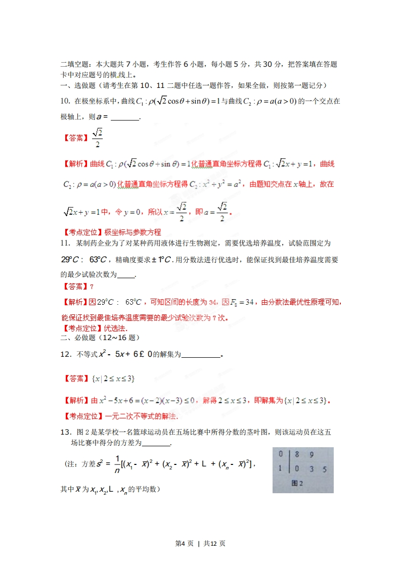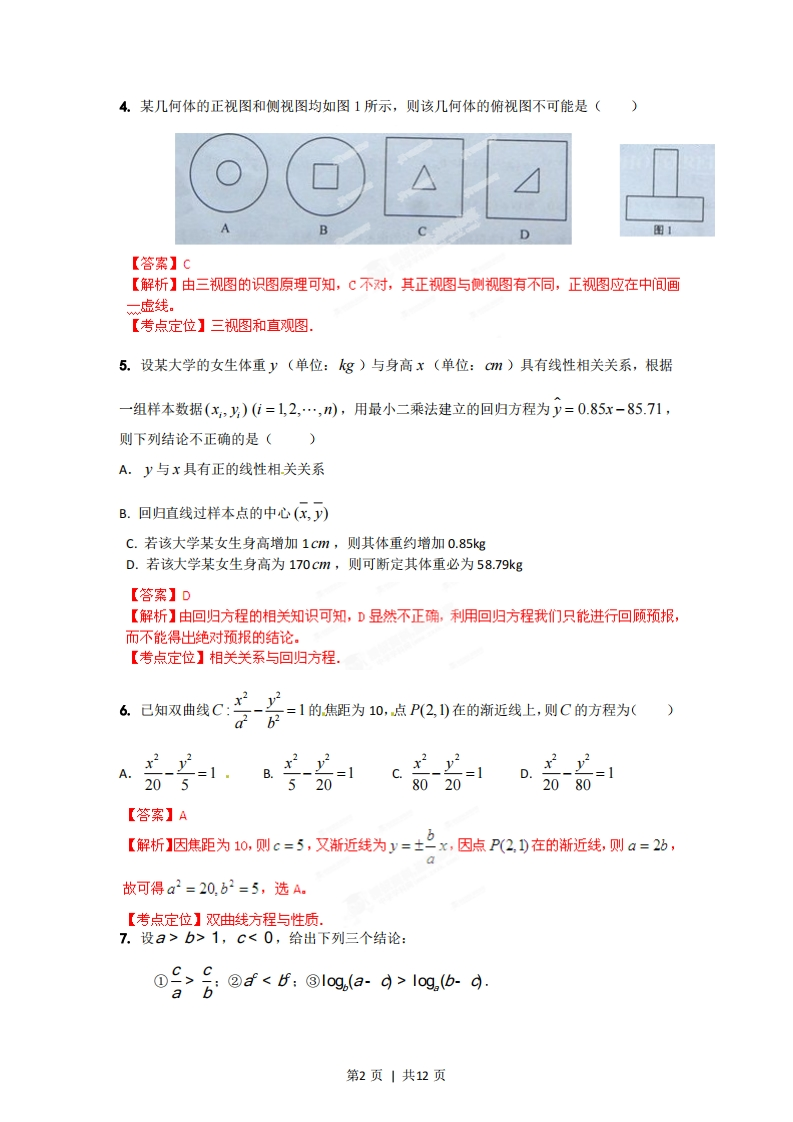 2012年普通高等学校招生全国统一考试(湖南卷)数学文科本试题卷包括选择题、填空题和解答题三部分,共6页,时量120分钟,满分150分。试卷总评:总体米说2012湖南文科数学试题相对于2010,2011维持的稳定的命题趋势,试题注重层次叠进,沿用了2011的命题思路,文理同题,注重了对文理科考试内容和层次差别的处理。选择题、填空题的布局合理,注重对考生基础知识,基本技能的全面考查,为学生的能力考查提供了一个良好的环境。总体来说,试卷有利于课改,有利于中学教学,有利于高校选拔人才。一选择题:本大题共9小题,每小题5分,共45分,在每小题给出的四个选项中,只有一项符合题目要求的。1.设集合M={1,0,1},N={x|x2=x},,则MCN=()A.{-1,0,1B.{0,1}C.)D.{0【答案】B【解析】因N={xx2=x}={0,1},故M∩N={0,1},选B.【考点定位】集合的运算2.复数z=i(i+1)(i为虚数单位)的共轭复数是()A.-1-iB.-1+ic.1-iD.1+i【答案】A【解析】因为z=2+i=-1+i,所以z=-1-i,选A【考点定位】复数的概念与运算3.命题“若=乃,则a=1”的逆否命题是()A.若d≠二,则tand≠1B.若a=二,则tana≠144c若tam≠1,则a≠四D.若tama≠1,则=44【答案】C【解析】逆否命题需将原命题的条件和结论同时否定,并交换位置,故可知选C.【考点定位】四种命题第1页|共12页4.某几何体的正视图和侧视图均如图1所示,则该几何体的俯视图不可能是()D【答案】C【解析】由三视图的识图原理可知,C不对,其正视图与侧视图有不同,正视图应在中间画一虚线。【考点定位】三视图和直观图,5.设某大学的女生体重y(单位:kg)与身高x(单位:c)具有线性相关关系,根据一组样本数据(x,)(1=1,2,…,n),用最小二乘法建立的回归方程为y=0.85x-85.71,则下列结论不正确的是()A.y与x具有正的线性相关关系B.回归直线过样本点的中心(x,y)C.若该大学某女生身高增加1cm,则其体重约增加0.85kgD.若该大学某女生身高为170cm,则可断定其体重必为58.79kg【答案】D【解析】由回归方程的相关知识可知,D显然不正确,利用回归方程我们只能进行回顾预报,而不能得出绝对预报的结论。【考点定位】相关关系与回归方程,&,已知双曲线C:-上:京京=1的焦距为10,点P2)在的渐近线上,则C的方程为()A.=1。-c=205520802020801【答案】A【解析1因焦距为10,则c=5,又渐近线为y=±2x,因点P(2,)在的渐近线,则a=2b,故可得a2=20,b2=5,选A。【考点定位】双曲线方程与性质,7.设a>b>1,C<0,给出下列三个结论:D号>6②f