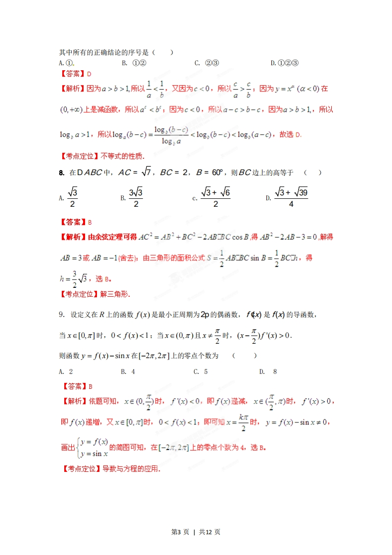 1g,b-g第2页|共12页其中所有的正确结论的序号是()A.①.B.①②C.②③D.①②③【答案】D【解析】因为a>b>1所以上<,又因为c<0,所以二>二,因为y=(<0)在a b(0,+0)上是减函数,所以a°b-c,因为a>b>1,所以1og,a>1,所以1og.(6-c)_1og6-9<1og,6-c)0.则函数y=f(x)-sinx在[-2π,2π]上的零点个数为()A.2B.4C.5D.8【答案】B【解析】依题可知,x∈0,时,f)<0,即f()温减,x∈(任,π)时,f"()>0,即f(的递增,又xe0,可时,0