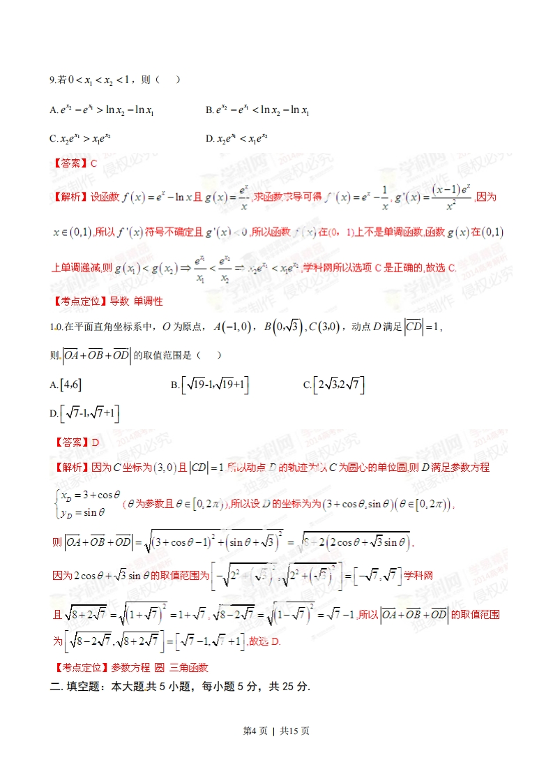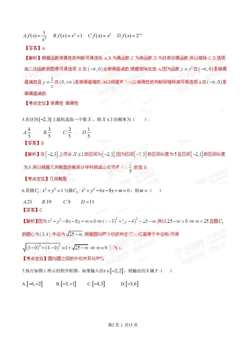 2014年普通高等学校招生全国统一考试(湖南卷)数学(文)一.选择题:本大题共10小题,每小题5分,共50分.在每小题给出的四个选项中,只有一项是符合题目要求的.1.设命题p:xeR,x2+1>0,则p为()A.3x。∈R,x6+1>0B.3x∈R,x6+1≤0C.3x。∈R,x+1<0D.x∈R,x2+1≤0【答案】B双必究【解析】全称命题的否定是特称命题所以命颗p的定为3x∈R,x5+1≤0,故选B.【考点定位】命题否定全称命题特称题2.己知集合A={x|x>2},B={x|12}B.{x|x>1}·C.{x|20→m<25且圆C,的圆心为(3,4),半径为√25-m根据圆与厚外切的判定:,E离等于半径和)可得V3-0)2+(4-0)2=1+V25-m→m=9故生C学【考点定位】圆与圆之间的外切关系与独家制作侵权必7.执行如图1所示的程序框图,如果输入的t∈[-2,2],则输出的S属于()A.[-6,-2]B[-5,-1]c.[-4,5]D.[-3,6]第2页|共15页r始是1<0?1▣22+1S=1-3输出S家制作结束四:【答案】D【解析】当te[-2,0)时运行程序如下,t=2r+1e19],S=t-3∈(-2,6当te[0,2]时S=t-3[-3,-1则S∈(-2.6小U「-3,-=[-3,6]*选D【考点定位】程序框图二次函数8.一块石材表示的几何体的三视图如图2所示,将石材切削、打磨、加工成球,则能得到的最大球的半径等于()A.1B.2C.3D.4正✉刻视图12俯视圆图2【答案】B【解析】由图可得该几何体为三棱柱因头正视图议图俯视图的内切圆半径最小的是正视图(直角三角形所对应的内切圆所以最大球的半径为正视图直角三角形本切2的半径?,则8-r+6-r=V⑧2+62→r=2故选B【考点定位】三视图内切圆球三棱柱第3页|共15页