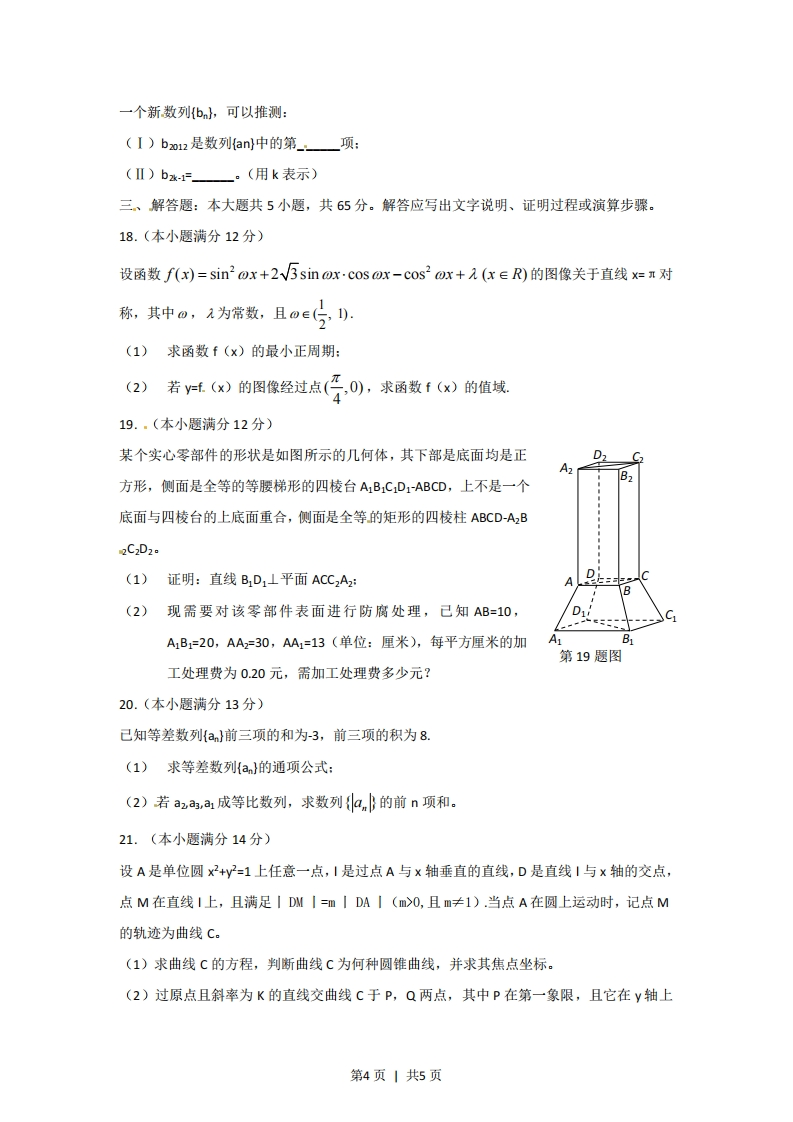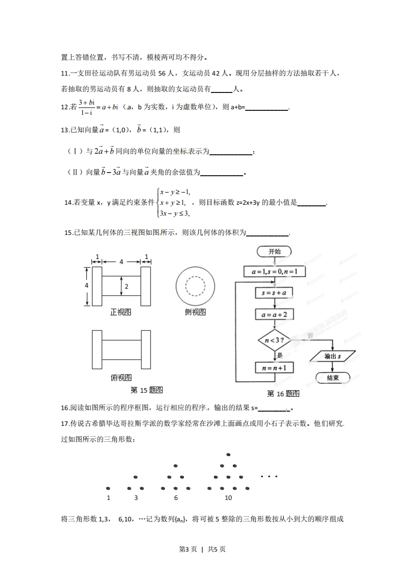 2012年高考湖北文科数学试卷解析(学生版)选择题:本大题共10小题,每小题5分,共50分,在每小题给出的四个选项中,只有一项是符合题目要求的1.己知集合A=xx2-3x+2=0,x∈R},B=x0B>C,3b=20 acosA,则sinA:sinB:sinC为()A.4:3:2B.5:6:7C.5:4:3D.6:5:49设ab,c∈R,则.“abc=1”是“↓+L+1入石石+E≤a+b+c”的()A.充分条件但不是必要条件,B必要条件但不是充分条件C.充分必要条件D.既不充分也不必要的条件10.如图,在圆心角为直角的扇形OAB中,分别以OA,OB为直径作两个半圆。在扇形OAB内随机取一点,则此点取自阴影部分的概率是(第10题图A112元c.1-303ππ二、填空题:本大题共7小题,每小题5分,共35分。请将答案填在答题卡对应题号的位第2页丨共5页置上答错位置,书写不清,模棱两可均不得分。11.一支田径运动队有男运动员56人,女运动员42人。现用分层抽样的方法抽取若干人,若抽取的男运动员有8人,则抽取的女运动员有一人。12.若3+b=a+bi(a,b为实数,i为虚数单位),则a+b=1-i13.已知向量a=(1,0),b=(1,1),则(I)与2a+b同向的单位向量的坐标表示为(Ⅱ)向量b-3a与向量a夹角的余弦值为x-y2-114.若变量×,y满足约束条件x+y≥1,,则目标函数=2x+3y的最小值是3x-y≤3,15.己知某几何体的三视图如图所示,则该几何体的体积为开始一4a=1,5=0,n=1s=s+a正视图侧视图a=a+2n<3?输出5n=n+l俯视图结束第15题图第16题图16.阅读如图所示的程序框图,运行相应的程序,输出的结果s=17.传说古希腊毕达哥拉斯学派的数学家经常在沙滩上面画点或用小石子表示数。他们研究过如图所示的三角形数:10将三角形数1,3,6,10,…记为数列{n},将可被5整除的三角形数按从小到大的顺序组成第3页1共5页