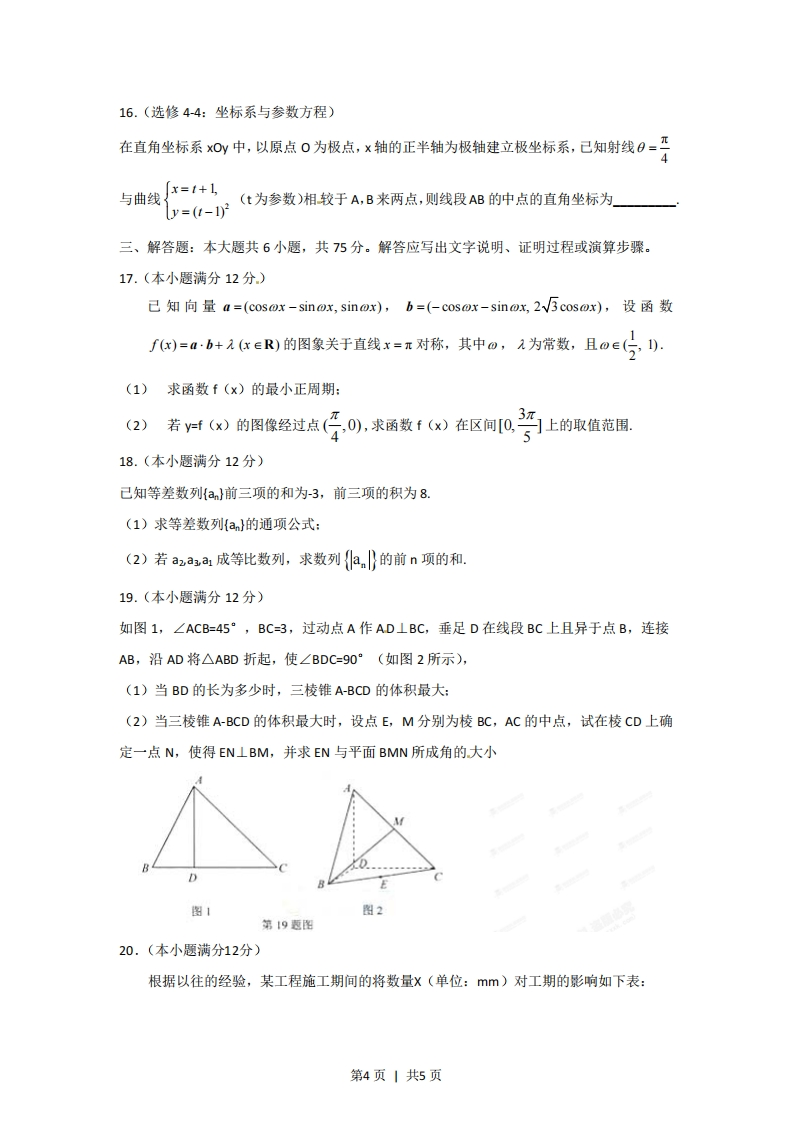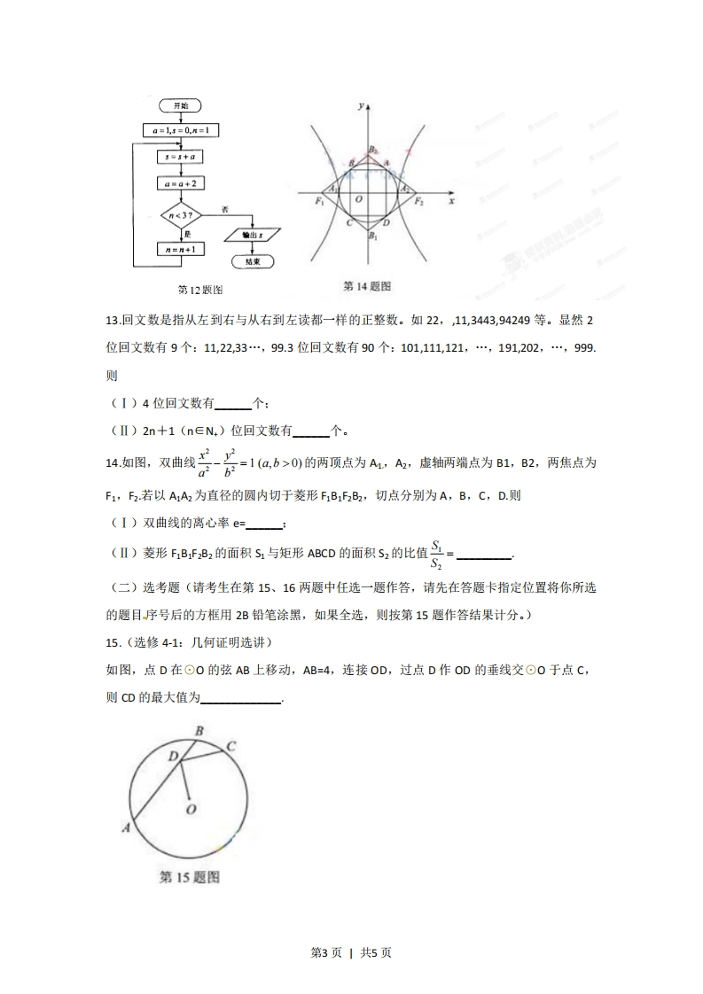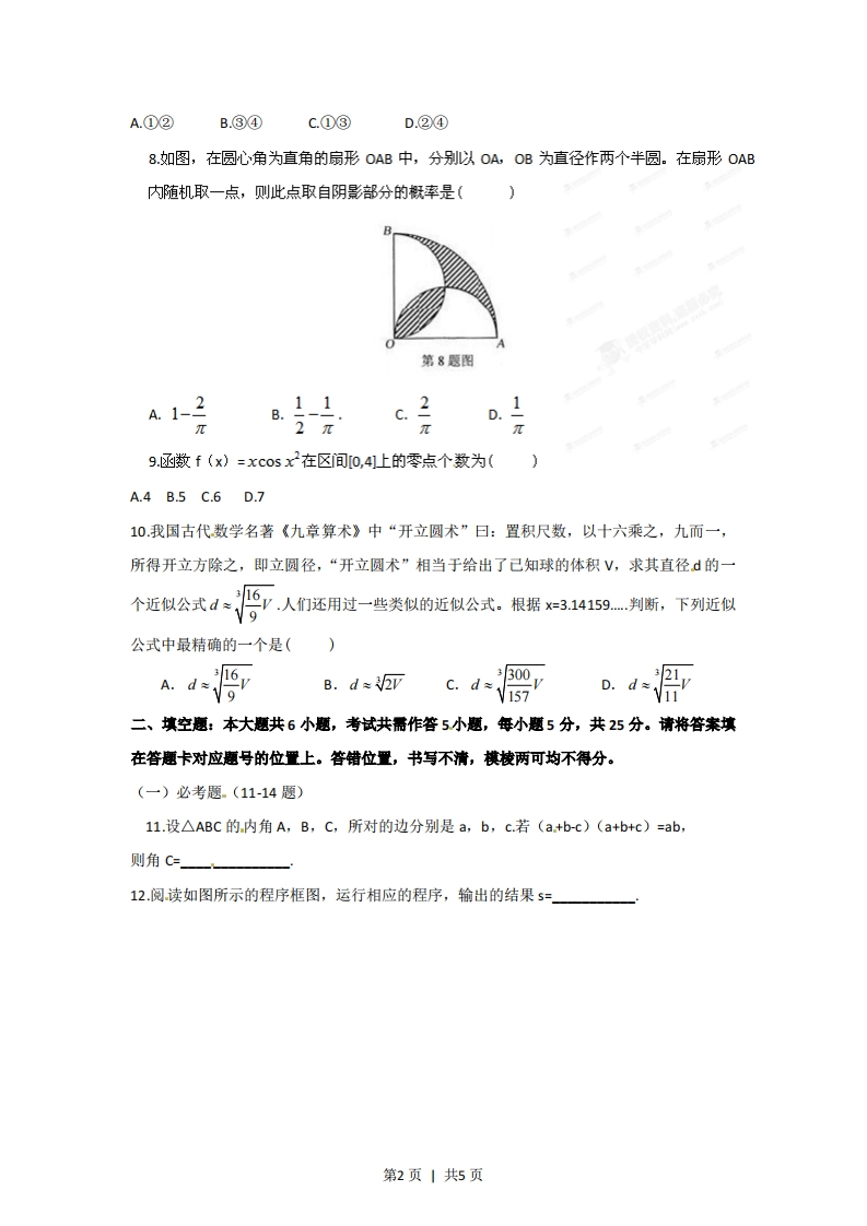 2012年高考湖北理科数学试卷解析(学生版)选择题:本大题共10小题,每小题5分,共50分,在每小题给出的四个选项中,只有一项是符合题目要求的1.方程x2+6x+13=0的一个根是()A-3+2iB3+2iC-2+3iD2+3i2.命题“3o∈CQ,x∈Q”的否定是()A3 XoCRQ,无∈QB3o∈CQ,xtQC VxoCRQ,G∈QDVx∈CQ,GQ3.己知二次函数y=x)的图像如图所示,则它与X轴所围图形的面积为()第3题图43B.D.32正视图侧视图4.已知某几何体的三视图如图所示,则该几何体的体积为8π10πA.B.3πC.D.6元335.设a∈Z,且0≤a≤13,若5122+a能被13整除,则a=()俯视图第4题图A.0B.1C.11D.126.设a,b.cxY.z是正数,且+b4c2=10,x24y+2-40,ax+by+c2=20,则a+b+C=(x+y+z-D.7.定义在(-∞,0)U(0,+∞)上的函数f(x),如果对于任意给定的等比数列{an},{什(an)}仍是等比数列,则称f(x)为“保等比数列函数”。现有定义在(-∞,0)U(0,+∞)上的如下函数:①f(x)=x:②f(x)=2%:③/)=风,④f(x)=nlx1.则其中是“保等比数列函数”的f(x)的序号为()第1页1共5页A.①②B.③④c.①③D.②④8如图,在圆心角为直角的扇形OAB中,分别以OA,OB为直径作两个半圆。在扇形OAB内随机取一点,则此点取自阴影部分的概率是(第8愿图A.1-2811c.2D.π2π9.函数f(x)=xcos x2在区间0,4上的零点个数为(A.4B.5C.6D.710我国古代数学名著《九章算术》中“开立圆术”曰:置积尺数,以十六乘之,九而一,所得开立方除之,即立圆径,“开立圆术”相当于给出了己知球的体积V,求其直径d的一个近似公式d≈.人们还用过一些类似的近似公式。根据x=3.14159判断,下列近似9公式中最精确的一个是(B.d≈2丽二、填空题:本大题共6小题,考试共需作答5.小题,每小题5分,共25分。请将答案填在答题卡对应题号的位置上。答错位置,书写不清,模棱两可均不得分。(一)必考题.(11-14题)11.设△ABC的.内角A,B,C,所对的边分别是a,b,c.若(a+b-c)(a+b+c)=ab,则角C=12.阅读如图所示的程序框图,运行相应的程序,输出的结果5=」第2页|共5页开始a=a+2月=+】第12题图第14题图13.回文数是指从左到右与从右到左读都一样的正整数。如22,,11,3443,94249等。显然2位回文数有9个:11,22,33…,99.3位回文数有90个:101,111,121,…,191202,…,999.则(I)4位回文数有个:(Ⅱ)2n十1(n∈N,)位回文数有_个。14如图,双商线号-茶-1a6>0的两项点为AA,度轴病编点为B,B2,两白为F1,F2.若以A1A2为直径的圆内切于菱形F1B1FzB2,切点分别为A,B,C,D.则(I)双曲线的离心率e=(Ⅱ)菱形FB,FB2的面积S1与矩形ABCD的面积52的比值S=S2(二)选考题(请考生在第15、16两题中任选一题作答,请先在答题卡指定位置将你所选的题目序号后的方框用2B铅笔涂黑,如果全选,则按第15题作答结果计分。)15.(选修4-1:几何证明选讲)如图,点D在⊙0的弦AB上移动,AB=4,连接OD,过点D作OD的垂线交⊙O于点C,则CD的最大值为BD第15题图第3页丨共5页