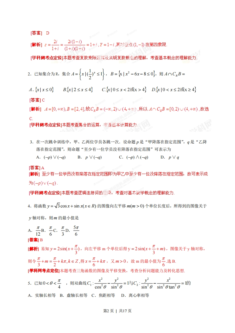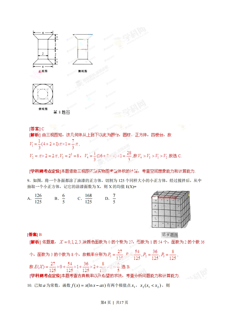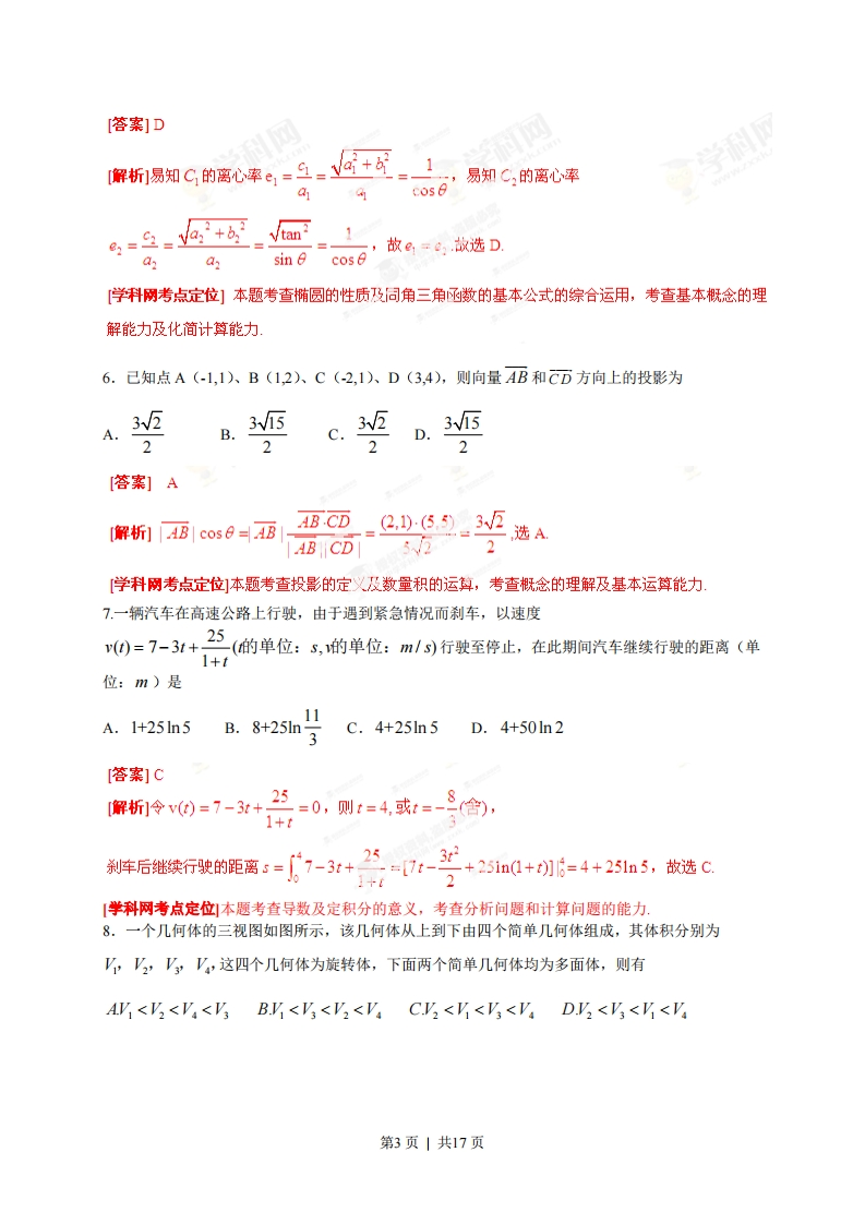 0)个单位长度后,所得到的图像关于y轴对称,则m的最小值是D.Sz66答案B解析1易知y=2sin(x+),向左平移m个单位后得y=2si(x+花+m),图像关于y轴对称,33则令交+m=交+k元,k∈Z,得x=严+kπ,又m>0,故m的最小值为艺选B366[学科网考点定位本题考查三角函数的图像及平移变换,考查分析问题能力及转化思想,5.已知0<0<牙,则双曲线C4cos20sin291与C2=的sin0 sin20tan20A.实轴长相等B.虚轴长相等C.焦距相等D.离心率相等第2页|共17页[答案]D解析易知℃的离心率e,=9=Y回+1学耐易知C,的离心率acoseytan1。,故g=g,故选Daasine cos[学科网考点定位]本题考查椭圆的性质及同角三角数的基本公式的综合运用,考查基本概念的理解能力及化简计算能力6.己知点A(-1,1)、B(1,2)、C(-2,1)、D(3,4),则向量AB和CD方向上的投影为A.33W152c.5D.3[答案]A[解析]4B cos6AB4BCD(2,1)(5.5)3万选AAB CD5w22[学科网考点定位]本题考查投影的定义及数量积的运算,考查概念的理解及基本运算能力,7.一辆汽车在高速公路上行驶,由于遇到紧急情况而刹车,以速度25v(①=7-31+2(的单位:3,的单位:m/)行驶至停止,在此期间汽车继续行驶的距离(单1+t位:m)是A.1+25ln51B.8+25ln3C.4+25ln5D.4+50ln2[答案]C解折1令v0=7-3+25=0,则1=4,或:=-8含,1+t裤后维续行驶的距离:=广7-3+-71-号+2511+9列=4+25n5,散选C1十t2[学科网考点定位]本题考查导数及定积分的意义,考查分析问题和计算问题的能力8.一个几何体的三视图如图所示,该几何体从上到下由四个简单几何体组成,其体积分别为V,V,V,V,这四个几何体为旋转体,下面两个简单几何体均为多面体,则有A",<'