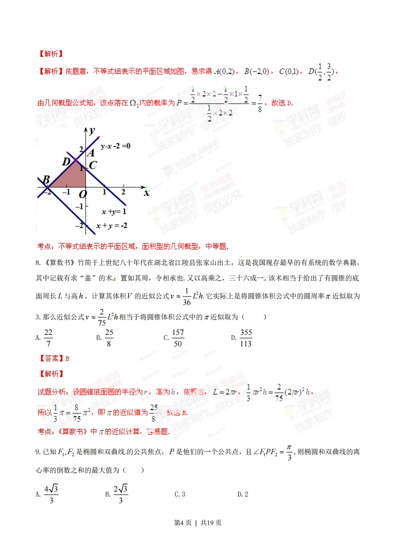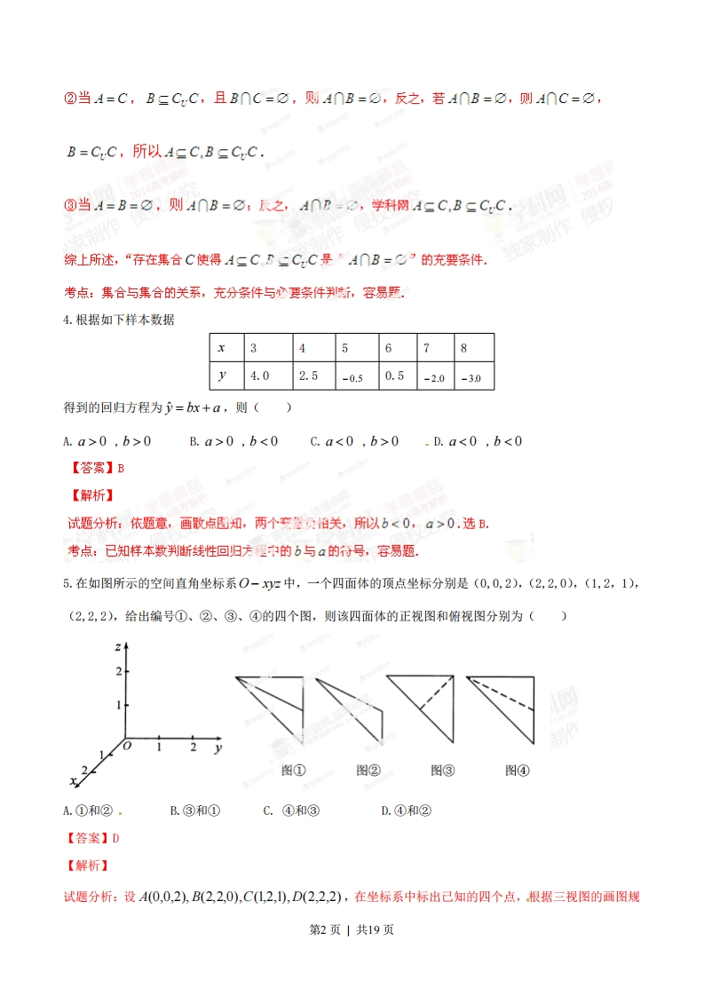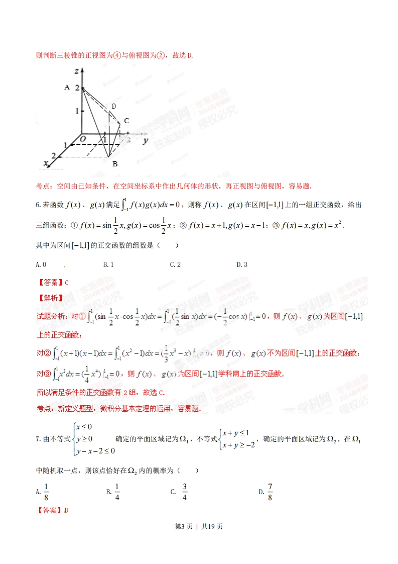 2014年普通高等学校招生全国统一考试(湖北卷)数学(堙科)一.选择题:本大题共10小题,每小题5分,共50分.在每小题给出的四个选项中,只有一项是符合题目要求的。1.i为虚数单位,则马2=()I+iA.-1B.1D.i【答案】A【解析】试题分析:因为21-1、字科网故选A.考点:复数的运算,容易题12.若二项式(2x+4)7的展开式中三的系数是84,则实数a=()A.2B.4C.1D.【答案】c014014【解析】权必试题分析:因为C(29(色)=C2'a,令-7+2r=-3,得r=2,所以C.22a2=84,解得a=1,故4c.学科网考点:二项式定理的通项公式,容刀题,3.设U为全集,A,B是集合,则“存在集合C使得A二C,B二CvC是“A∩B=☑”的()A.充分而不必要条件B.必要而不充分条件C.充要条件D.既不充分也不必要条件【答案】C【解析】试题分析:①当AcC,BSC,C,且B∩C=O,则A∩B=O,反之当A∩B=O,必有ASC,B∈CC第1页|共19页②当A=C,B三CC,且B∩C=②,则A∩B=⊙,反之,若A∩B=②,则A∩C=②,B=CC,所以A三C,B三CC.③当A=B=⑦,则A∩B=⑦,长之,AnD-2,学科刚A三C,BGC。》】72014独家制作侵权综上所述,“存在集合C使得A三CB三C,C是“A∩B=心”的充要条件.考点:集合与集合的关系,充分条件与心要条件判断,容易4.根据如下样本数据X3456784.02.5-0.50.5-2.0-3.0得到的回归方程为)=bx+a,则(A.a>0,b>0B.a>0,b<0C.a<0,b>0.D.a<0,b<0【答案】B【解析】试题分析:依题意,画散点圈知,两个交怕关,所以b<0,a>0,选B.考点:已知样本数判断线性回归方程中的b与α的行号,容易题.5.在如图所示的空间直角坐标系0-)z中,一个四面体的顶点坐标分别是(0,0,2),(2,2,0),(1,2,1),(2,2,2),给出编号①、②、③、④的四个图,则该四面体的正视图和俯视图分别为()22图①图②图③图④A.①和②.B.③和①C.④和③D.④和②【答案】D【解析】试题分析:设A(0,0,2),B(2,2,0),C(1,2,1),D(2,2,2),在坐标系中标出己知的四个点,根据三视图的画图规第2页|共19页则判断三棱锥的正视图为④与俯视图为②,故选D.家料作侵权必究B考点:空间由己知条件,在空间坐标系中作出几何体的形状,再正视图与俯视图,容易题.6.若函数fx)、g(x)满足fx)g(x)d=0,则称fx)、g(x)在区间[-1,]上的一组正交函数,给出1三组函数:①f(x)=sin5x,g(x)=cos5x:②fx)=x+l,g(x)=x-1:③f(x)=x,g(x)=x2.其中为区间[-1,1]的正交函数的组数是()A.0B.1C.2D.3【答案】C【解析】试题分折对0c恤xco9a-血9=(←co9-0,侧0e0、g6的为8间-1山上的正交函数,对O(x+(x-1水=(x2-0=(5x-x),则f6)、g)不为区间[-1]上的正交函数,对国xc=(x=0,则f、gx,为区间[-1]学科网上的正交函藏所以满足条件的正交函数有2组,故选C4考点:新定义题型,微积分基本定理的运用,容易赵.侵权必x≤07.由不等式y20确定的平面区域记为2,,不等式x+y≤1y-x-2≤0x+y2-2'确定的平面区域记为22,在2中随机取一点,则该点恰好在2,内的概率为()1B.C.37D.448【答案】D第3页|共19页