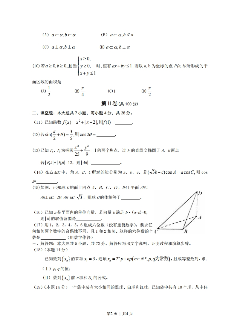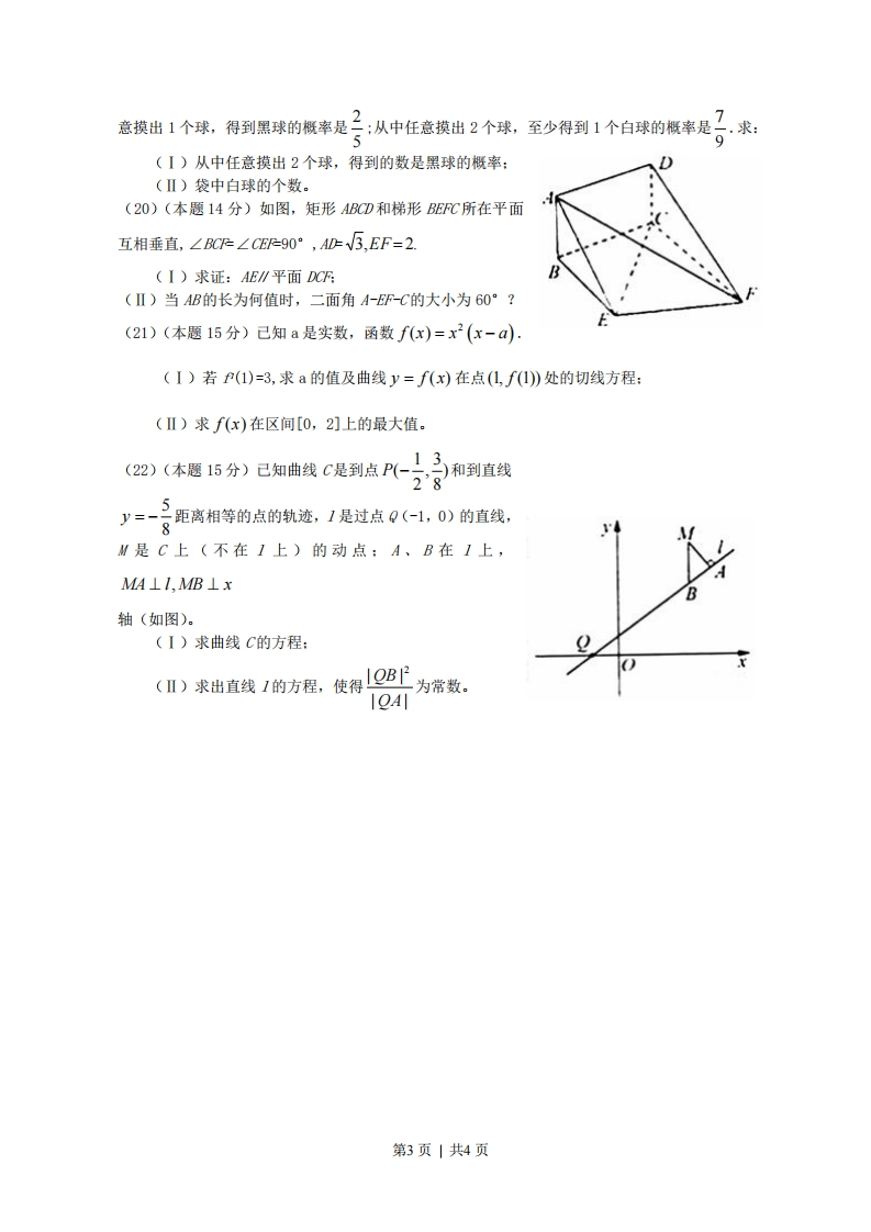 2008年普通高等学校统一考试(浙江卷)数学(文科)试题第1卷(共50分)一、选择题:本大题共10小题,每小题5分,共50分。在每小题给出的四个选项中,只有一项是符合题目要求的。(1)己知集合A={x|x>0},B=x|-1≤x≤2}则AUB=(A)|x2-1(B){|x≤2}(C)x|0b2”是“a>b”的(A)充分而不必要条件(B)必要而不充分条件(C)充分必要条件(D)既不充分也不必要条件(4)已知{a}是等比数列,4=2a,=4则公比qF1(B)-2(C)2(D)2(5)己知a≥0,b≥0,且a+b=2,则1(N)ab(®)ab≥2(C)a2+b2≥2(D)a2+b2≤3(6)在(x-1)(x-2)(x-3)(x-4)(x-5)的展开式中,含x4的项的系数是(A)-15(B)85(C)-120(D)274)在同一平面直角坐标系中,函数y=C0(+牙xeD,2π力的图象和直线y=的交点个数是(A)0(B)1(C)2(D)4(8)若双曲线。一6=1的两个焦点到一条准线的距离之比为3:2,则双曲线的离心率是(A)3(B)5(C)√5(D)5(9)对两条不相交的空间直线a与b,必存在平面a,使得第1页|共4页(A)aca,bca(B)aca,b∥a(C)a⊥a,b⊥(D)ac,b⊥x20,(10)若a≥0,b≥0,且当y≥0,时,恒有ar+by≤1,则以a,b为坐标的点P(a,b)所形成的平x+y≤1面区域的面积是1π(A)(B)(C)1(D)22第川卷(共100分)二、填空题:本大题共7小题,每小题4分,共28分。(11)己知函数f(x)=x2+x-2,则f)=(12)若sin(+8)=,则cos20=3513)已知R、为椭圆+上25+9=1的两个焦点,过F的直线交椭圆于A、B两点若|EA+|E=12,则川|A=(14)在△ABC中,角A、B、C所对的边分别为a、b、c。若(V3b-c)cosA=acosC,则cos(15)如图,己知球O的面上四点A、B、C、D,DAL平面ABCABL BC,DM=AB=BC=√3,则球O的体积等于—(16)己知a是平面内的单位向量,若向量b满足b·(ar)=0,则川b的取值范围是(17)用1,2,3,4,5,6组成六位数(没有重复数字),要求任何相邻两个数字的奇偶性不同,且1和2相邻。这样的六位数的个(B数是(用数字作答)三、解答题:本大题共5小题,共72分。解答应写出文字说明、证明过程和演算步骤。(18)(本题14分)已知数列{x}的首项x=3,通项x。=2”p+p(nEN*,P,q为常数),且成等差数列。求:(I)p,g的值:(Ⅱ)数列{xn}前n项和Sn的公式。(19)(本题14分)一个袋中装有大小相同的黑球、白球和红球,已知袋中共有10个球,从中任第2页|共4页27意摸出1个球,得到黑球的概率是二:从中任意摸出2个球,至少得到1个白球的概率是一,求:59(I)从中任意摸出2个球,得到的数是黑球的概率:(Ⅱ)袋中白球的个数。(20)(本题14分)如图,矩形ABCD和梯形BEFC所在平面互相垂直,∠BCe∠CE90°,AcV5,EF=2.(I)求证:AE∥平面DCF:(Ⅱ)当AB的长为何值时,二面角A-EF-C的大小为60°?(21)(本题15分)己知a是实数,函数f(x)=x2(x-a(I)若(1)=3,求a的值及曲线y=f(x)在点(L,fI)处的切线方程:(Ⅱ)求f(x)在区间[0,2]上的最大值.(22)(本题15分)己知曲线C是到点P(-3和到直线2'81一距离相等的点的轨迹,1是过点Q(-1,0)的直M是C上(不在1上)的动点:A、B在1上,MA⊥I,MB⊥x轴(如图)。(I)求曲线C的方程:()求出直线1的方程,使得OB为常数。OA第3页|共4页