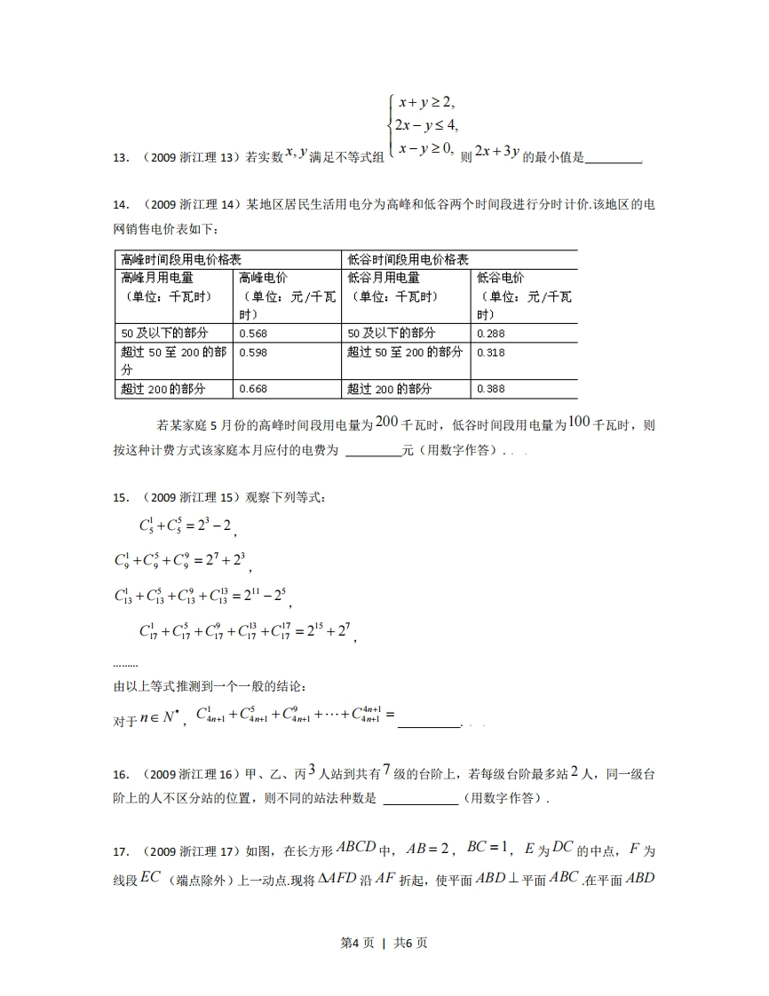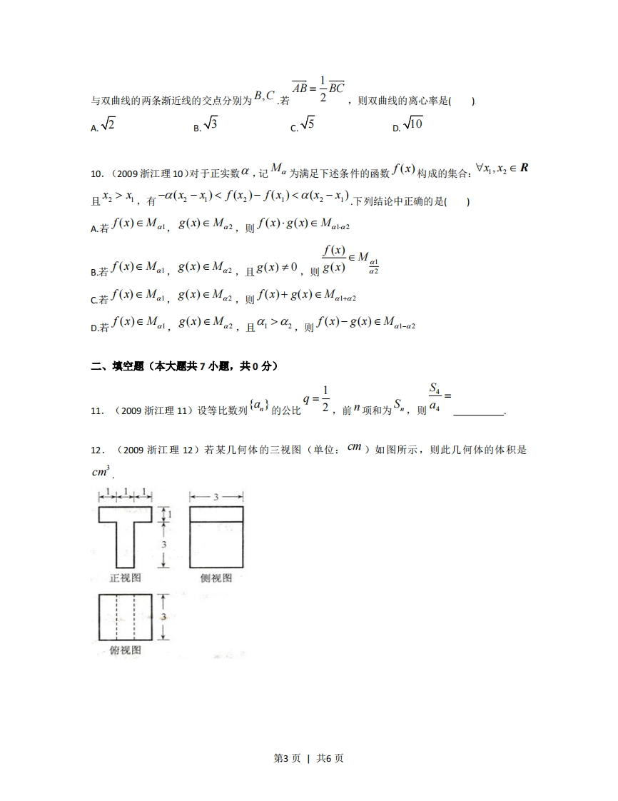 2009年高考数学浙江理科试卷含详细解答一、选释题(本大题共10小题,共0分)1.(20o9浙江理1)设U=R,A={xx>0),B={xx>1,则AnCuB:=()A{x|0≤x12.(20o9浙江理2)已知a,b是实数,则“a>0且b>0"是“a+b>0且ab>0"的()A充分而不必要条件B.必要而不充分条件C充分必要条件D.既不充分也不必要条件2二+z2=3.(2009浙江理3)设2=1+1(是虚数单位),则:()A.-1-i B.-1+i C.1-i D.1+i.(x2-4.(2009浙江理4)在二项式x的展开式中,含x的项的系数是(。·A.-10B.10c.-5D.55.(20O9浙江理5)在三棱柱4BC-4B,G中,各棱长相等,侧技垂直于底面,点D是侧面BBCC的中心,则AD与平面BBCC所成角的大小是()A.30°B.45°c.60°D.90°6.(2009浙江理6)某程序框图如图所示,该程序运行后输出的K的值是()第1页1共6页开始S=0S<1002S=S+29输出kk=k+1结束A.48.5c.6D.77.(209浙江理7)设向量a,b满足:|a仁3,1b4,a-b=0.以a,b,a-b的模为边长构成三角形,则它的边与半径为1的圆的公共点个数最多为4.3B.4c.5D.68.(2Oo9浙江理8)已知a是实数,则函数f(x)=1+asina的图象不可能是()2π2πx2π22πx2元0xy29.(209浙江理9)过双曲线云F=1(a>0,b>0)的右顶点A作斜率为-1的直线,该直线第2页1共6页AB=1BC与双曲线的两条渐近线的交点分别为B,C.若,则双曲线的离心率是()AV迈B.V3c.V5D.v1010.(2009浙江理10)对于正实数a,记M。为满足下述条件的函数f(x)构成的集合:x,X∈R且>元,有a:-)Kf)-fx,)K,-x).下列结论中正确的是()A若fx)eMal,g()∈Ma2,则f(xg()∈Mae2者eM,3EM.且g0,3田EMc.若f(∈Mai,8(x)eM2,则fx)+g()∈Maia2D若f)eMa,8()eM2,且a>凸,则fx)-8∈Ml-2二、填空题(本大题共7小题,共0分)9s1S4=11.(2009浙江理11)设等比数列a,}的公比2,前n项和为。,则412.(2009浙江理12)若某几何体的三视图(单位:cm)如图所示,则此几何体的体积是cm3正视图侧视图俯视图第3页1共6页