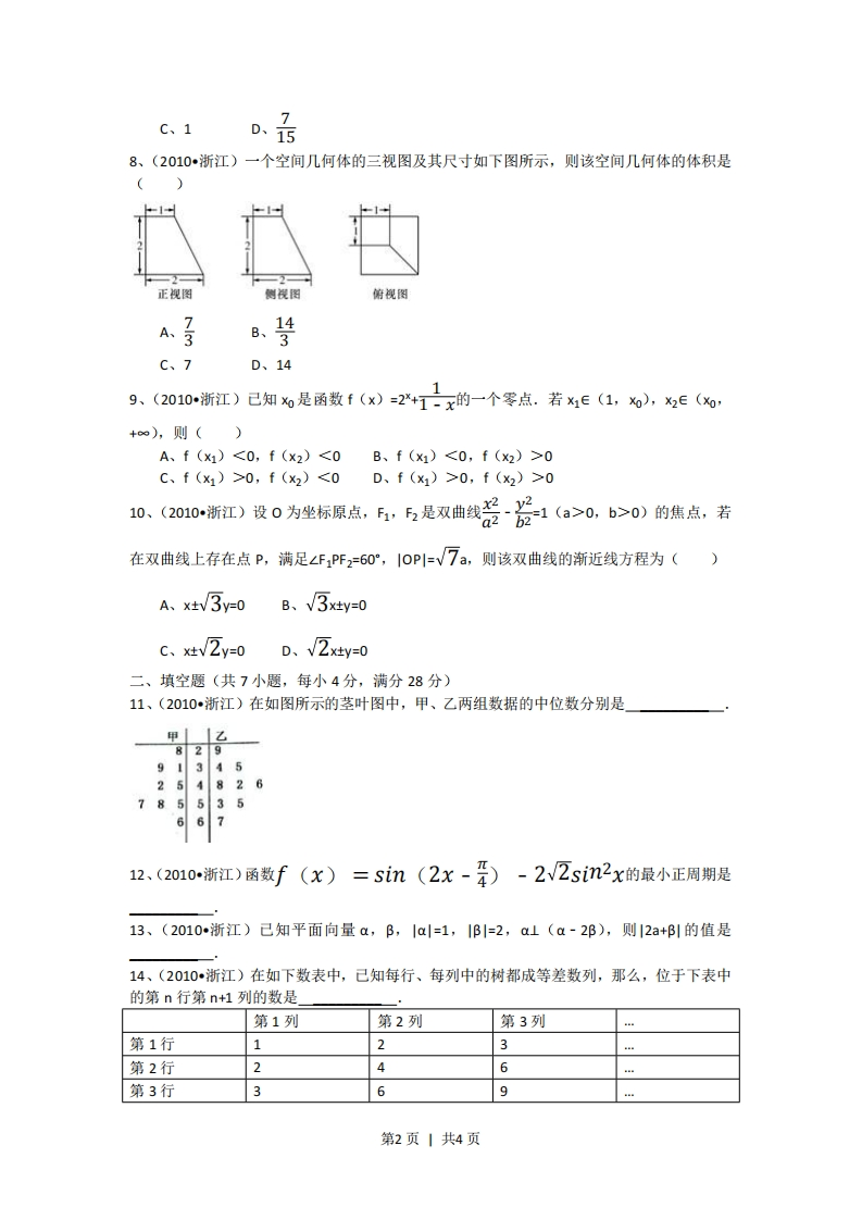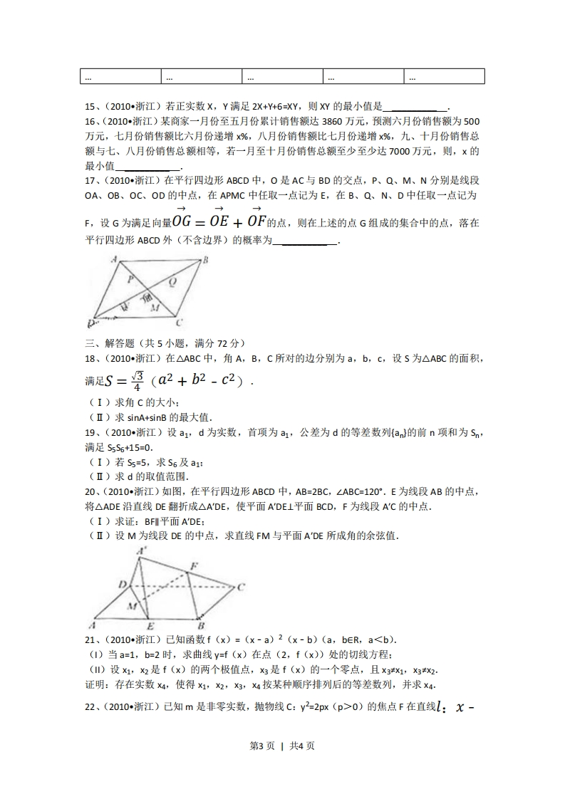2010年浙江高考(文科)试卷一、选择题(共10小题,每小题5分,满分50分)1、(2010·浙江)设P=xx<1},Q={xx2<4,则PnQ()A、{x-14B、k>5C、k>6D、k>75、((2010~浙江)设sn为等比数列6,的前n项和,8aa0则爱()A、-11B、-8C、5D、11π6、(2010浙江)设00C、f(x1)>0,f(x2)<0D、f(x1)>0,f(x2)>010、(2010,浙江)设0为坐标原点,,5是双曲线器治1(a>0,b>0)的焦点,若在双曲线上存在点P,满足∠FPF2=60°,IOP1=√7a,则该双曲线的渐近线方程为()A、x3y=0B、V3x4y=0c、x灶VZy=0D、VZxy=0二、填空题(共7小题,每小4分,满分28分)11、(2010浙江)在如图所示的茎叶图中,甲、乙两组数据的中位数分别是甲L乙82991345254826785535612、(2010浙江)函数f(x)=sin(2x-平)-2V2sin2x的最小正周期是13、(2010浙江)已知平面向量a,B,Ia=1,1B1=2,a1(a-2B),则12a+B1的值是14、(2010·浙江)在如下数表中,己知每行、每列中的树都成等差数列,那么,位于下表中的第n行第n+1列的数是」第1列第2列第3列第1行123第2行26第3行69第2页1共4页15、(2010浙江)若正实数X,Y满足2X+Y46=XY,则XW的最小值是16、(2010·浙江)某商家一月份至五月份累计销售额达3860万元,预测六月份销售额为500万元,七月份销售额比六月份递增x%,八月份销售额比七月份递增x%,九、十月份销售总额与七、八月份销售总额相等,若一月至十月份销售总额至少至少达7000万元,则,×的最小值17、(2010·浙江)在平行四边形ABCD中,O是AC与BD的交点,P、Q、M、N分别是线段OA、OB、OC、OD的中点,在APMC中任取一点记为E,在B、Q、N、D中任取一点记为F,设G为满足向量OG=OE十OF的点,则在上述的点G组成的集合中的点,落在平行四边形ABCD外(不含边界)的概率为三、解答题(共5小题,满分72分)18、(2010·浙江)在△ABC中,角A,B,C所对的边分别为a,b,c,设S为△ABC的面积,满足S=号(a2+b2-c2).(I)求角C的大小:(Ⅱ)求sinA+sinB的最大值.19、(2010·浙江)设a1,d为实数,首项为a1,公差为d的等差数列{an}的前n项和为Sn,满足S5S6+15=0.(I)若S5=5,求S6及a1i(Ⅱ)求d的取值范围.20、(2010·浙江)如图,在平行四边形ABCD中,AB=2BC,∠ABC=120°.E为线段AB的中点,将△ADE沿直线DE翻折成△A'DE,使平面A'DE⊥平面BCD,F为线段A'C的中点.(I)求证:BFl平面ADE:(Ⅱ)设M为线段DE的中点,求直线FM与平面ADE所成角的余弦值.21、(2010·浙江)己知函数f(x)=(×-a)2(x-b)(a,beR,a0)的焦点F在直线:X-第3页1共4页