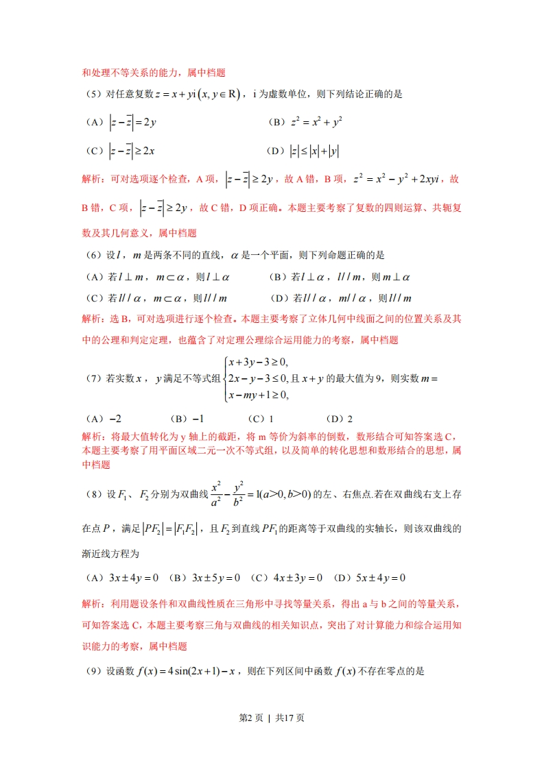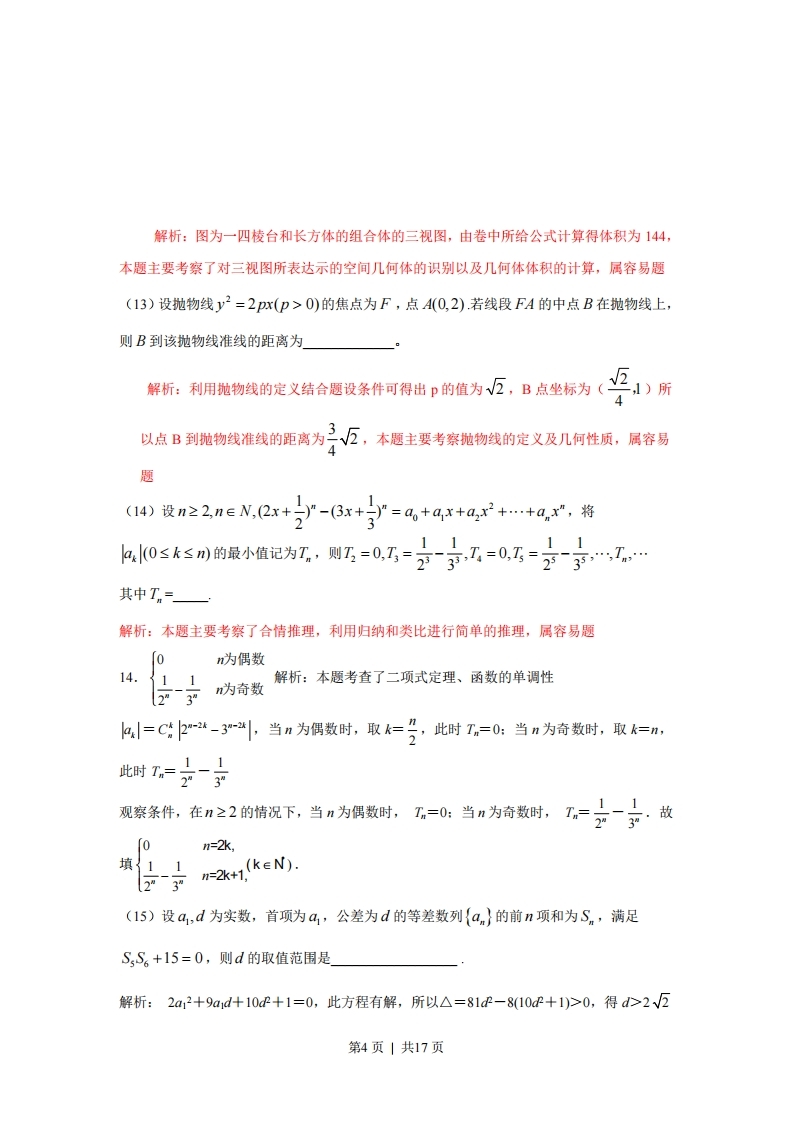 2010年高考浙江卷理科数学试题及答案一、选择题:本题考查基本知识和基本运算。每小题5分,满分50分。(1)B(2)A(3)D(4)B(5)D(6)B(7)C(8)C(9)A(10)B(1)设P={x|x<4),Q={x|x2<4,则开始(A)p∈Q(B)Q∈PS=1,k=1(C)pECo(D)OECPk=k十1解析:0={叶24?(B)k>5?(C)k>62(D)k>7?结束解析:选A,本题主要考察了程序框图的结构,以及与数列有关的简(第2题)单运算,属容易题(3)设S为等比数列{a,}的前n项和,8a,+a,=0,则兰=(A)11(B)5(C)-8(D)-11解析:解析:通过8a2+a=0,设公比为q,将该式转化为8a2+a2q3=0,解得q=-2,带入所求式可知答案选D,本题主要考察了本题主要考察了等比数列的通项公式与前项和公式,属中档题4)设0Kx≤号,则“xsinx”是“xsinx<1”的(A)充分而不必要条件(B)必要而不充分条件(C)充分必要条件(D)既不充分也不必要条件解析:因为006⊙0的左、右货点若在双自统右支上在在点P,满足PF=FF,且F到直线PF的距离等于双曲线的实轴长,则该双曲线的渐近线方程为(A)3x±4y=0(B)3x±5y=0(C)4x±3y=0(D)5x±4y=0解析:利用题设条件和双曲线性质在三角形中寻找等量关系,得出与b之间的等量关系,可知答案选C,本题主要考察三角与双曲线的相关知识点,突出了对计算能力和综合运用知识能力的考察,属中档题(9)设函数f(x)=4sin(2x+1)-x,则在下列区间中函数f(x)不存在零点的是第2页|共17页(A)[-4,-2](B)[-2,0](c)[0,2](D)[2,4解析:将f(x)的零点转化为函数g(x)=4sin(2x+1)与(x)=x的交点,数形结合可知答案选A,本题主要考察了三角函数图像的平移和函数与方程的相关知识点,突出了对转化思想和数形结合思想的考察,对能力要求较高,属较难题(10)设函数的集合P=平面上点的则在同一直角坐标系中,P中函数f(x)的图象恰好经过Q中两个点的函数的个数是(A)4(B)6(C)8(D)10解析:当a=0,b-0,a=0,b=1;a=二,b-0,a=二,b=1;a=1,b=1;a=1,b=1时满足题意,故答案选B,本题主要考察了函数的概念、定义域、值域、图像和对数函数的相关知识点,对数学素养有较高要求,体现了对能力的考察,属中档题二、填空题:本题考查基本知识和基本运算。每小题4分,满分28分。(11)元(12)144(13)540,当n为偶数时(14)11(15)d≤-2V2或d≥2W223当n为奇数时(16)(17)264(11)函数f(x)=sin(2x--2巨sin2x的最小正周期是」解析:2x+√互故最小正周期为,本题主要考察了三角恒等变换及相关公式,属中档题(12)若某几何体的三视图(单位:cm)如图所示,则此几何体的体积是2442正视图侧视图第3页|共17页修悦用(第12题)