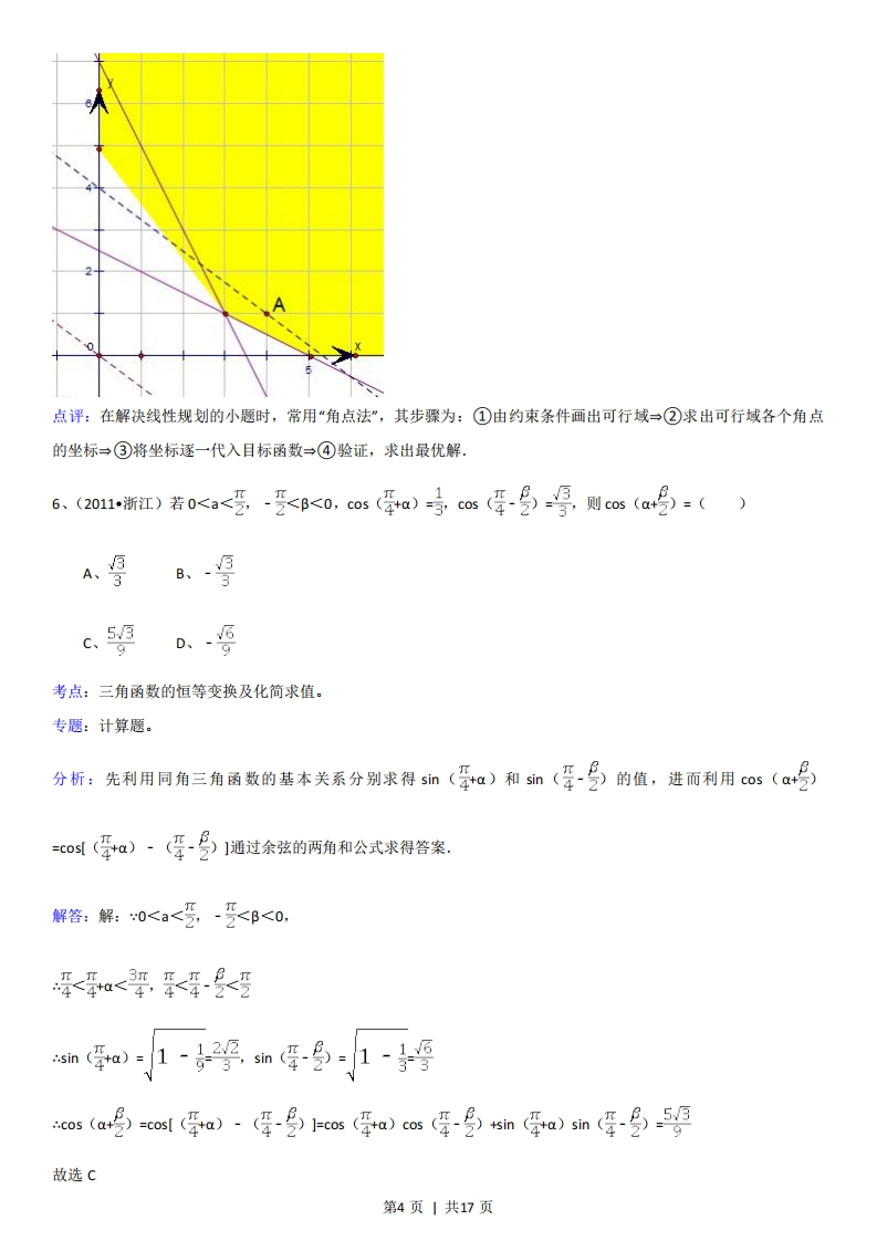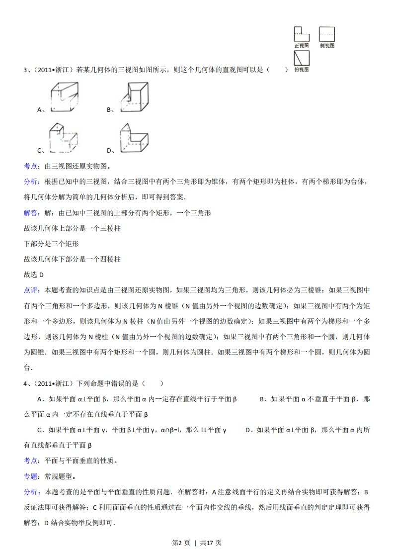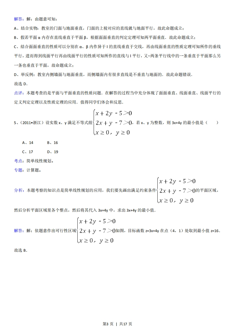 2011年浙江省高考数学试卷(理科)解析卷一、选择题(共10小题,每小题5分,满分50分)-X,x≤01、(2011·浙江)设函数f(x)={若f(a)=4,则实数a=()x2,x>0A、-4或-2B、-4或2C、-2或4D、-2或2考点:分段函数的解析式求法及其图象的作法。专题:计算题。分析:分段函数分段处理,我们利用分类讨论的方法,分a≤0与>0两种情况,根据各段上函数的解析式,分别构造关于a的方程,解方程即可求出满足条件的a值.解答:解:当as0时若f(a)=4,则-a=4,解得a=-4当a>0时若f(a)=4,则a2=4,解得a=2或a=-2(舍去)故实数a=-4或a=2故选B点评:本题考查的知识点是分段函数,分段函数分段处理,这是研究分段函数图象和性质最核心的理念,具体做法是:分段函数的定义域、值域是各段上x、y取值范围的并集,分段函数的奇偶性、单调性要在各段上分别论证:分段函数的最大值,是各段上最大值中的最大者,2、(2011·浙江)把复数z的共轭复数记作Z,i为虚数单位.若z=1+i,则(1+z)·Z=()A、3-iB、3+iC、1+3iD、3考点:复数代数形式的混合运算。专题:计算题。分析:求出Z,然后代入(1+z)·Z,利用复数的运算法则展开化简为:a+bi(a,bER)的形式,即可得到答案.解答:解::复数=1+i,i为虚数单位,Z=1-i,则(1+z)Z=(2+i)(1-1)=3-i故选A.点评:本题考查复数代数形式的混合运算,共轭复数,考查计算能力,是基础题,常考题型.第1页1共17页正图侧视图3、(2011·浙江)若某几何体的三视图如图所示,则这个几何体的直观图可以是(视图D考点:由三视图还原实物图。分析:根据己知中的三视图,结合三视图中有两个三角形即为锥体,有两个矩形即为柱体,有两个梯形即为台体,将几何体分解为简单的几何体分析后,即可得到答案。解答:解:由己知中三视图的上部分有两个矩形,一个三角形故该几何体上部分是一个三棱柱下部分是三个矩形故该几何体下部分是一个四棱柱故选D点评:本题考查的知识点是由三视图还原实物图,如果三视图均为三角形,则该几何体必为三棱锥:如果三视图中有两个三角形和一个多边形,则该几何体为N棱锥(N值由另外一个视图的边数确定):如果三视图中有两个为矩形和一个多边形,则该几何体为N棱柱(N值由另外一个视图的边数确定):如果三视图中有两个为梯形和一个多边形,则该几何体为N棱柱(N值由另外一个视图的边数确定):如果三视图中有两个三角形和一个圆,则几何体为圆锥.如果三视图中有两个矩形和一个圆,则几何体为圆柱.如果三视图中有两个梯形和一个圆,则几何体为圆台.4、(2011·浙江)下列命题中错误的是()A、如果平面α⊥平面B,那么平面α内一定存在直线平行于平面BB、如果平面a不垂直于平面B,那么平面α内一定不存在直线垂直于平面BC、如果平面a⊥平面y,平面B⊥平面y,anBl,那么山平面yD、如果平面L平面B,那么平面a内所有直线都垂直于平面β考点:平面与平面垂直的性质。专题:常规题型。分析:本题考查的是平面与平面垂直的性质问题.在解答时:A注意线面平行的定义再结合实物即可获得解答:B反证法即可获得解答:C利用面面垂直的性质通过在一个面内作交线的垂线,然后用线面垂直的判定定理即可获得解答:D结合实物举反例即可.第2页1共17页解答:解:由题意可知:A、结合实物:教室的门面与地面垂直,门面的上棱对应的直线就与地面平行,故此命题成立:B、假若平面α内存在直线垂直于平面B,根据面面垂直的判定定理可知两平面垂直.故此命题成立:C、结合面面垂直的性质可以分别在α、B内作异于|的直线垂直于交线,再由线面垂直的性质定理可知所作的垂线平行,进而得到线面平行再由线面平行的性质可知所作的直线与丨平行,又:两条平行线中的一条垂直于平面那么另一条也垂直于平面,故命题成立:D、举反例:教室内侧墙面与地面垂直,而侧墙面内有很多直线是不垂直与地面的.故此命题错误.故选D.点评:本题考查的是平面与平面垂直的性质问题.在解答的过程当中充分体现了面面垂直、线面垂直、线面平行的定义判定定理以及性质定理的应用.值得同学们体会和反思x+2y-505、(2011·浙江)设实数×、y满足不等式组2X十y-7>0,若×、y为整数,则3x+4y的最小值是()x20,y20A、14B、16C、17D、19考点:简单线性规划。专题:计算题。x+2y-5>0分析:本题考察的知识点是简单线性规划的应用,我们要先画出满足约束条件2X十y-7>0的平面区域,x≥0,y≥0然后分析平面区域里各个整点,然后将其代入3x+4y中,求出3x+4y的最小值.2x+2y-50解答:解:依题意作出可行性区域2X十y-7>0如图,目标函数z=3x+4y在点(4,1)处取到最小值2=16.x20,y20故选B.第3页共17页