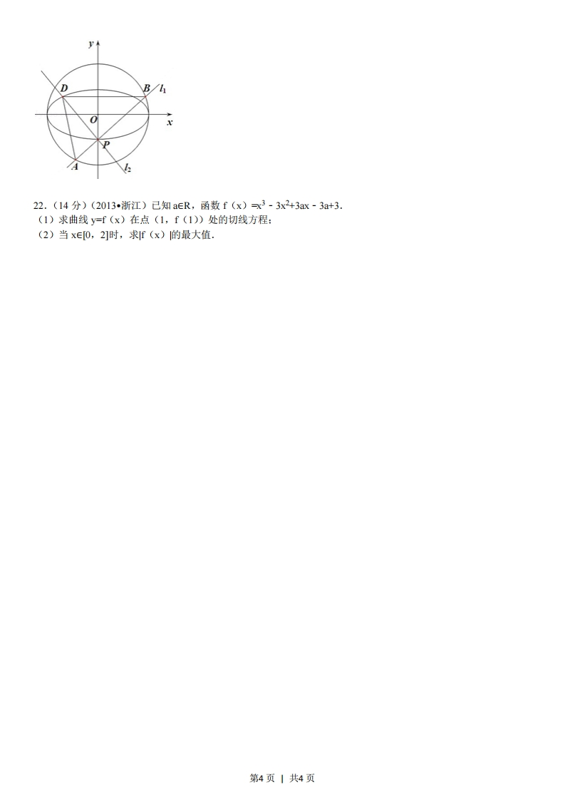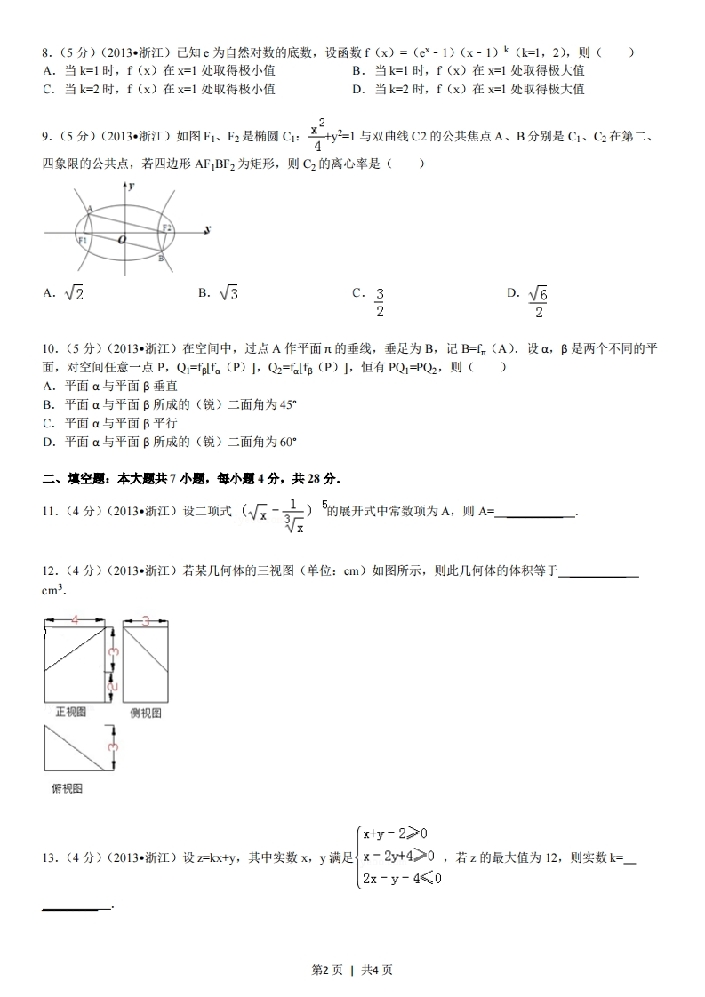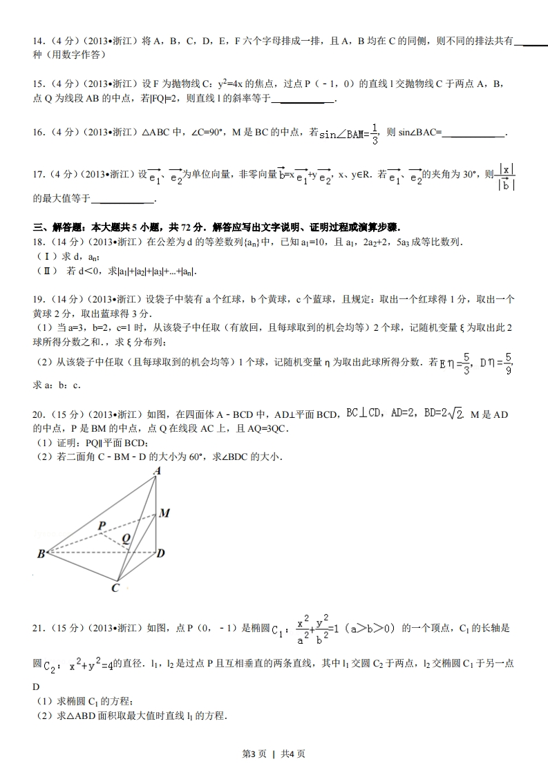 2013年浙江省高考数学试卷(理科)一.选择题:本大题共10小题,每小题5分,共50分。在年小题给出的四个选项中,只有一项是符合题目要求的.1.(5分)(2013浙江)已知i是虚数单位,则(-1+i)(2-i)=()A.-3+iB.-1+3iC.-3+3iD.-1+i2.(5分)(2013浙江)设集合S={x水>-2},T=xx243x-4s0},则(CRS)UT=()A.(-2,1]B.(-∞,-4]C.(-∞,1]D.[1,+∞)3.(5分)(2013·浙江)己知x,y为正实数,则()A.2lgx+lgy=21gx+2lgyB.2lg (xty)=lgx.2lgyC.2lgx-lgy=21gx+2gyD.2lg (xy)=2lgx.2lgy4.(5分)(2013浙江)己知函数f(x)=Acos(ux+中)(A>0,uw>0,中R),则r(x是奇函数"是中工的2()A.充分不必要条件B.必要不充分条件C.充分必要条件D.既不充分也不必要条件5.(5分)(2013浙江)某程序框图如图所示,若该程序运行后输出的值是9则()5开始1A.a=4B.a=5C.a=6D.a=76.(5分)(2013浙江)已知a∈R,sina+2cosa=Y1,则tan2a=()2A.B.3c.-3D.347.(5分)(2013,浙江)设△ABC,P是边AB上一定点,满足PgB=B,且对于边AB上任一点P,恒有P币-PC>PB,PC则()A.∠ABC=90°B.∠BAC=90°C.AB=ACD.AC=BC第1页1共4页8.(5分)(2013浙江)己知e为自然对数的底数,设函数f(x)=(ex-1)(x-1)k(k=l,2),则()A.当k=1时,f(x)在x=1处取得极小值B.当k=1时,f(x)在x=1处取得极大值C.当k=2时,f(x)在x=1处取得极小值D.当k=2时,f(x)在x=1处取得极大值29.(5分)(2013浙江)如图F1、F2是椭圆C1:X+y2=1与双曲线C2的公共焦点A、B分别是C1、C2在第二、4四象限的公共点,若四边形AFBF2为矩形,则C2的离心率是()F1A.2B.3c昌D.6210.(5分)(2013·浙江)在空间中,过点A作平面π的垂线,垂足为B,记B=式元(A).设α,B是两个不同的平面,对空间任意一点P,Q=flEa(P)],Q2=aI(P)],恒有PQ1=PQ2,则()A.平面a与平面B垂直B.平面a与平面B所成的(锐)二面角为45°C.平面a与平面B平行D.平面α与平面B所成的(锐)二面角为60°二、填空愿:本大题共7小题,每小题4分,共28分.1.4分)(2013浙江)设二项式(√疗)5的展开式中常数项为A,则A=12.(4分)(2013浙江)若某几何体的三视图(单位:cm)如图所示,则此几何体的体积等于cm3.正视图侧视图俯视图x+y-2013.(4分)(2013浙江)设x=kx+y,其中实数X,y满足{×-2y叶4>0,若z的最大值为12,则实数k=_2x-y-4≤0第2页1共4页14.(4分)(2013·浙江)将A,B,C,D,E,F六个字母排成一排,且A,B均在C的同侧,则不同的排法共有种(用数字作答)15.(4分)(2013浙江)设F为抛物线C:y2=4x的焦点,过点P(-1,0)的直线1交抛物线C于两点A,B,点Q为线段AB的中点,若FQ上2,则直线I的斜率等于16.(4分)(2013浙江)△ABC中,∠C=90,M是BC的中点,若sin∠BAI=号则sin∠BAC=317.(4分)(2013浙江)设可E为单位向量,非零向量xGyE2xyeR.若62的夹角为30,则的最大值等于三、解答题:本大题共5小题,共72分。解答应写出文字说明、证明过程或演算步骤.18.(14分)(2013浙江)在公差为d的等差数列{an}中,己知a1=10,且a1,2a2+2,5a成等比数列.(I)求d,an(Ⅱ)若d<0,求lal+la+las++anl:19.(14分)(2013浙江)设袋子中装有a个红球,b个黄球,c个蓝球,且规定:取出一个红球得1分,取出一个黄球2分,取出蓝球得3分,(1)当=3,b=2,c=1时,从该袋子中任取(有放回,且每球取到的机会均等)2个球,记随机变量£为取出此2球所得分数之和.,求ξ分布列:(2)从该袋子中任取(且每球取到的机会均等)1个球,记随机变量n为取出此球所得分数,若E门一号D门=号求a:b:c.20.(15分)(2013·浙江)如图,在四面体A-BCD中,AD1平面BCD,BC⊥CD,AD=2,BD=2√2.M是AD的中点,P是BM的中点,点Q在线段AC上,且AQ=3QC.(1)证明:PQI平面BCD:(2)若二面角C-BM-D的大小为60°,求∠BDC的大小.4B------------2(15分)2013江)如图,点p0,-D是稀圆C,:之+之1《(a≥b>0)的一个顶点,G,的长轴是圆C2:x2+y2=4的直径.1,2是过点P且互相垂直的两条直线,其中1交圆C2于两点,2交椭圆C1于另一点D(1)求椭圆C,的方程:(2)求△ABD面积取最大值时直线h的方程.第3页1共4页