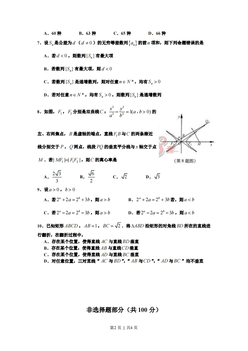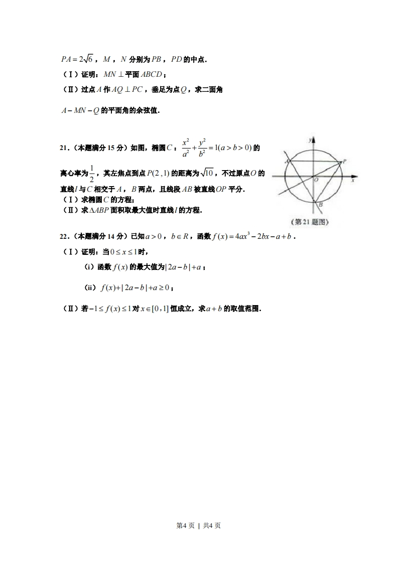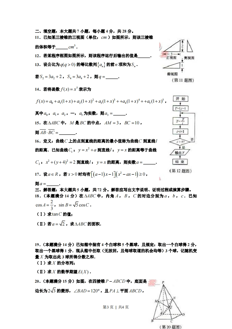 2012浙江省高考数学(理科)试卷数学(理科)选择题部分(共50分)一、选择题:本大题共10小题,每小题5分,共50分。在每小题给出的四个选项中,只有一个项是符合题目要求的。1.设集合A={x10D.若对任意n∈N*,均有Sn>0,则数列{Sn}是递增数列8,如图,F,F分别是双曲线C:之-京三1(a,b>0)的左、右两焦点,B是虚轴的端点,直线FB与C的两条渐近线分别交于P,Q两点,线段PQ的垂直平分线与x轴交于点M.若|ME曰EF|,则C的高心率是(第8题图)4.25&.6C.2D.5329.设a>0,b>0A.若2+2a=2+3b,则a>bB.2+2a=2+3b若,则abD.若2-2a=2-3b,则a0)的等比数列{an}的前n项和为Sn·德视图若S2=3a2+2,S4=3a4+2,则q=_(第11题图)14.若将函数f(x)=x表示为f(x)=4+a(1+x)+a2(1+x)2+a1+x)3++a,(1+x)°++a(1+x),并始T-li-l其中a0,41,42,…,4为实数,则a3=15.在△ABC中,M是BC的中点,AM=3,BC=10,则AB·BC=16.定义:曲线C上的点到直线的距离的最小值称为曲线C到直线11>的距离.已知曲线C:y=x2+a到直线l:y=x的距高等于曲线是输出TC2:x2+(y+4)2=2到直线1:y=x的距离,则实数a=。结束17.设a∈R,若x>0时均有[(a-1)x-1](x2-ar-)20,(第12题图)则a=三、解答题:本大题共5小题,共72分。解答应写出文字说明、证明过程或演算步骤。18。(本题满分14分)在△4BC中,内角A,B,C的对边分别为a,b,c.已知eos4-号,smB=5cosC(I)求tanC的值:(Ⅱ)若a=√2,求△4BC的面积.19。(本题满分14分)已知箱中装有4个白球和5个黑球,且规定:取出一个白球得2分,取出一个黑球得1分.现从箱中任取(无放回,且每球取道的机会均等)3个球,记随机变量X为取出此3球所得分数之和,(I)求X的分布列:(Ⅱ)求X的数学期望E(X)·20.(本题满分15分)如图,在四棱锥P-ABCD中,底面是边长为2√3的菱形,∠BAD=120°,且PA⊥平面ABCD,第3页|共4页(第20题图)