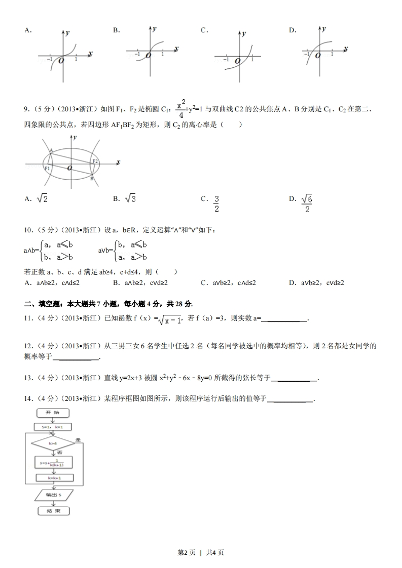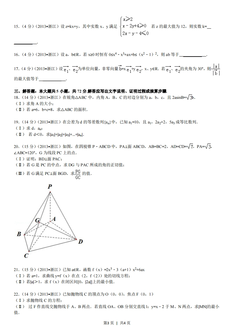 2013年浙江省高考数学试卷(文科)一、选择题:本大题共10小题,每小题5分,共50分.在每小题给出的四个选项中,只有一项是符合题目要求的1.(5分)(2013浙江)设集合={x本>-2},T={x-4≤X≤1},则SnT=()A.[-4,+∞)B.(-2,+∞)C.[-4,1]D.(-2,1]2.(5分)(2013浙江)己知i是虚数单位,则(2+i)(3+i)=()A.5-5iB.7-5iC.5+5iD.7+5i3.(5分)(2013.浙江)若aeR,则“"a=0是"sinaf(1),则()A.a>0,4a+b=0B.a<0,4a+b=0C.a>0,2a+b=0D.a<0,2a+b=08.(5分)(2013·浙江)己知函数y=f(x)的图象是下列四个图象之一,且其导函数y=f(x)的图象如图所示,则该函数的图象是()第1页1共4页C.29.(5分)(2013浙江)如图F1、F2是椭圆C1:X+y2-1与双曲线C2的公共焦点A、B分别是C1、C2在第二、4四象限的公共点,若四边形AFBF2为矩形,则C2的离心率是()A.V2B.V3D.210.(5分)(2013·浙江)设a,bER,定义运算“n"和“v如下:aAb=a,ab(b,abavb=b,aba,a>b若正数a、b、c、d满足ab24,c+ds4,则()A.aAb22,cAds2B.aAb22,cVd22C.avb22,cAds2D.avb22,cvd22二、填空题:本大题共7小题,每小题4分,共28分.11.(4分)(2013浙江)已知函数f(x)=√x-1,若f(a)=3,则实数a=12.(4分)(2013·浙江)从三男三女6名学生中任选2名(每名同学被选中的概率均相等),则2名都是女同学的概率等于」13.(4分)(2013·浙江)直线y=2x+3被圆x2+y2-6x-8y=0所截得的弦长等于14.(4分)(2013·浙江)某程序框图如图所示,则该程序运行后输出的值等于[开始输出s结乘第2页1共4页x>215.(4分)(2013浙江)设z=kx+y,其中实数x、y满足{×-2y+4>0若z的最大值为12,则实数k=_2x-y-4≤016.(4分)(2013浙江)设a,bER,若x20时恒有0sx4-x3+ax+bs(x2-1)2,则ab等于」17.(4分(2013浙江)设可©2为单位向量,非零向量已y2xyeR.若6e2的夹角为30,则的最大值等于三、解答题:本大题共5小题,共72分解答应写出文字说明、证明过程或演算步骤18.(14分)(2013浙江)在锐角△ABC中,内角A,B,C的对边分别为a,b,c,且2 asinB=√多.(I)求角A的大小:(Ⅱ)若a=6,b+c=8,求△ABC的面积.19.(14分)(2013浙江)在公差为d的等差数列am}中,己知a1=10,且a1,2a2+2,5a3成等比数列.(I)求d,an:(Ⅱ)若d<0,求la+la+lat.tanl.20.(15分)(2013·浙江)如图,在四棱锥P-ABCD中,PAL面ABCD,AB=BC=2,AD=CD=√7,PA=√3,∠ABC=120°,G为线段PC上的点.(I)证明:BDL面PAC:(Ⅱ)若G是PC的中点,求DG与PAC所成的角的正切值:(Ⅲ)若G满足PCL面BGD,求S的值.GCB21.(15分)(2013.浙江)己知aeR,函数f(x)=2x3-3(a+1)x246ax(I)若a=1,求曲线y=f(x)在点(2,f(2)处的切线方程:(Ⅱ)若la>1,求f(x)在闭区间[0,2a上的最小值.22.(14分)(2013浙江)己知抛物线C的顶点为0(0,0),焦点F(0,1)(I)求抛物线C的方程:(Ⅱ)过F作直线交抛物线于A、B两点.若直线OA、OB分别交直线I:y=X-2于M、N两点,求MN的最小值.第3页1共4页