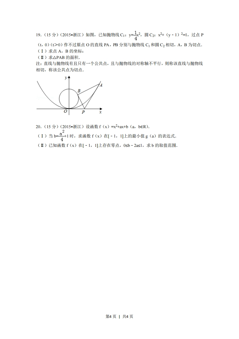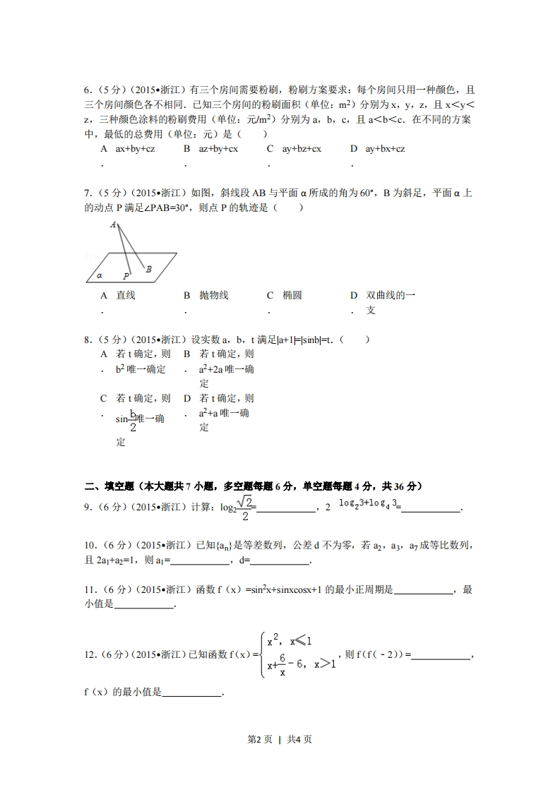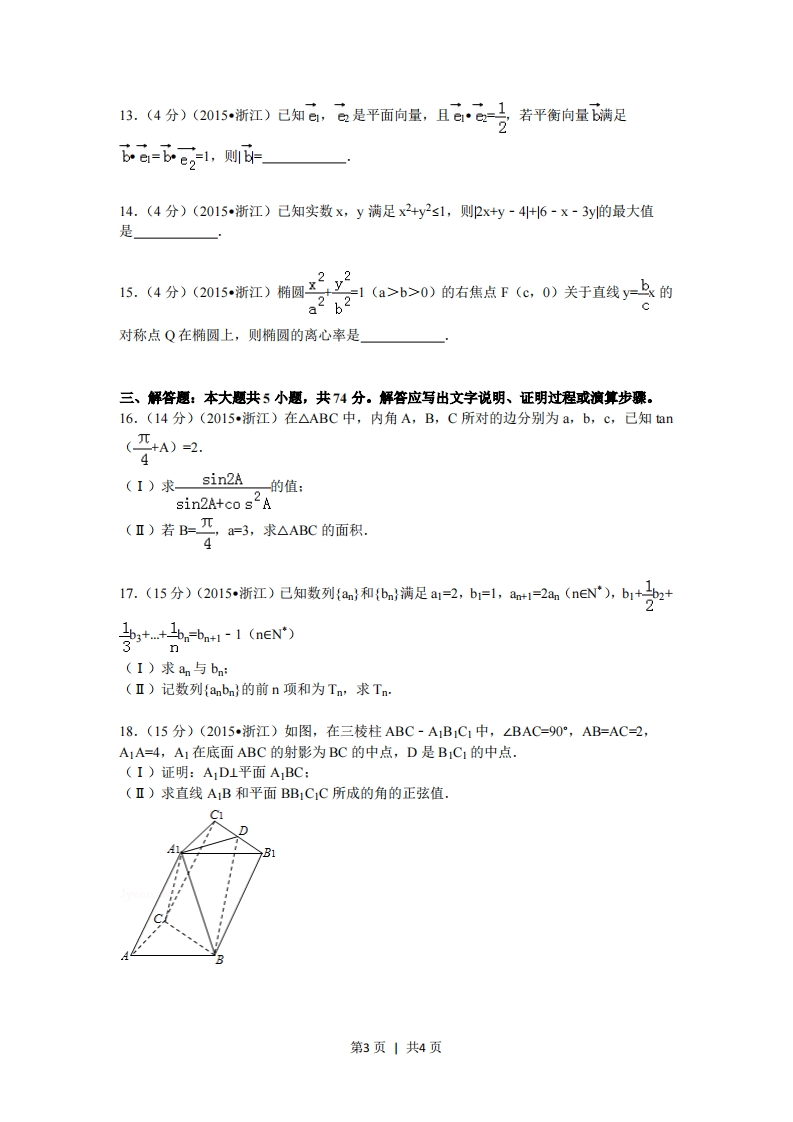 2015年浙江省高考数学试卷(文科)一、选择题(本大题共8小题,年小题5分,共40分。在每小题给出的四个选项中,只有一项是符合题目要求的)1.(5分)(2015浙江)己知集合P={x2-2x23},Q={x20是“ab>0的()A充分不必要B必要不充分·条件条件C充分必要条D既不充分也.件不必要条件4.(5分)(2015·浙江)设a,B是两个不同的平面,1,m是两条不同的直线,且1ca,mcB,(A若ILB,则B若aLB,则C若IIB,则aBD若aB,则·a⊥βI1mIllm5.(5分)(2015,浙江)函数f(x)=(x-)cosx(-π≤x≤且x0)的图象可能为()平第1页1共4页6.(5分)(2015·浙江)有三个房间需要粉刷,粉刷方案要求:每个房间只用一种颜色,且三个房间颜色各不相同.己知三个房间的粉刷面积(单位:m)分别为x,y,z,且x1,则f(f(-2)=f(x)的最小值是」第2页1共4页13.(4分)(2015浙江)已知,是平面向量,且e1-马若平衡向量满足26=6e21,则许14.(4分)(2015浙江)己知实数x,y满足x2+y2s1,则2x+y-4+6-x-3y的最大值是15.4分(2015浙江)椭圆子y1(a>b≥0)的右焦点F(e,0)关于直线)凸的a2 b2对称点Q在椭圆上,则椭圆的离心率是三、解答题:本大题共5小题,共74分。解答应写出文字说明、证明过程或演算步骤。16.(14分)(2015浙江)在△ABC中,内角A,B,C所对的边分别为a,b,c,己知anT+A)=2.4(I)求sin2A。的值:sin2A+co sA(I)若B=兀,a=3,求△ABC的面积.917.(15分)(2015浙江)已知数列{an}和bn}满足a1=2,b1=1,a*1=2an(nEN),b1+b2+3.+=+1-1(nEN')3(I)求an与bni(Ⅱ)记数列{anbn}的前n项和为Tn,求Tn18.(15分)(2015·浙江)如图,在三棱柱ABC-ABC1中,∠BAC-90°,AB=AC-2,A1A=4,A1在底面ABC的射影为BC的中点,D是B1C的中点.(I)证明:AD⊥平面ABC:(Ⅱ)求直线AB和平面BB1CC所成的角的正弦值.C第3页1共4页