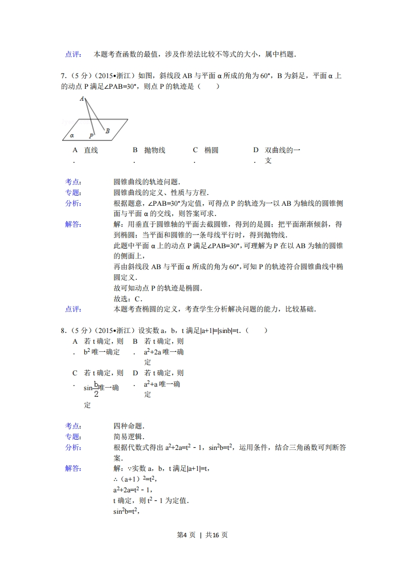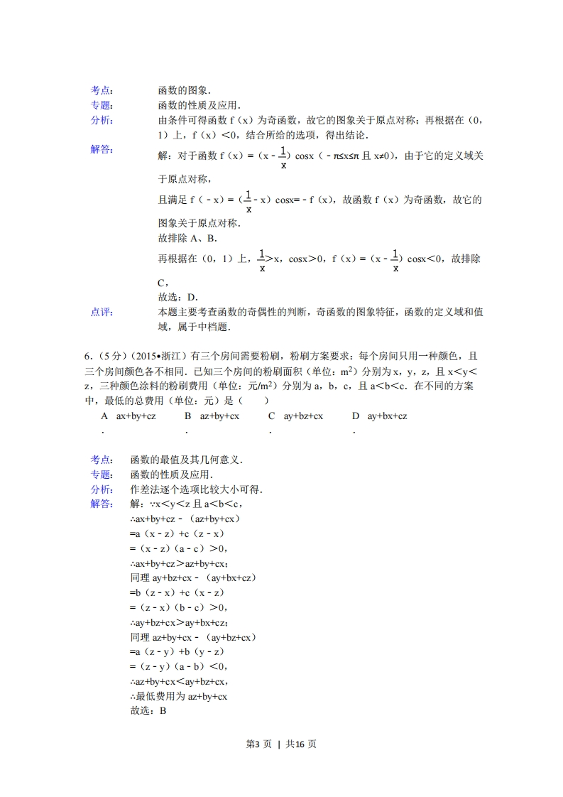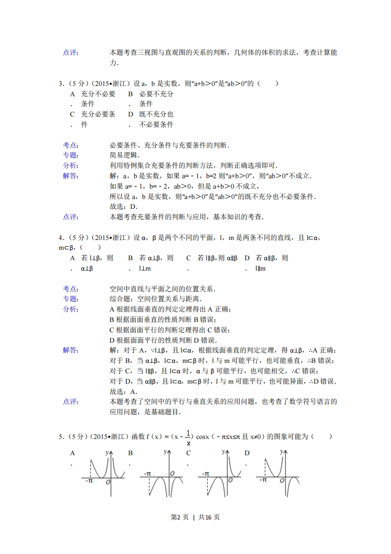 0是ab>0"的()A充分不必要B必要不充分条件条件C充分必要条D既不充分也件不必要条件考点:必要条件、充分条件与充要条件的判断.专题:简易逻辑.分析:利用特例集合充要条件的判断方法,判断正确选项即可·解答:解:a,b是实数,如果a=-1,b=2则"a+b>0”,则“ab>0”不成立.如果a=-1,b=-2,ab>0,但是a+b>0不成立,所以设a,b是实数,则“ab>0是“b>0'的既不充分也不必要条件.故选:D点评:本题考查充要条件的判断与应用,基本知识的考查.4.(5分)(2015·浙江)设a,B是两个不同的平面,1,m是两条不同的直线,且lca,mcB,A若1⊥B,则B若a⊥B,则C若IIB,则aBD若aIB,则.a⊥β.1⊥mIllm考点:空间中直线与平面之间的位置关系专题:综合题:空间位置关系与距离.分析:A根据线面垂直的判定定理得出A正确:B根据面面垂直的性质判断B错误:C根据面面平行的判新定理得出C错误:D根据面面平行的性质判断D错误,解答:解:对于A,⊥B,且ICa,根据线面垂直的判定定理,得α⊥B,∴A正确:对于B,当a⊥B,Ica,mcB时,I与m可能平行,也可能垂直,B错误:对于C,当邮,且Ica时,a与B可能平行,也可能相交,C错误:对于D,当aB,且Ica,mcB时,I与m可能平行,也可能异面,D错误.故选:A.点评:本题考查了空间中的平行与垂直关系的应用问题,也考查了数学符号语言的应用问题,是基础题目.5.(5分)(2015,浙江)函数f(x)=(x-)cosx(-π≤x≤且x0)的图象可能为()第2页|共16页考点:函数的图象专题:函数的性质及应用。分析:由条件可得函数f(x)为奇函数,故它的图象关于原点对称:再根据在(0,1)上,f(x)<0,结合所给的选项,得出结论.解答:解:对于函数f(x)=(x-上)cosx(-心xn且x0),由于它的定义域关于原点对称,且满足f(-x)=(上-x)cOsx=-f(x),故函数f(x)为奇函数,故它的图象关于原点对称.故排除A、B.再根据在(0,1)上,>x,cosx>0,f(x)=(x-cosx<0,故排除xC,故选:D点评:本题主要考查函数的奇偶性的判断,奇函数的图象特征,函数的定义域和值域,属于中档题。6.(5分)(2015·浙江)有三个房间需要粉刷,粉刷方案要求:每个房间只用一种颜色,且三个房间颜色各不相同.己知三个房间的粉刷面积(单位:m)分别为x,y,Z,且x0,ax+by+cz>az+by+cx:同理ay+bz+cx-(ay+bx+cz)=b (z-x)+c (x-z)=(z-x)(b-c)>0,∴ay+bz+cx>ay+bx+czs同理az+by+cx-(ay+bz+cx)=a (z-y)+b (y-z)=(z-y)(a-b)<0,∴az+by+cx