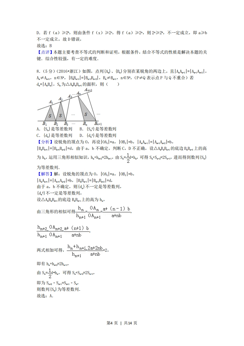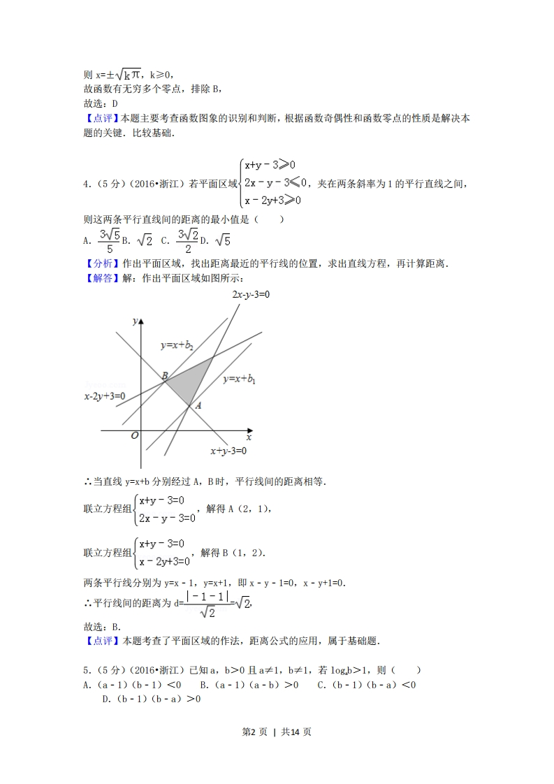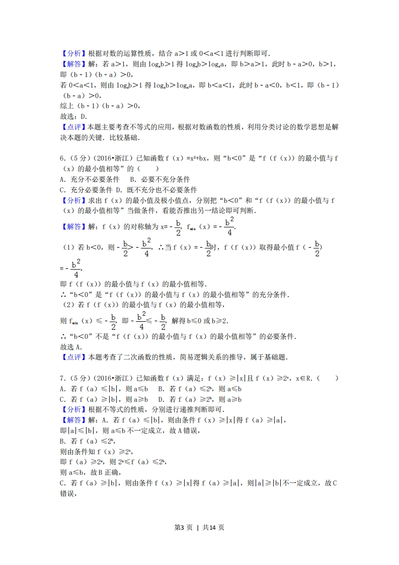 1,则由1ogb>1得1ogb>loga,即b>a>1,此时b-a>0,b>1,即(b-1)(b-a)>0,若01得1ogb>loga,即b0,综上(b-1)(b-a)>0,故选:D.【点评】本题主要考查不等式的应用,根据对数函数的性质,利用分类讨论的数学思想是解决本题的关键.比较基础。6.(5分)(2016·浙江)己知函数f(x)=x2+bx,则“b<0”是“f(f(x)的最小值与f(x)的最小值相等”的()A.充分不必要条件B.必要不充分条件C.充分必要条件D.既不充分也不必要条件【分析】求出f(x)的最小值及极小值点,分别把“b<0”和“f(f(x))的最小值与f(x)的最小值相等”当做条件,看能否推出另一结论即可判断,【解答】解:「(x)的对称轴为x=-与天.():-子4(1)若b<0,则-b.b2∴当f(x)=-时,f(f(x)取得最小值f(-242s.624即f(f(x)的最小值与f(x)的最小值相等..“b<0”是“f(f(x)的最小值与f(x)的最小值相等”的充分条件.(2)若f(f(x)的最小值与f(x)的最小值相等,则fm(x)≤-点即.b22a≤-5,解得b≤0或b≥2.2∴,“b<0”不是“f(f(x)的最小值与f(x)的最小值相等”的必要条件.故选A.【点评】本题考查了二次函数的性质,简易逻辑关系的推导,属于基础题,7.(5分)(2016·浙江)己知函数f(x)满足:f(x)≥|x且f(x)≥2,x∈R.()A.若f(a)≤|bl,则a≤bB.若f(a)≤2,则a≤bC.若f(a)≥lb,则a≥bD.若f(a)≥2,则a≥b【分析】根据不等式的性质,分别进行递推判断即可.【解答】解:A.若f(a)≤lb|,则由条件f(x)≥|x得f(a)≥|a,即la≤b,则a≤b不一定成立,故A错误,B.若f(a)≤2,则由条件知f(x)≥2,即f(a)≥2,则2a≤f(a)≤2,则a≤b,故B正确,C.若f(a)≥lbl,则由条件f(x)≥|x得f(a)≥|al,则lal≥bl不一定成立,故C错误,第3页|共14页
