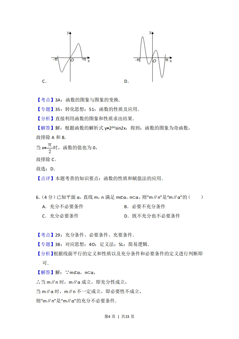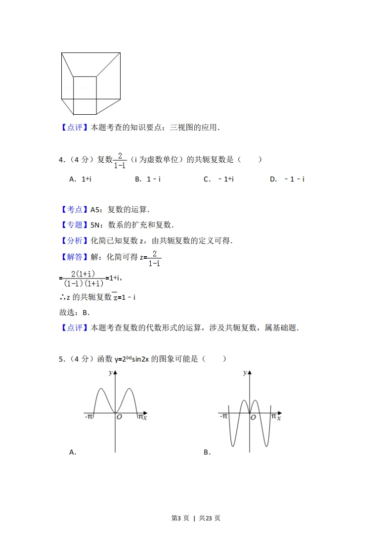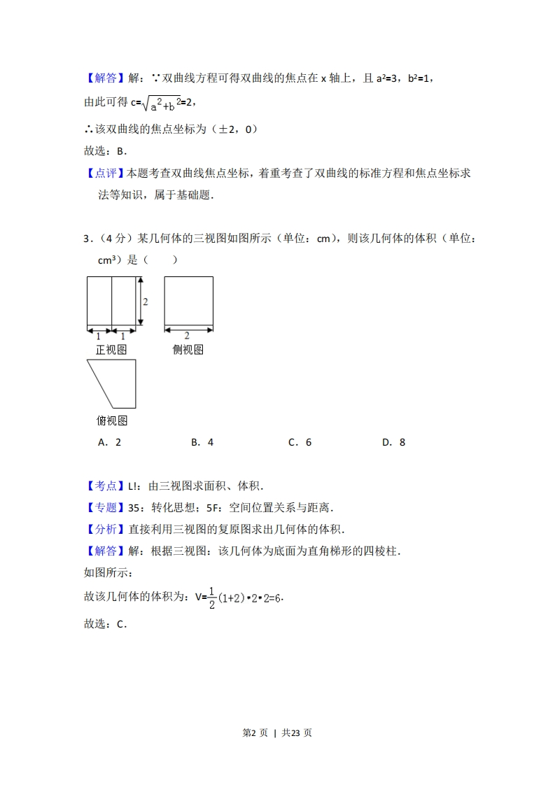 2018年浙江省高考数学试卷套考答案与试愿解析一、选择题:本大题共10小题,每小题4分,共40分。在每小题给出的四个选项中,只有一项是符合题目要求的。1.(4分)已知全集U={1,2,3,4,5},A={1,3},则CuA=()A.0B.{1,3}C.{2,4,5}D.{1,2,3,4,5}【考点】1F:补集及其运算.【分析】根据补集的定义直接求解:CuA是由所有属于集合U但不属于A的元素构成的集合.【解答】解:根据补集的定义,CuA是由所有属于集合U但不属于A的元素构成的集合,由已知,有且仅有2,4,5符合元素的条件.CuA={2,4,5}故选:C.【点评】本题考查了补集的定义以及简单求解,属于简单题.2.(4分)双曲线Xy=1的焦点坐标是()】A.(-√2,0),(√2,0)B.(-2,0),(2,0)C.(0,-√2),(0,√2)D.(0,-2),(0,2)【考点】KC:双曲线的性质.【专题】34:方程思想:40:定义法:5D:圆锥曲线的定义、性质与方程,【分析】根据双曲线方程,可得该双曲线的焦点在x轴上,由平方关系算出C=√a2+b2=2,即可得到双曲线的焦点坐标。第1页|共23页【解答】解:,双曲线方程可得双曲线的焦点在×轴上,且a2=3,b2=1,由此可得c=√a2+b2=2,∴.该双曲线的焦点坐标为(±2,0)故选:B【点评】本题考查双曲线焦点坐标,着重考查了双曲线的标准方程和焦点坐标求法等知识,属于基础题.3,(4分)某几何体的三视图如图所示(单位:cm),则该几何体的体积(单位:cm3)是()1,正视图侧视图俯视图A.2B.4C.6D.8【考点】L!:由三视图求面积、体积.【专题】35:转化思想:5F:空间位置关系与距离.【分析】直接利用三视图的复原图求出几何体的体积.【解答】解:根据三视图:该几何体为底面为直角梯形的四棱柱,如图所示:故该几何体的体积为:V=号1+2)22=6故选:C.第2页|共23页【点评】本题考查的知识要点:三视图的应用.4.(4分)复数2.(1为虚数单位)的共轭复数是()1-1A.1+iB.1-iC.-1+iD.-1-i【考点】A5:复数的运算.【专题】5N:数系的扩充和复数.【分析】化简已知复数z,由共轭复数的定义可得.【解答】解:化简可得z=21-i2(1+i)+1,∴.z的共轭复数z=1-1故选:B【点评】本题考查复数的代数形式的运算,涉及共轭复数,属基础题.5.(4分)函数y=2sin2x的图象可能是()AB第3页|共23页