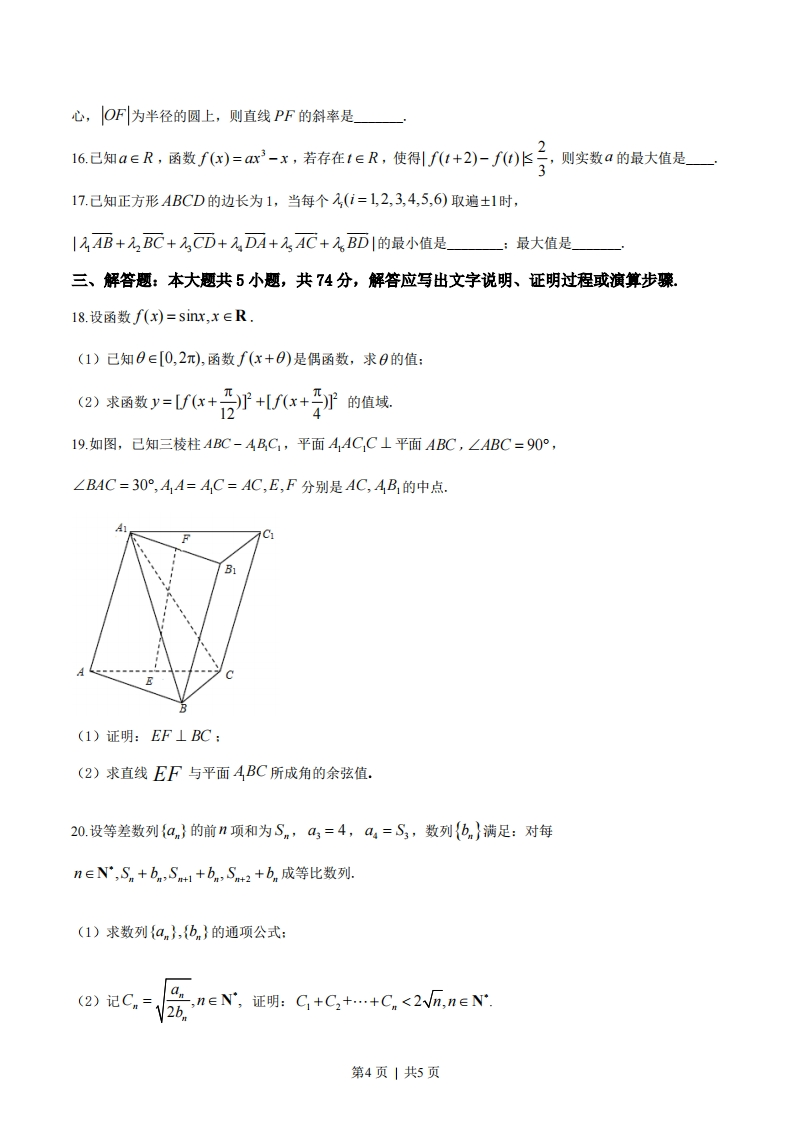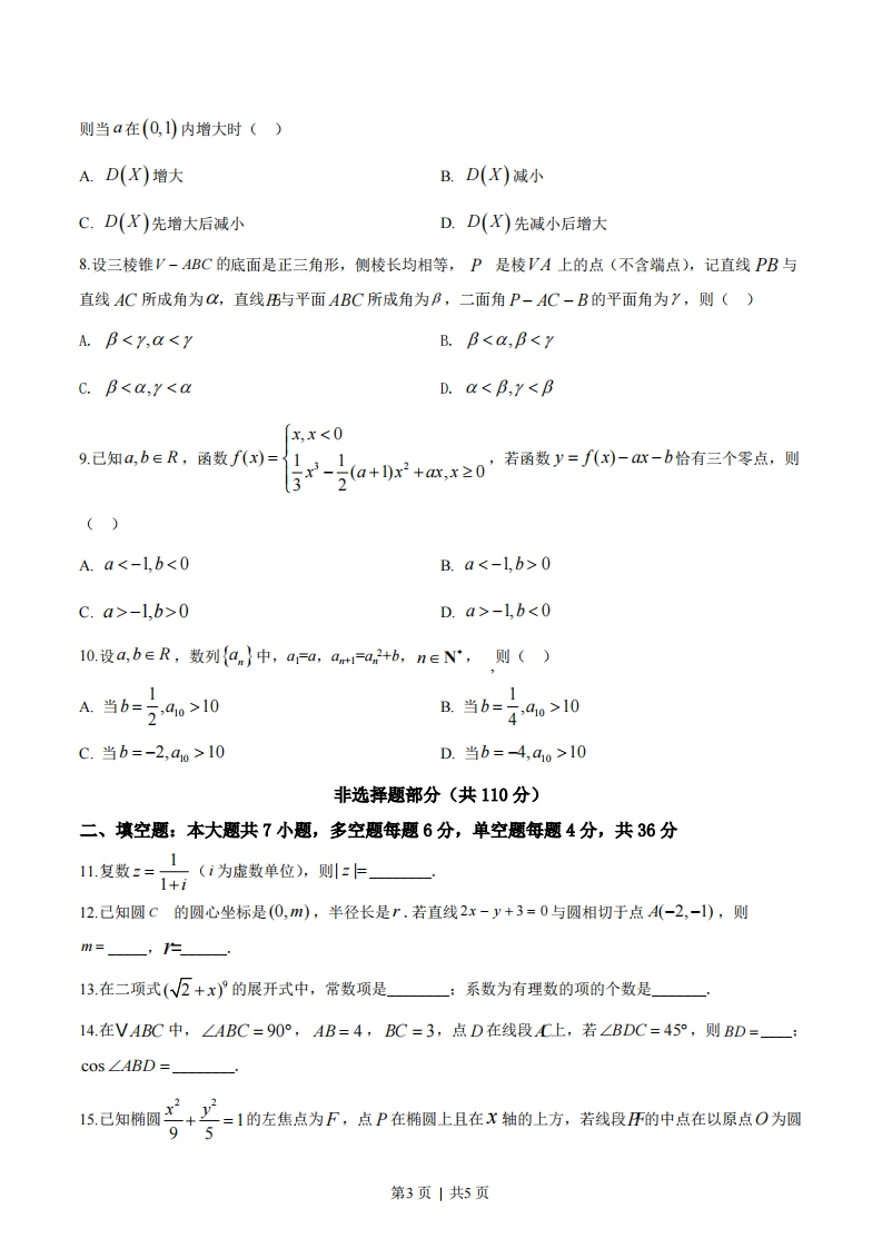 0c.a>-1,b>0D.a>-l,b<010.设a,b∈R,数列{an}中,a=a,a1=a,2+b,n∈N,则()A当b=240>10B.当b=440>10C.当b=-2,ao>10D.当b=4,a0>10非选释题部分(共110分)二、填空题:本大题共7小题,多空题每题6分,单空题每题4分,共36分11复数:=1(i为虚数单位),则z卡1+i12.己知圆C的圆心坐标是(0,m),半径长是r.若直线2x-y+3=0与圆相切于点A(-2,-1),则m=,1片13.在二项式(√2+x)°的展开式中,常数项是:系数为有理数的项的个数是14.在VABC中,∠ABC=90°,AB=4,BC=3,点D在线段C上,若∠BDC=45°,则BD=:COS∠ABD=15.已知椭圆二+上=1的左焦点为下,点P在椭圆上且在x轴的上方,若线段F的中点在以原点0为圆95第3页|共5页