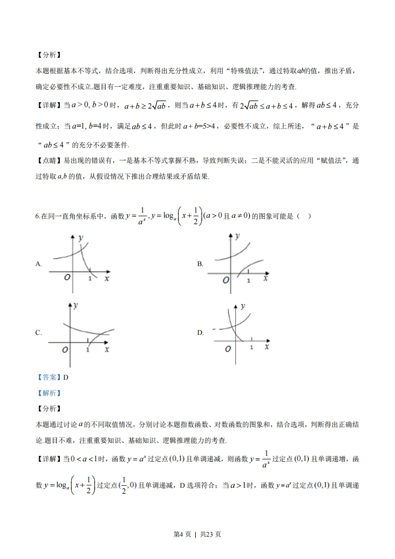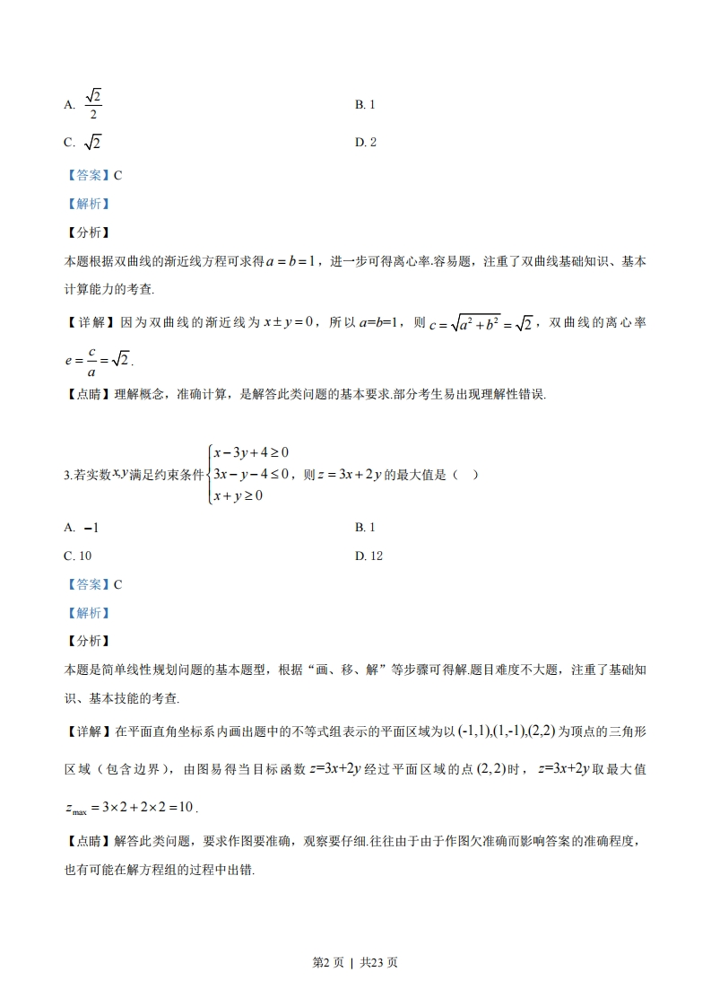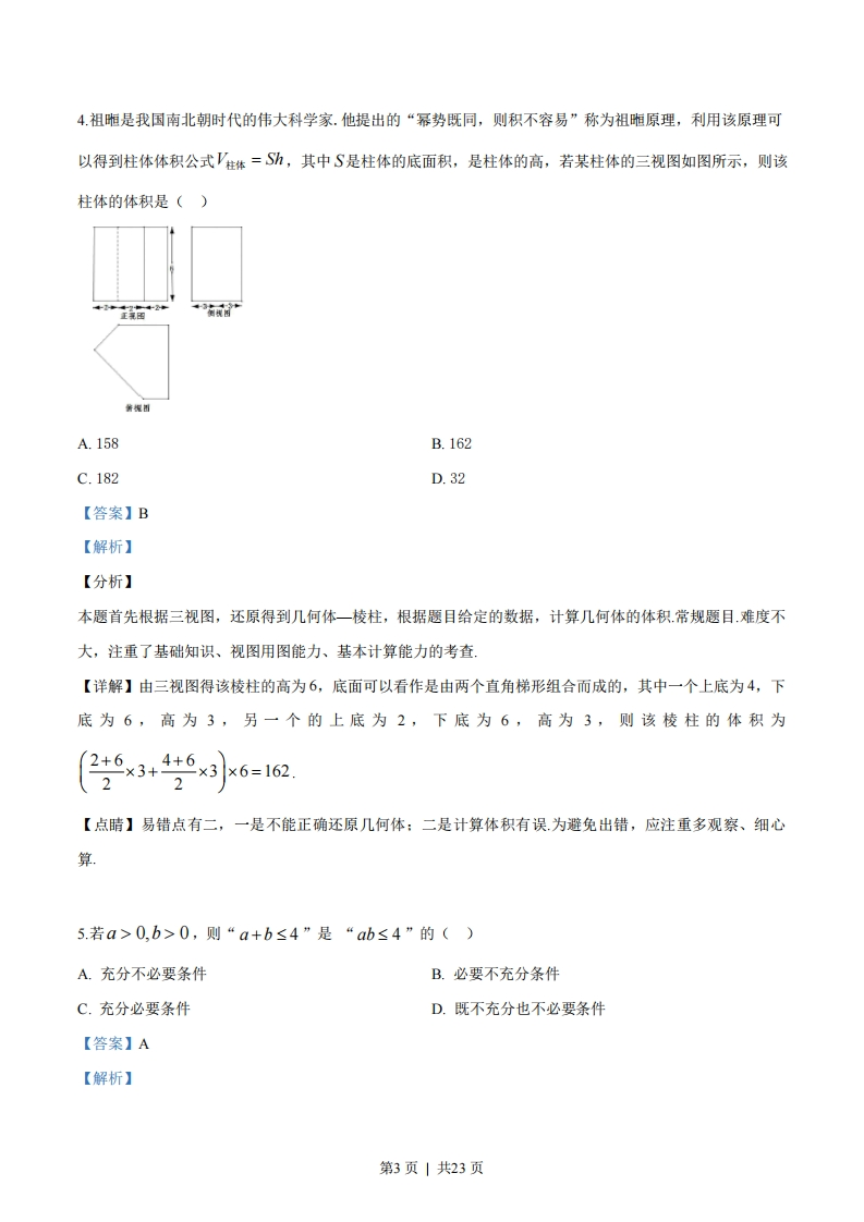 2019年普通高等学校招生全国统一考试(浙江卷)数学参考公式:若事件A,B互斥,则P(A+B)=P(A)+P(B)柱体的体积公式V=Sh若事件A,B相互独立,则P(AB)=P(A)P(B)其中S表示柱体的底面积,h表示柱体的高若事件A在一次试验中发生的概率是P,则n次锥体的体积公式V=Sh独立重复试验中事件A恰好发生k次的概率3P.(k)=Cp*(1-p)-(k=0,1,2,…,m)其中S表示锥体的底面积,h表示锥体的高球的表面积公式S=4πR2台体的体积公式其中S,S2分别表示台体的上、下底面积,h表球的体积公式-R其中R表示球的半径示台体的高选择题部分(共40分)一、选择题:本大题共10小题,每小题4分,共40分,在每小题给出的四个选项中,只有一项是符合题目要求的,1.已知全集={1,012,3},集合4=0,12,B=(-10,,则(G40nB=()A.{-B.{0,1}C.{-1,2,3}D.{1,0,13}【答案】A【解析】【分析】本题借根据交集、补集的定义可得容易题,注重了基础知识、基本计算能力的考查【详解】CuA={-1,3},则(CuA)∩B={-l【点睛】易于理解集补集的概念、交集概念有误。2.渐近线方程为x士y=0的双曲线的离心率是()第1页1共23页v2A.2B.1c.5D.2【答案】C【解析】【分析】本题根据双曲线的渐近线方程可求得=b=1,进一步可得离心率.容易题,注重了双曲线基础知识、基本计算能力的考查【详解】因为双曲线的渐近线为x±y=0,所以a=b-1,则c=√a2+b2=√2,双曲线的离心率e-c-v2a【点睛】理解概念,准确计算,是解答此类问题的基本要求部分考生易出现理解性错误x-3y+4≥03若实数xy满足约束条件3x-y-4≤0,则z=3x+2y的最大值是()x+y≥20A.-1B.1C.10D.12【答案】C【解析】【分析】本题是简单线性规划问题的基本题型,根据“画、移、解”等步骤可得解题目难度不大题,注重了基础知识、基本技能的考查。【详解】在平面直角坐标系内画出题中的不等式组表示的平面区域为以(~1,),(1,-1),(2,2)为顶点的三角形区域(包含边界),由图易得当目标函数z=3x+2y经过平面区域的点(2,2)时,z=3x+2y取最大值2x=3×2+2×2=10【点睛】解答此类问题,要求作图要准确,观察要仔细往往由于由于作图欠准确而影响答案的准确程度,也有可能在解方程组的过程中出错第2页|共23页4祖啦是我国南北朝时代的伟大科学家.他提出的“幂势既同,则积不容易”称为祖暅原理,利用该原理可以得到柱体体积公式V柱体=Sh,其中S是柱体的底面积,是柱体的高,若某柱体的三视图如图所示,则该柱体的体积是()著规图A.158B.162C.182D.32【答案】B【解析】【分析】本题首先根据三视图,还原得到几何体一棱柱,根据题目给定的数据,计算几何体的体积常规题目难度不大,注重了基础知识、视图用图能力、基本计算能力的考查,【详解】由三视图得该棱柱的高为6,底面可以看作是由两个直角梯形组合而成的,其中一个上底为4,下底为6,高为3,另一个的上底为2,下底为6,高为3,则该棱柱的体积为2生x3+4生x2*3×6=162【点睛】易错点有二,一是不能正确还原几何体:二是计算体积有误.为避免出错,应注重多观察、细心算5.若a>0,b>0,则“a+b≤4”是“ab≤4”的()A.充分不必要条件B.必要不充分条件C.充分必要条件D.既不充分也不必要条件【答案】A【解析】第3页|共23页