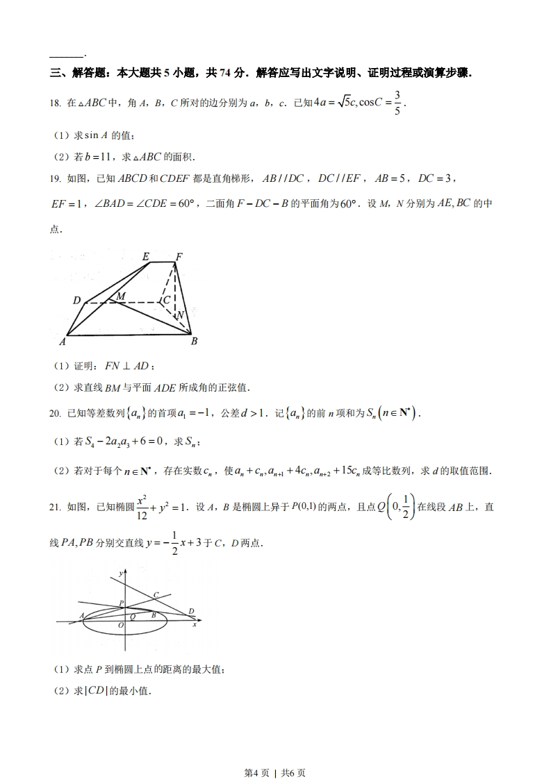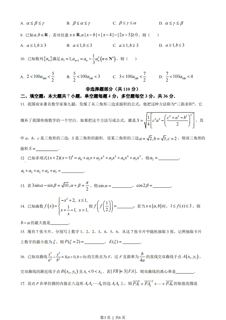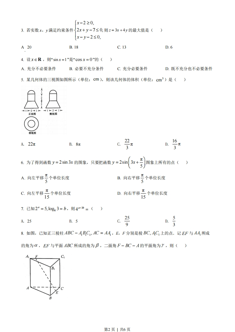 2022年普通高等学校招生全国统一考试(浙江卷)数学姓名准考证号本试题卷分选择题和非选择题两部分.全卷共4页,选择题部分1至3页;非选择题部分3至4页.满分150分,考试时间120分钟.考生注意:1,答题前,请务必将自己的姓名、准考证号用黑色字迹的签字笔或钢笔分别填写在试题卷和答题纸规定的位置上2,答题时,请按照答题纸上“注意事项”的要求,在答题纸相应的位置上规范作答,在本试题卷上的作答一律无效参考公式:如果事件A,B互斥,则柱体的体积公式P(A+B)=P(A)+P(B)V=Sh如果事件A,B相互独立,则其中S表示柱体的底面积,h表示柱体的高P(AB)=P(A·P(B)锥体的体积公式若事件A在一次试验中发生的概率是p,则n次v独立重复试验中事件A恰好发生k次的概率其中S表示锥体的底面积,h表示锥体的高Pn(k)=Cp*(1-p)m-*(k=0,1,2,…,n)球的表面积公式台体的体积公式S=4πR2r=s+网+Ss)h球的体积公式其中S,S2表示台体的上、下底面积,V-4IR3h表示台体的高其中R表示球的半径选择题部分(共40分)一、选择题:本大题共10小题,每小题4分,共40分.在每小题给出的四个选项中,只有一项是符合题目要求的,1.设集合A={1,2,B={2,4,6},则AUB=()A.{2B.{L,2}C.{2,4,6}D.{1,2,4,6}2.己知a,b∈R,a+3i=(b+)i(i为虚数单位),则()A.a=1,b=-3B.a=-1,b=3C.a=-1,b=-3D.a=1,b=3第1页」共6页x-220,3.若实数x,y满足约束条件2x+y-7≤0,则:=3x+4y的最大值是()x-y-2≤0,A20B.18C.13D.64.设x∈R,则“sinx=1”是“cosx=0”的()A.充分不必要条件B.必要不充分条件C.充分必要条件D.既不充分也不必要条件5.某几何体的三视图如图所示(单位:cm),则该几何体的体积(单位:cm3)是()41-2州1正视图中釉提图16A.22π22B.8πC.D.36.为了得到函数y=2sin3x的图象,只要把函数y=2sin3r+图象上所有的点()5A.向左平移工个单位长度B.向右平移刀个单位长度5C.向左平移工个单位长度个单位长度15D.向右平移157.己知2=5,10gs3=b,则44-6=()25A.25B.5C.50.8.如图,己知正三棱柱ABC-ABC,AC=AA,E,F分别是棱BC,AC1上的点.记EF与AA,所成的角为C,EF与平面ABC所成的角为B,二面角F-BC-A的平面角为Y,则()AC第2页|共6页A.a≤B≤YB.B≤a≤YC.B≤y≤aD.am≤y≤B9.己知a,b∈R,若对任意x∈R,a|x-b|+|x-4|-|2x-520,则()A.a≤1,b23B.a≤1,b≤3C.a21,b≥3D.a21,b≤310.已知数列{a,}满足a=lam=a,-(n∈N)则()A.2c10m109c3k1i0aw号70.<100am<4非选择题部分(共110分)二、填空题:本大题共7小题,单空题每题4分,多空题每空3分,共36分.11.我国南宋著名数学家秦九韶,发现了从三角形三边求面积的公式,他把这种方法称为“三斜求积”,它填补了我国传统数学的一个空白.如果把这个方法写成公式,就是S中a,b,c是三角形的三边,S是三角形的面积.设某三角形的三边a=√互,b=√5,c=2,则该三角形的面积S=12已知多项式(x+2)(x-1)=a6+ax+a2x2+ar3+ax+ax3,则a2=】a1+a2+a3+a4+a5=13.若3sna-snB=i而,a+B=牙,则sma=cos2B=-x2+2,x≤114.己知函数f(x)=:若当x∈[a,b]时,1≤f(x)≤3,则b-a的最大值是」15.现有7张卡片,分别写上数字1,2,2,3,4,5,6.从这7张卡片中随机抽取3张,记所抽取卡片上数字的最小值为5,则P(5=2)=,E(5)=16已知双储线号-卡=0>06>0的左焦点为片过F且斜事为的直线交双曲线于点A(:,),Aa交双曲线的渐近线于点B(x2,2)且x<0<,2·若|FB卡3引FA,则双曲线的离心率是17.设点P在单位圆的内接正八边形442…A的边A4上,则P+PA+…+P丞的取值范围是第3页」共6页