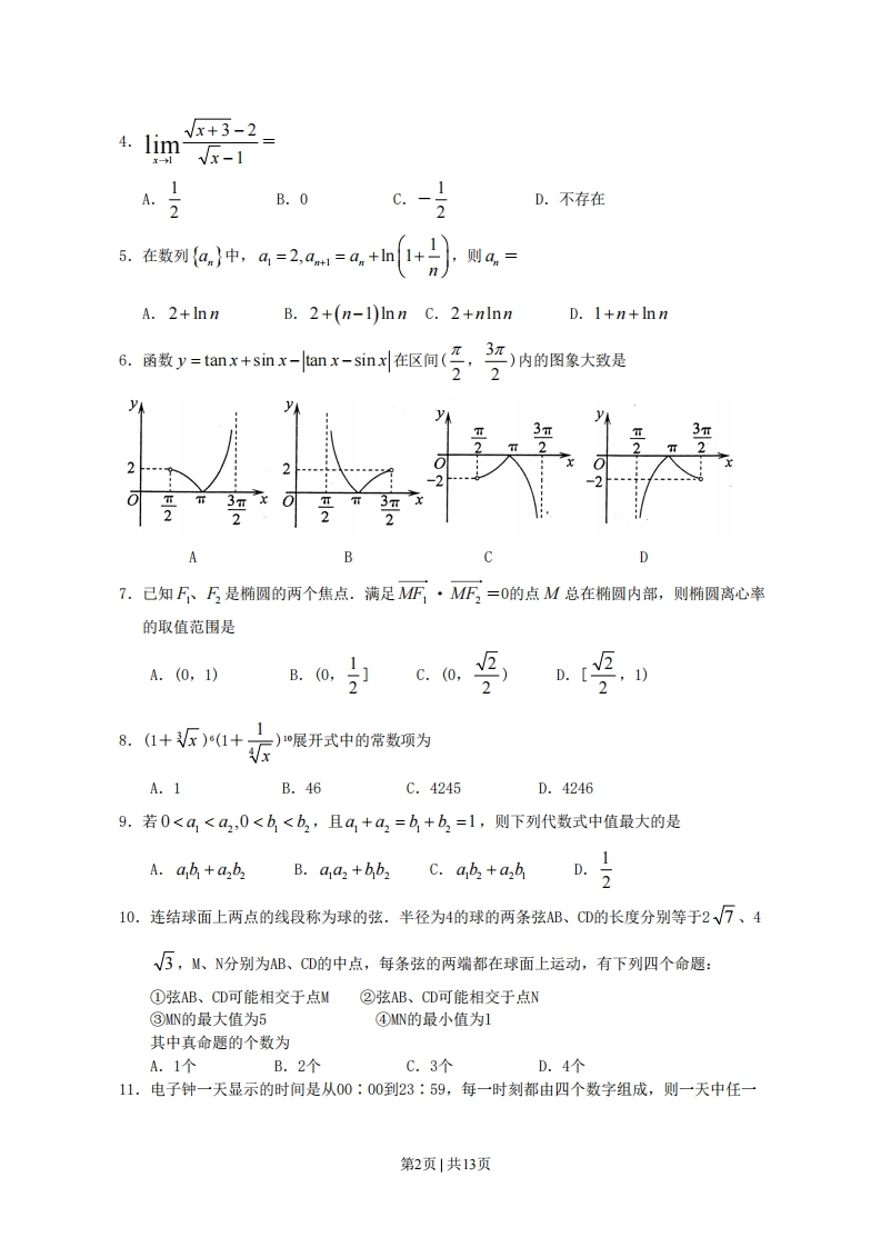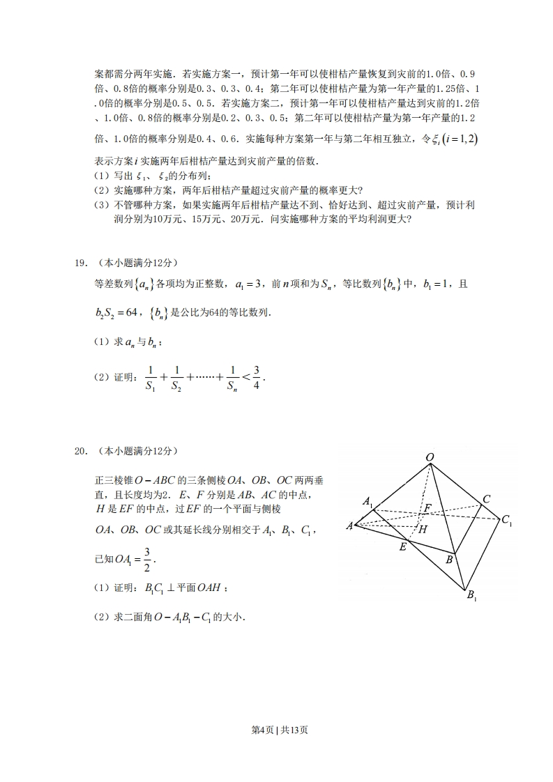0)的焦点作倾斜角为30°的直线,与抛物线分别交于A、两点(AF点在轴左侧),则FB16.如图1,一个正四棱柱形的密闭容器水平放置,其底部镶嵌了同底的正四棱锥形实心装饰块,容器内盛有α升水时,水面恰好经过正四棱锥的顶点P,如果将容器倒置,水面也恰好过点P(图2).有下列四个命题:A.正四棱锥的高等于正四棱柱高的一半B.将容器侧面水平放置时,水面也恰好过点PC.任意摆放该容器,当水面静止时,水面都恰好经过点PD.若往容器内再注入a升水,则容器恰好能装满其中真命题的代号是·(写出所有真命题的代号)图1图2三.解客愿:本大题共6小题,共74分.解客应写出文字说明,证明过程或演算步骤,17.(本小题满分12分)在△ABC中.a、b、c分别为角A、B、C所对的边长,=213.tan 4+BtC2+tan-2=4,sin B sin C=cos:4求级么、。18.(本小题满分12分)因冰雪灾害,某柑桔基地果林严重受损,为此有关专家提出两种拯救果树的方案,每种方第3页|共13页