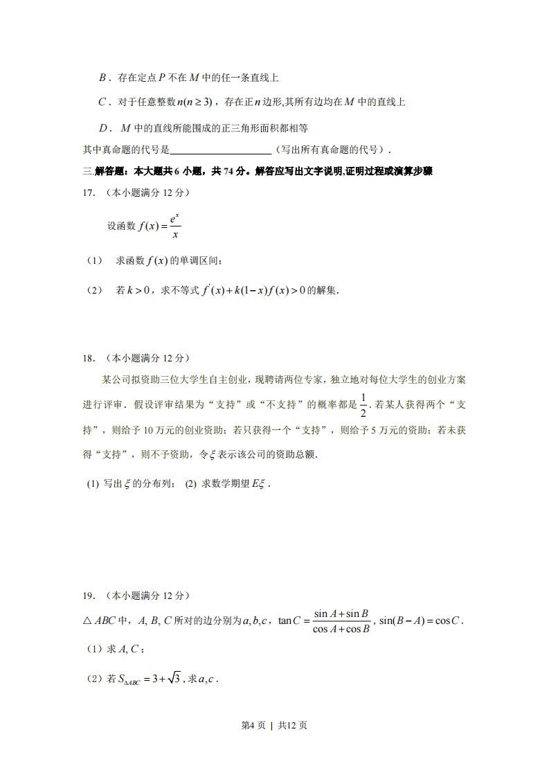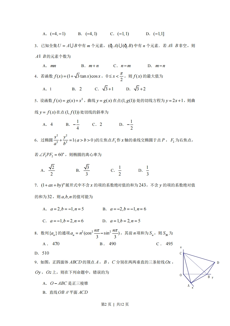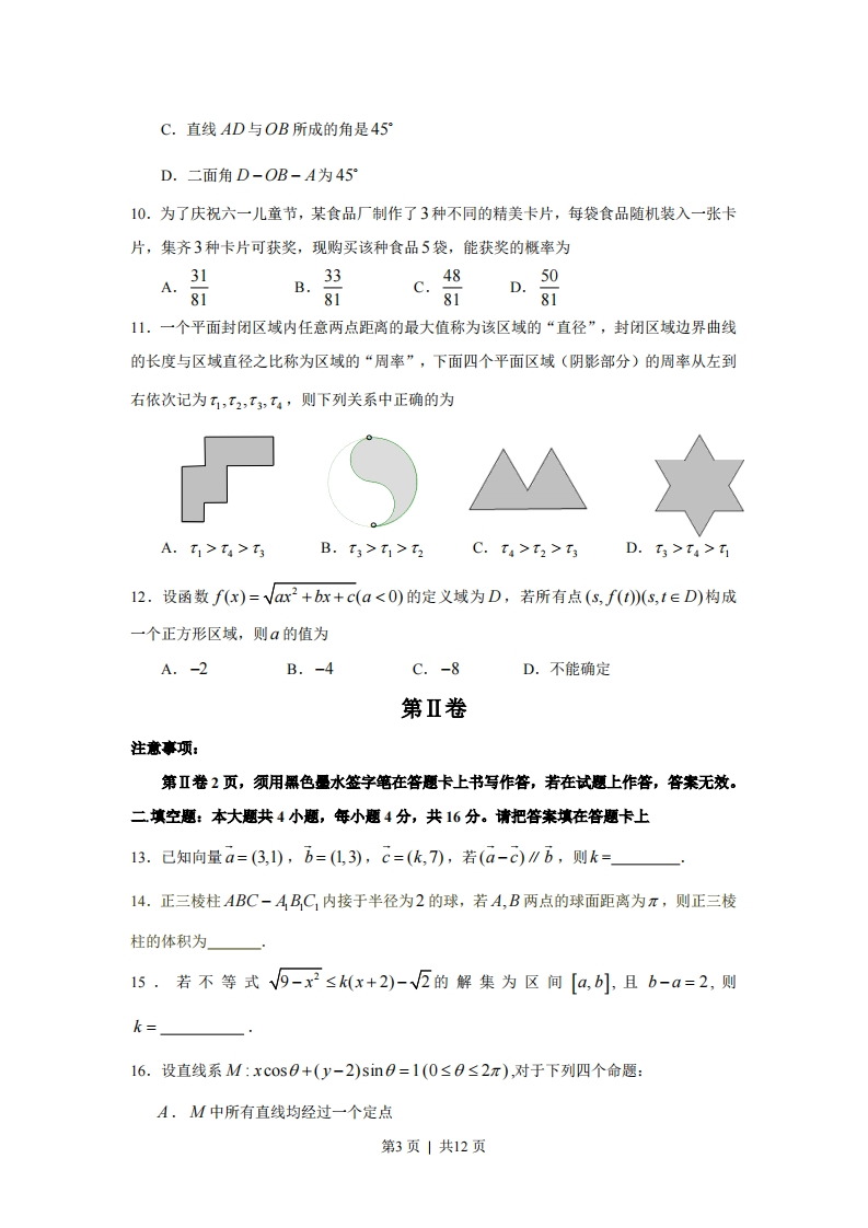 2009年江西高考理科数学试题及答案本试卷分第I卷(选择题)和第Ⅱ卷(非选择题)两部分,第I卷1至2页,第Ⅱ卷3至4页,共150分。第I卷考生注意:1.答题前,考生务必将自己的准考证号、姓名填写在答题卡上,考生要认真核对答题卡上粘贴的条形码的“准考证号、姓名、考试科目”与考生本人准考证号、姓名是否一致。2.第I卷每小题选出答案后,用2B铅笔把答题卡上对应题目的答案标号涂黑,如需改动,用橡皮擦干净后,再选涂其他答案标号。第Ⅱ卷用黑色墨水签字笔在答题卡上作答。若在试题卷上作答,答案无效。3.考试结束,监考员将试题卷、答题卡一并收回。参考公式如果事件A,B互斥,那么球的表面积公式P(A+B)=P(A)+P(B)S=4πR2如果事件A,B,相互独立,那么其中R表示球的半径P(A·B)=P(A)·P(B)球的体积公式如果事件A在一次试验中发生的概率是p,那么FRn次独立重复试验中恰好发生k次的概率其中R表示球的半径P.(k)=Cp*(1-p)"-一,选择题:本大题共12小题,每小题5分,共60分。在每小题给出的四个选项中,只有一项是符合题目要求的。1.若复数z=(x2-1)+(x-1)i为纯虚数,则实数x的值为A.-1B.0C.1D.-1或12.函数y=In(x+1)一的定义域为V-x2-3x+第1页|共12页A.(-4,-1)B.(-4,1)c.(-1,1)D.(-1,1]3.己知全集U=AUB中有m个元素,(4)U(B)中有n个元素.若AIB非空,则A丨B的元素个数为A.mnB.m+nC.n-mD.m-n4.若函数fx)=1+V5tanx)cosx,0≤r<7,则f)的最大值为A.1B.2C.V5+1D.V5+25.设函数f(x)=g(x)+x2,曲线y=g(x)在点(L,g(1)处的切线方程为y=2x+1,则曲线y=f(x)在点(L,f(I)处切线的斜率为A.4B.-1C.21D.-426。过椭圆云+=1(a>b>0)的左焦点作x轴的垂线交椭圆于点P,5为右焦点,若∠FPF=60°,则椭圆的离心率为A.②B.23c.I7.(1+ax+y)”展开式中不含x的项的系数绝对值的和为243,不含y的项的系数绝对值的和为32,则a,b,n的值可能为A.a=2,b=-1,n=5B.a=-2.b=-1.n=6C.a=-1,b=2,n=6D.a=1,b=2,n=58.数列{a}的通项a,=r(cos3-sn3,其前”项和为S,则S为3A.470B.490C.495D.5109.如图,正四面体ABCD的顶点A,B,C分别在两两垂直的三条射线Ox,Oy,Oz上,则在下列命题中,错误的为A.O-ABC是正三棱锥B.直线OB∥平面ACD第2页|共12页C.直线AD与OB所成的角是45D.二面角D-OB-A为4510.为了庆祝六一儿童节,某食品厂制作了3种不同的精美卡片,每袋食品随机装入一张卡片,集齐3种卡片可获奖,现购买该种食品5袋,能获奖的概率为B.33C.48508181D.8111.一个平面封闭区域内任意两点距离的最大值称为该区域的“直径”,封闭区域边界曲线的长度与区域直径之比称为区域的“周率”,下面四个平面区域(阴影部分)的周率从左到右依次记为T,T2,T3,T,则下列关系中正确的为)MA.t1>T4>T3B.T3>t1>T2C.t4>T2>T3D.T>T>12.设函数f(x)=√ar2+br+c(a<0)的定义域为D,若所有点(s,f(t)(s,t∈D)构成一个正方形区域,则a的值为A.-2B.-4C.-8D.不能确定第Ⅱ卷注意事项:第Ⅱ卷2页,须用黑色量水签字笔在答题卡上书写作答,若在试题上作答,答案无效。二填空题:本大题共4小题,每小题4分,共16分。请把答案填在答题卡上13.已知向量a=(3,1),b=(1,3),c=(k,7),若(a-c∥b,则k=14.正三棱柱ABC-AB,C1内接于半径为2的球,若A,B两点的球面距离为π,则正三棱柱的体积为15.若不等式V9-x2≤k(x+2)-√5的解集为区间[a,b],且b-a=2,则k=16.设直线系M:xcos0+(y-2)sin0=1(0≤0≤2π),对于下列四个命题:A.M中所有直线均经过一个定点第3页|共12页