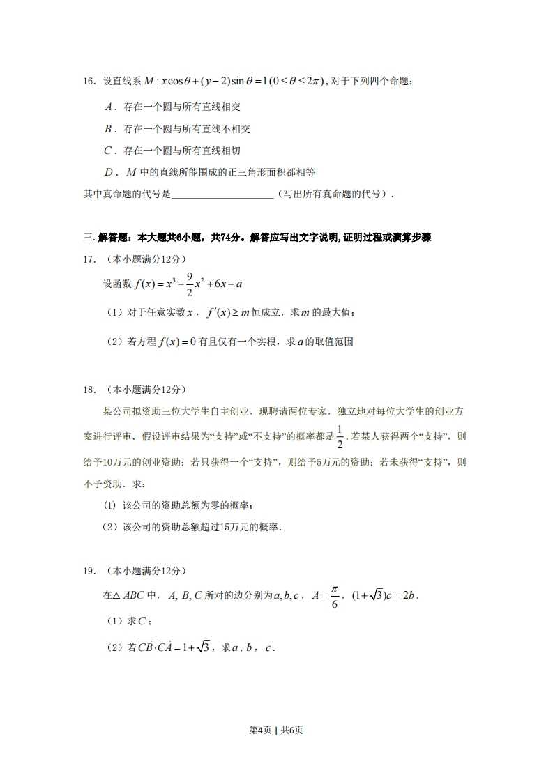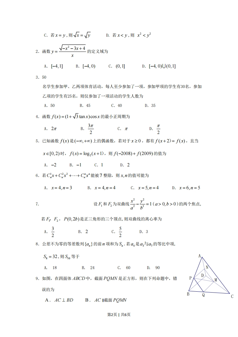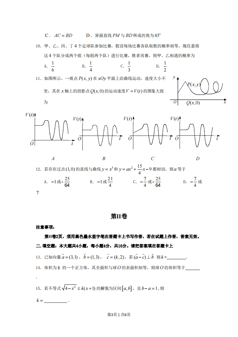 2009年江西高考文科数学试题本试卷分第I卷(选择题)和第Ⅱ卷(非选择题)两部分,第I卷1至2页,第Ⅱ卷3至4页,共150分。考生注意:1.答题前,考生务必将自己的准考证号、姓名填写在答题卡上,考生要认真核对答题卡上粘贴的条形码的“准考证号、姓名、考试科目”与考生本人准考证号、姓名是否一致。2.第I卷每小题选出答案后,用2B铅笔把答题卡上对应题目的答案标号涂黑,如需改动,用橡皮擦干净后,再选涂其他答案标号。第Ⅱ卷用黑色墨水签字笔在答题卡上书写作答。在试题卷上作答,答案无效。3.考试结束,监考员将试题卷、答题卡一并收回。参考公式如果事件A,B互斥,那么球的表面积公式P(A+B)=P(A)+P(B)S=4πR2如果事件A,B,相互独立,那么其中R表示球的半径P(A·B)=P(A)P(B)球的体积公式如果事件A在一次试验中发生的概率是p,那么rn次独立重复试验中恰好发生k次的概率其中R表示球的半径P(k)=Cp(1-p)"-第卷一,选择题:本大题共12小题,每小题5分,共60分。在每小题给出的四个选项中,只有一项是符合题目要求的、1.下列命题是真命题的为A若上=,则x=yB.若x2=1,则x=1x y第1页1共6页C.若x=y,则VF=√D.若x0,b>0)的两个焦点,若F,F,P(0,2b)是正三角形的三个顶点,则双曲线的离心率为3A.B.2c.5D.38.公差不为零的等差数列{an}的前n项和为Sn.若a,是a3与a,的等比中项,Sg=32,则So等于A.18B.24C.60D.909.如图,在四面体ABCD中,截面PQMN是正方形,则在下列命题中,错误的为A.AC⊥BDB.ACI截面PQMW第2页1共6页C.AC=BDD.异面直线PM与BD所成的角为4510.甲、乙、丙、丁4个足球队参加比赛,假设每场比赛各队取胜的概率相等,现任意将这4个队分成两个组(每组两个队)进行比赛,胜者再赛,则甲、乙相遇的概率为4164C.1311.如图所示,一质点P(x,y)在xOy平面上沿曲线运动,速度大小不P(x,)变,其在x轴上的投影点Q(x,O)的运动速度V=V(t)的图象大致为Q(x,0)V(t)年典V(t)V(BD12.若存在过点(10)的直线与曲线y=式和y=m2+15x-9都相切,则a等于4A.-1或-2564B.-1或21、7或-254C.-4或64D.4或第卷注意事项:第Ⅱ卷2页,须用黑色量水签字笔在答题卡上书写作答,若在试愿上作答,答案无效。二.填空题:本大题共4小题,每小题4分,共16分。请把答案填在答题卡上13.己知向量a=(3,1),b=(1,3),c=(k,2),若(a-c)⊥b则k=」14.体积为8的一个正方体,其全面积与球O的表面积相等,则球O的体积等于15.若不等式√4-x2≤k(x+1)的解集为区间[a,b],且b-a=1,则k=第3页1共6页