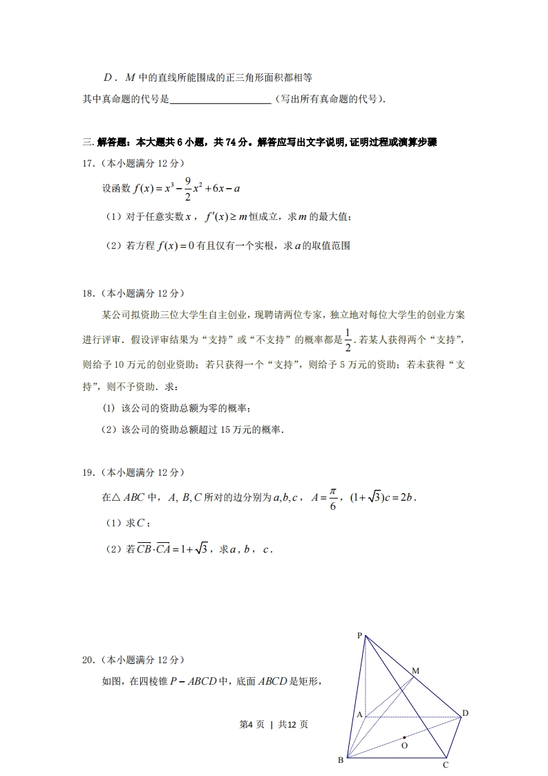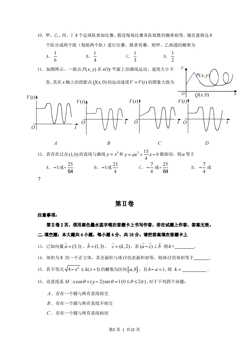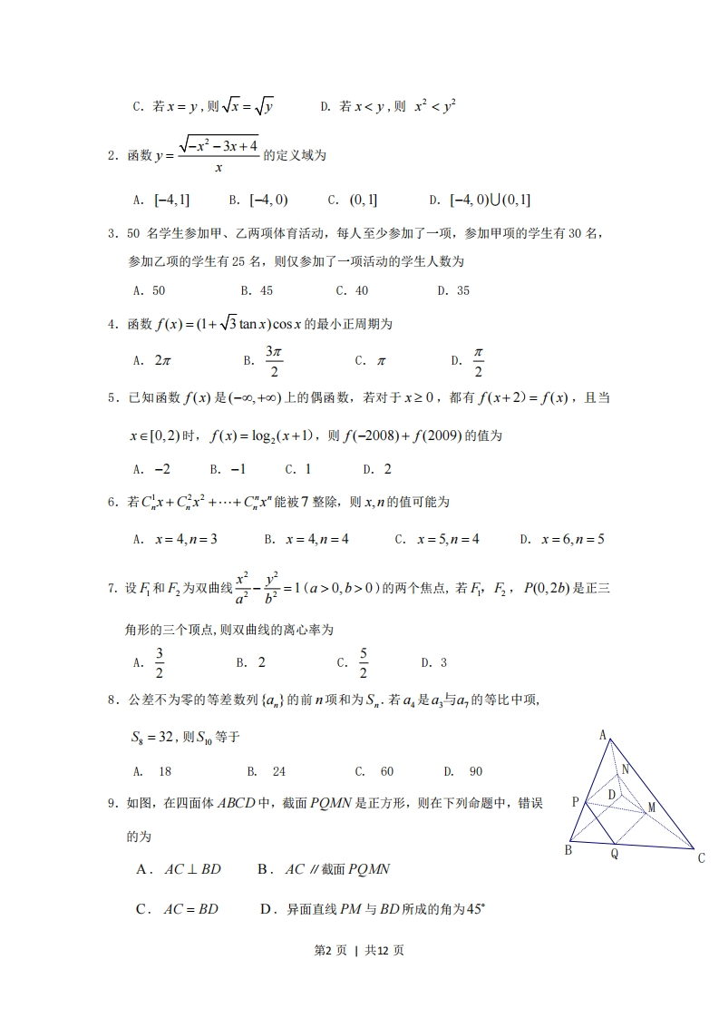 2009年江西高考文科数学试题及答案本试卷分第I卷(选择题)和第Ⅱ卷(非选择题)两部分,第I卷1至2页,第Ⅱ卷3至4页,共150分。考生注意:1.答题前,考生务必将自己的准考证号、姓名填写在答题卡上,考生要认真核对答题卡上粘贴的条形码的“准考证号、姓名、考试科目”与考生本人准考证号、姓名是否一致。2.第I卷每小题选出答案后,用2B铅笔把答题卡上对应题目的答案标号涂黑,如需改动,用橡皮擦干净后,再选涂其他答案标号。第Ⅱ卷用黑色墨水签字笔在答题卡上书写作答。在试题卷上作答,答案无效。3.考试结束,监考员将试题卷、答题卡一并收回。参考公式如果事件A,B互斥,那么球的表面积公式P(A+B)=P(A)+P(B)S=4πR2如果事件A,B,相互独立,那么其中R表示球的半径P(A·B)=P(A)P(B)球的体积公式如果事件A在一次试验中发生的概率是p,那么v-iaRn次独立重复试验中恰好发生k次的概率其中R表示球的半径P(k)=Cp(1-p)"-第I卷一,选释题:本大题共12小题,每小题5分,共60分。在每小题给出的四个选项中,只有一项是符合题目要求的。1.下列命题是真命题的为A若上=,则x=yB.若x2=1,则x=1x y第1页|共12页C.若x=y,则VF=√D.若x0,b>0)的两个焦点,若F,FE,P(0,2b)是正三角形的三个顶点,则双曲线的离心率为N.2B.2C.D.38.公差不为零的等差数列{an}的前n项和为Sm·若a是a3与a,的等比中项,Sg=32,则So等于A.18B.24C.60D.909.如图,在四面体ABCD中,截面PQMN是正方形,则在下列命题中,错误的为A.AC⊥BDB.AC∥截面PQNC.AC=BDD.异面直线PM与BD所成的角为45第2页|共12页10.甲、乙、丙、丁4个足球队参加比赛,假设每场比赛各队取胜的概率相等,现任意将这4个队分成两个组(每组两个队)进行比赛,胜者再赛,则甲、乙相遇的概率为血君11.如图所示,一质点P(x,y)在xOy平面上沿曲线运动,速度大小不P(x,y)变,其在x轴上的投影点Q(x,O)的运动速度V=V(t)的图象大致为00x,0)V(t)片t41512.若存在过点(1,0)的直线与曲线y=x3和y=ar2+二x-9都相切,则a等于42521725A.-1或-B.-1或C.-或-D.-或4464第Ⅱ卷注意事项:第Ⅱ卷2页,须用黑色量水签字笔在答题卡上书写作答,若在试题上作答,答案无效。二.填空题:本大题共4小题,每小题4分,共16分。请把答案填在答题卡上13.已知向量a=(3,1),6=(1,3),c=(k,2),若(a-c)1b则k=14.体积为8的一个正方体,其全面积与球O的表面积相等,则球O的体积等于15.若不等式√4-x2≤k(x+)的解集为区间[a,b],且b-a=1,则k=16.设直线系M:xcos0+(y-2)sin0=1(0≤0≤2π),对于下列四个命题:A.存在一个圆与所有直线相交B.存在一个圆与所有直线不相交C.存在一个圆与所有直线相切第3页|共12页