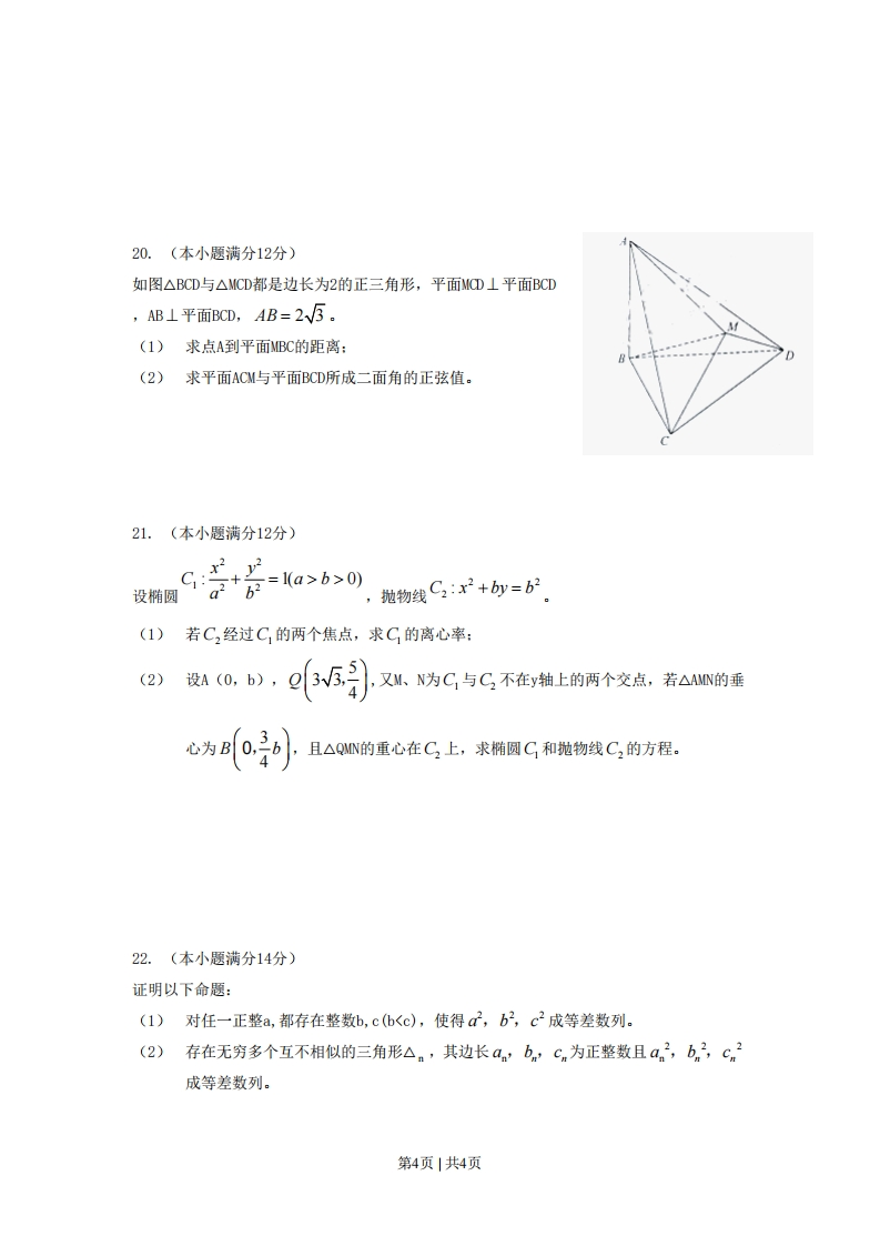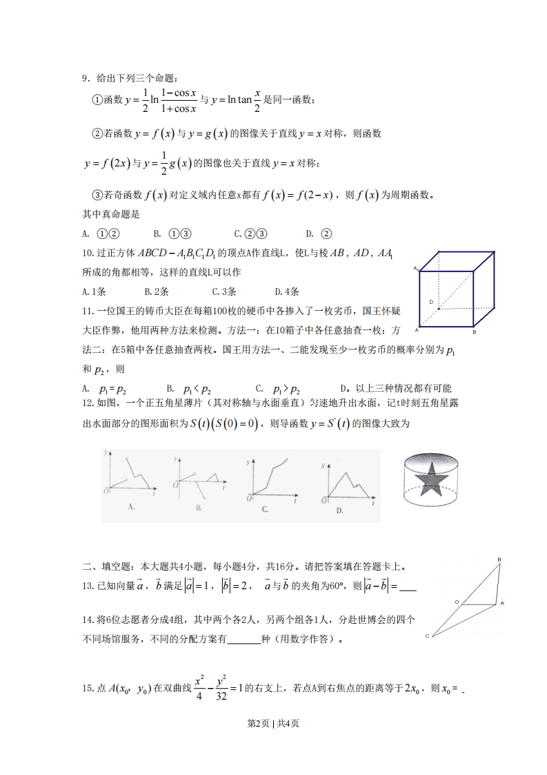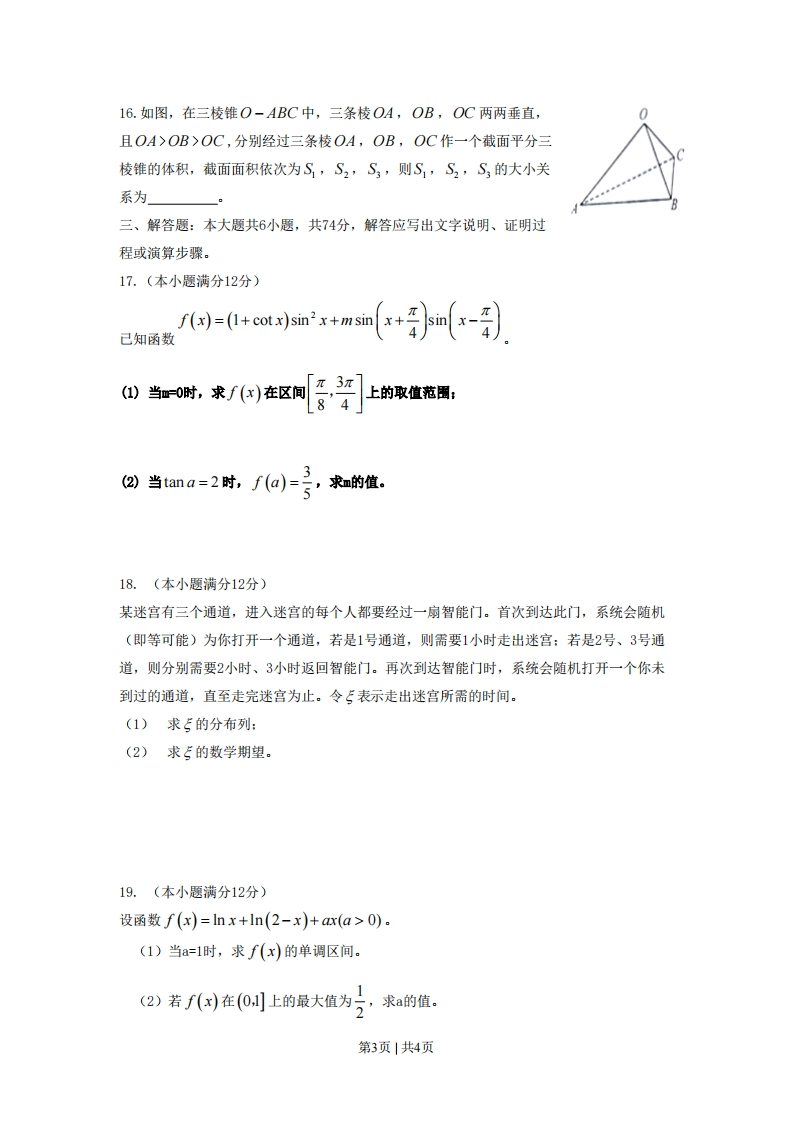 PzD。以上三种情况都有可能12.如图,一个正五角星薄片(其对称轴与水面垂直)匀速地升出水面,记t时刻五角星露出水面部分的图形面积为S(t)(S(O)=0),则导函数y=S'(t)的图像大致为二、填空题:本大题共4小题,每小题4分,共16分。请把答案填在答题卡上。13.已知向量a,方满足d=1,=2,a与6的夹角为60,则a-=14.将6位志愿者分成4组,其中两个各2人,另两个组各1人,分赴世博会的四个不同场馆服务,不同的分配方案有种(用数字作答)。1反点4c,为)在双曲线苦式-1的右支上,若点到右焦点的距离等于2x,则432第2页|共4页16.如图,在三棱锥O-ABC中,三条棱OA,OB,OC两两垂直,且OA>OB>OC,分别经过三条棱OA,OB,OC作一个截面平分三棱锥的体积,截面面积依次为S,S2,S3,则S,S2,S的大小关系为三、解答题:本大题共6小题,共74分,解答应写出文字说明、证明过程或演算步骤。17.(本小题满分12分)d=+co.)sinx+am(+}(x-到】己知函数3(1)当=0时,求f(x)在区间上的取值范围:42)当tana=2时,f(a)=亏求m的值。18.(本小题满分12分)某迷宫有三个通道,进入迷宫的每个人都要经过一扇智能门。首次到达此门,系统会随机(即等可能)为你打开一个通道,若是1号通道,则需要1小时走出迷宫:若是2号、3号通道,则分别需要2小时、3小时返回智能门。再次到达智能门时,系统会随机打开一个你未到过的通道,直至走完迷宫为止。令5表示走出迷宫所需的时间。(1)求5的分布列:(2)求5的数学期望。19.(本小题满分12分)设函数f(x)=lnx+ln(2-x)+ar(a>0)。(1)当a=1时,求f(x)的单调区间。(②)若f()在(0创上的最大值为5,求a的值。第3页|共4页
