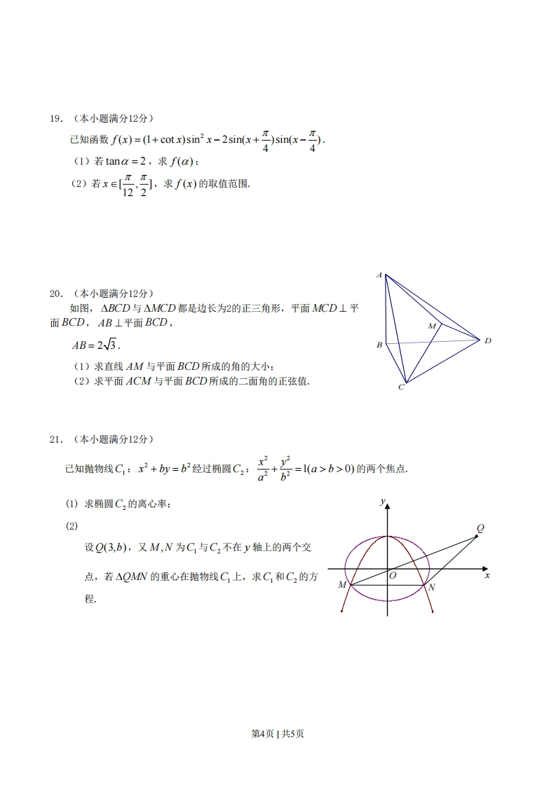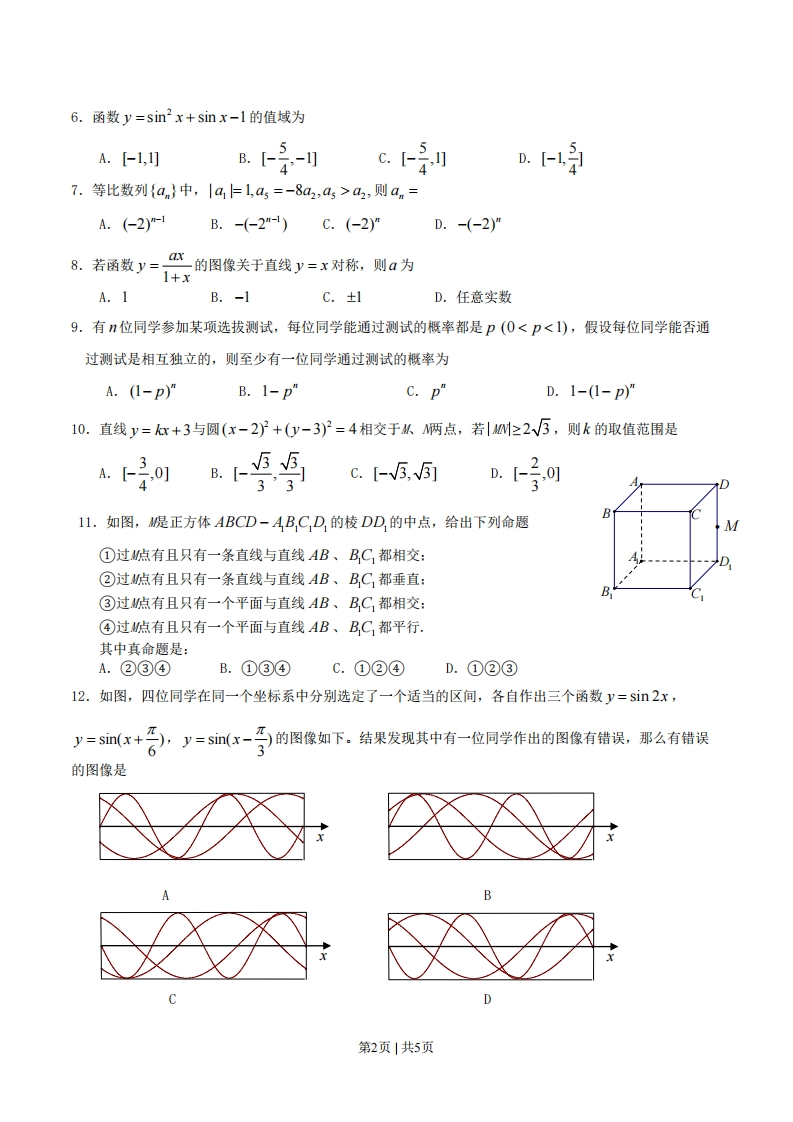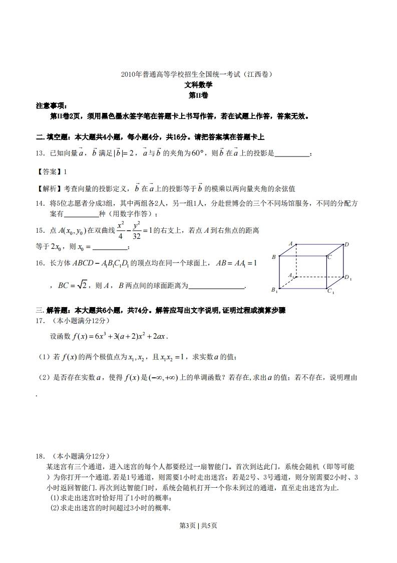 2010年江西高考文科数学真题绝密★启用前2010年普通高等学校招生全国统一考试(江西卷)文科数学本试卷分第I卷(选择题)和第Ⅱ卷(非选择题)两部分,第I卷1至2页,第Ⅱ卷3至4页,共150分。考生注意:1.答题前,考生务必将自己的准考证号、姓名填写在答题卡上,考生要认真核对答题卡上粘贴的条形码的“准考证号、姓名、考试科目”与考生本人准考证号、姓名是否一致。2.第I卷每小题选出答案后,用2B铅笔把答题卡上对应题目的答案标号涂黑,如需改动,用橡皮擦干净后,再选涂其他答案标号。第Ⅱ卷用黑色墨水签字笔在答题卡上作答。若在试题卷上作答,答案无效。3.考试结束,监考员将试题卷、答题卡一并收回。参考公式如果事件A,B互斥,那么球的表面积公式P(A+B)=P(A)+P(B)S=4πR2如果事件A,B,相互独立,那么其中R表示球的半径P(A.B)=P(A)-P(B)球的体积公式如果事件A在一次试验中发生的概率是卫,那么V-4xR3n次独立重复试验中恰好发生k次的概率其中R表示球的半径P.(k)=C*p*(1-p)第1卷一,选择题:本大题共12小题,每小愿5分,共60分。在每小题给出的四个选项中,只有一项是符合愿目要求的。1.对于实数a,b,c,,“a>b”是“ac2>bc2”的A.充分不必要条件B.必要不充分条件C.充要条件D.既不充分也不必要条件2.若集合A={xlxs1,B={xk20},则AnB=A.{x1≤x≤1B.{xr≥0C.{x0≤x≤1D.3.(1-x)0展开式中x3项的系数为A.-720B.720C.120D.-1204.若f(x)=am+bx2+c满足f'()=2,则f'(-1)=A.-4B.-2C.2D.45.不等式x-2>x-2的解集是A.(-0,2)B.(-0,+0)C.(2,+0)D.(-0,2)U(2,+o)第1页|共5页6.函数y=sin2x+sinx-l的值域为A.-1,1]-c.-7.等比数列{an}中,|a=1,a5=-8a2,a5>a2,则an=A.-2)-B.-(-2m-)C.(-2)”D.-(-2)”8.若函数y=的图像关于直线y=x对称,则a为A.1B.-1C.±1D.任意实数9.有n位同学参加某项选拔测试,每位同学能通过测试的概率都是p(0