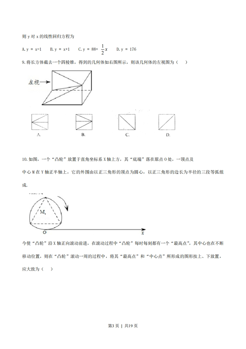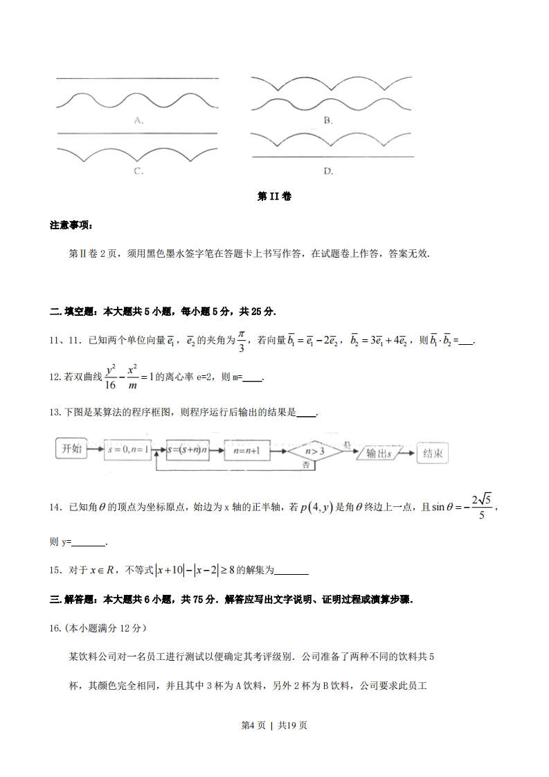 2011年江西高考文科数学真题及答案本试卷分第I卷(选择题)和第Ⅱ卷(非选择题)两部分.第I卷1至2页,第Ⅱ卷3至4页,满分150分,考试时间120分钟.考生注意:1.答题前,考生务必将自己的准考证号、姓名填写在答题卡上,考生要认真核对答题卡粘贴的条形码的“准考证号、姓名、考试科目”与考生本人准考证号、姓名是否一致.2.第I卷每小题选出答案后,用2B铅笔把答题卡上对应题目的答案标号涂黑,如需改动,用橡皮擦干净后,再选涂其他答案标号.第Ⅱ卷用0.5毫米的黑色墨水签字笔在答题卡上书写作答,在试题卷上作答,答案无效3.考试结束,监考员将试题卷、答题卡一并收回.参考公式:样本数据(31,片),(x2,2),,(xn,n)的回归方程:y=a+br2(x-0y-)其中b=-a=y-bx锥体体积公式空-列不=+为++五,万=乃+h++少nv其中S为底面积,h为高第I卷一、选择题:本大题共10小题,每小题5分,共50分。在年小题给出的四个选项中,只有一项是符合题目要求的。1.若(x-i)i=y+2i,x,y∈R,则复数x+i=()第1页|共19页A.-2+iB.2+iC.1-2iD.1+2i2.若全集U={1,2,3,4,5,6},M={2,3},N={1,4},则集合{5,6}等于()A.MUNB.MONC.(CuM)U(CuN)D.(CuM)(CuN)13.若f(x)=则f(x)的定义域为()log1(2x+1)24(←20B(2o)c(-20u0,+m网.22)4.曲线y=e在点A(0,1)处的切线斜率为()A.1 B.2 C.ee5.设{an}为等差数列,公差d=-2,Sn为其前n项和.若S1o=S1,则a,=()A.18B.20C.22D.246.观察下列各式:则72=49,7=343,7=2401,…,则72011的末两位数字为()A.01B.43C.07D.497.为了普及环保知识,增强环保意识,某大学随即抽取30名学生参加环保知识测试,得分(十分制)如图所示,假设得分值的中位数为m,众数为m。,平均值为下,则()频数101086643--2345678910得分A.m=m。=下B.m。=m。<下C.m。