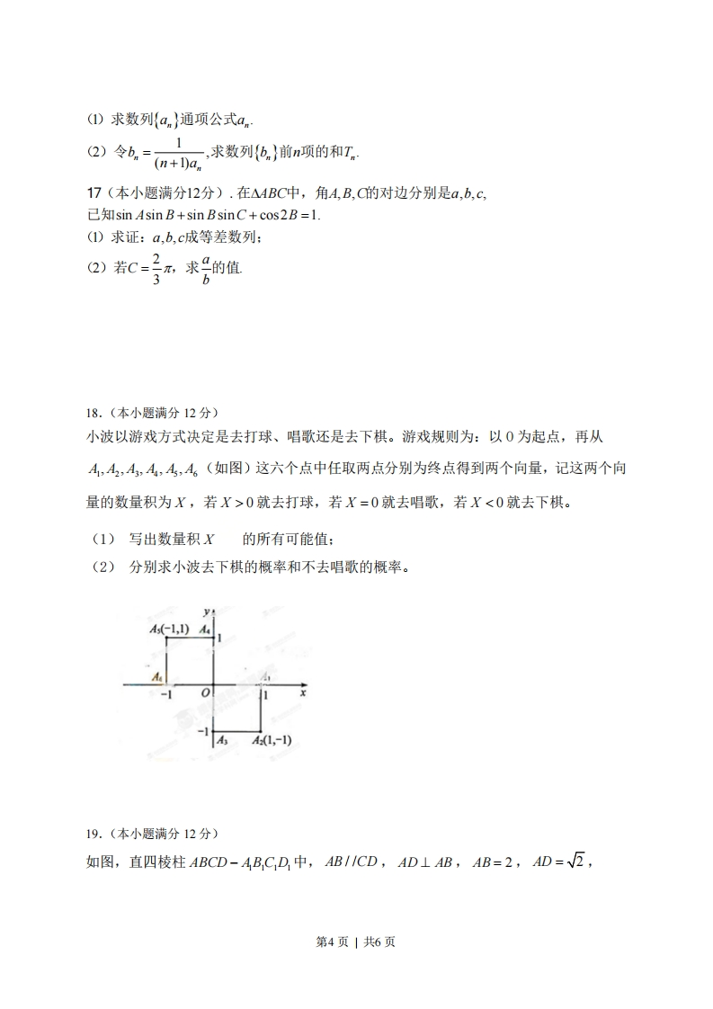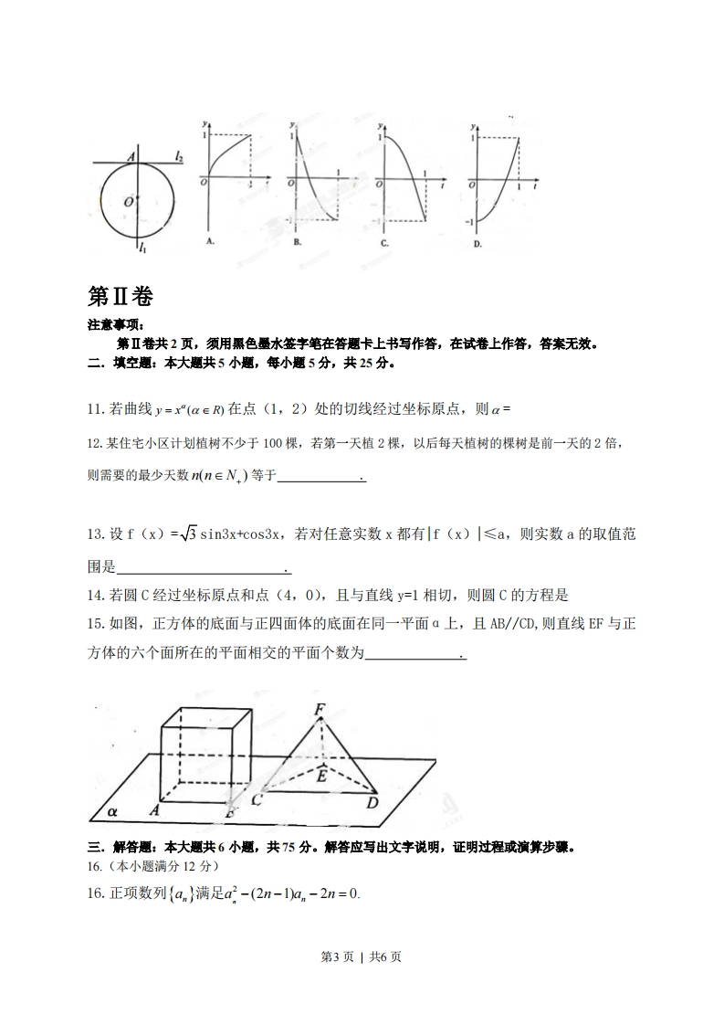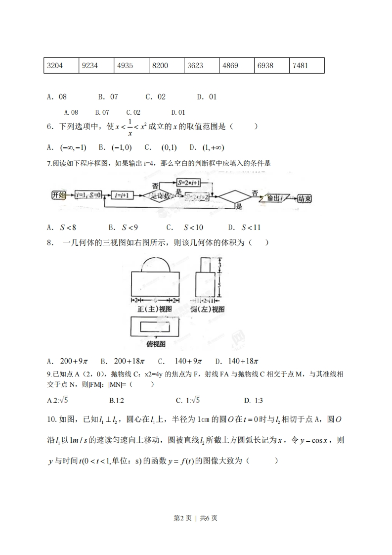 2013年普通高等学校招生全国统一考试(江西卷)文科数学本试卷分第I卷(选择题)和第Ⅱ卷《非选择题)两部分。第I卷1至2页,第Ⅱ卷3至4页。全卷满分150分。考试时间120分钟。考生注意:1.答题前,考生务必将自己的准考证号、姓名写在答题卡上。考生要认真核对答题卡上粘帖的条形码的“准考证号、姓名、考试科目”与考生本人准考证号、姓名是否一致。2.第I卷每小题选出答案后,用2B铅毛把答题卡上对应题日的答案标号涂黑,如需改动,用橡皮擦干净后,再选涂其他答案标号。第Ⅱ卷用0.5毫米黑色墨水签字笔在答题卡上书写作答,若在试题卷上答题,答案无效。4.考试结束,监考员将试题卷、答题卡一并收回。第I卷一.选择题:本大题共10小题,每小题5分,共50分.在每小题给出的四个选项中,只有一项是符合题目要求的,1.若数z=i(-2-)(1为虚数单位)在复平面内所对应的点在A.第一象限B.第二象限C.第三象限D.第四象限2.若集合A={x∈Rar2+ar+1中只有一个元素,则a=()A.4B.2C.0D.0或43.若sim只=323,则cosa=(c.D.4.若集合A={2,3},,B={1,2,3},从A,B中各任意取一个数,则这两数之和等于4的概率是a司B.C.D.365.总体由编号01,,02,…,19,20的20个个体组成。利用下面的随机数表选取5个个体,选取方法是随机数表第1行的第5列和第6列数字开始由左到右依次选取两个数字,则选出来的第5个个体的编号为78166572080263140702436997280198第1页|共6页32049234493582003623486969387481A.08B.07C.02D.01A.08B.07C.02D.016.下列选项中,使x<上<亡成立的x的取值范围是(A.(-0,-1)B.(-1,0)C.(0,1)D.(1,+o)7.阅读如下程序框图,如果输出=4,那么空白的判断框中应填入的条件是S-2+i+1开始+1,S=可i=i+12t2之偷出子结束A.S<8B.S<9C.S<10D.S<118.一几何体的三视图如右图所示,则该几何体的体积为()246+2◆4s1e正(主)视图(左)视图俯视图A.200+9πB.200+18πC.140+9πD.140+18元9.己知点A(2,0),抛物线C:x2=4y的焦点为F,射线FA与抛物线C相交于点M,与其准线相交于点N,则FM:MN=()A2:V5B.12C.1:v5D.1310.如图,已知1⊥马,圆心在1上,半径为1cm的圆0在t=0时与4相切于点A,圆0沿1以1m/s的速读匀速向上移动,圆被直线,所截上方圆弧长记为x,令y=cosx,则y与时间t(0