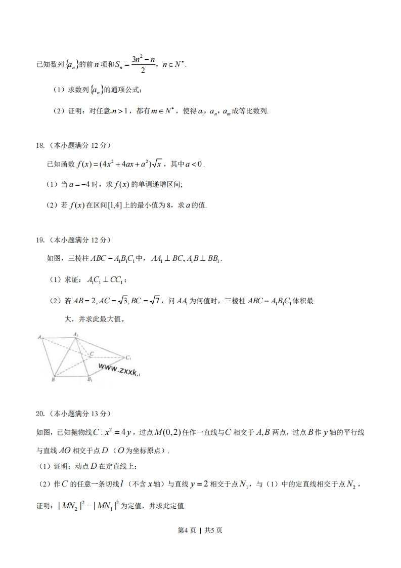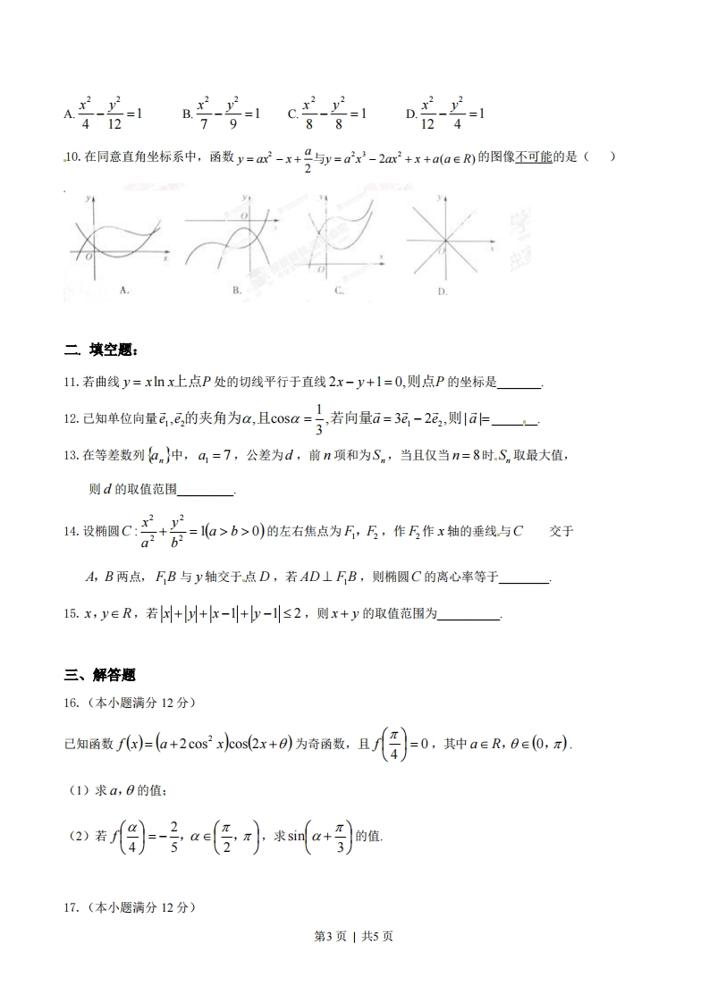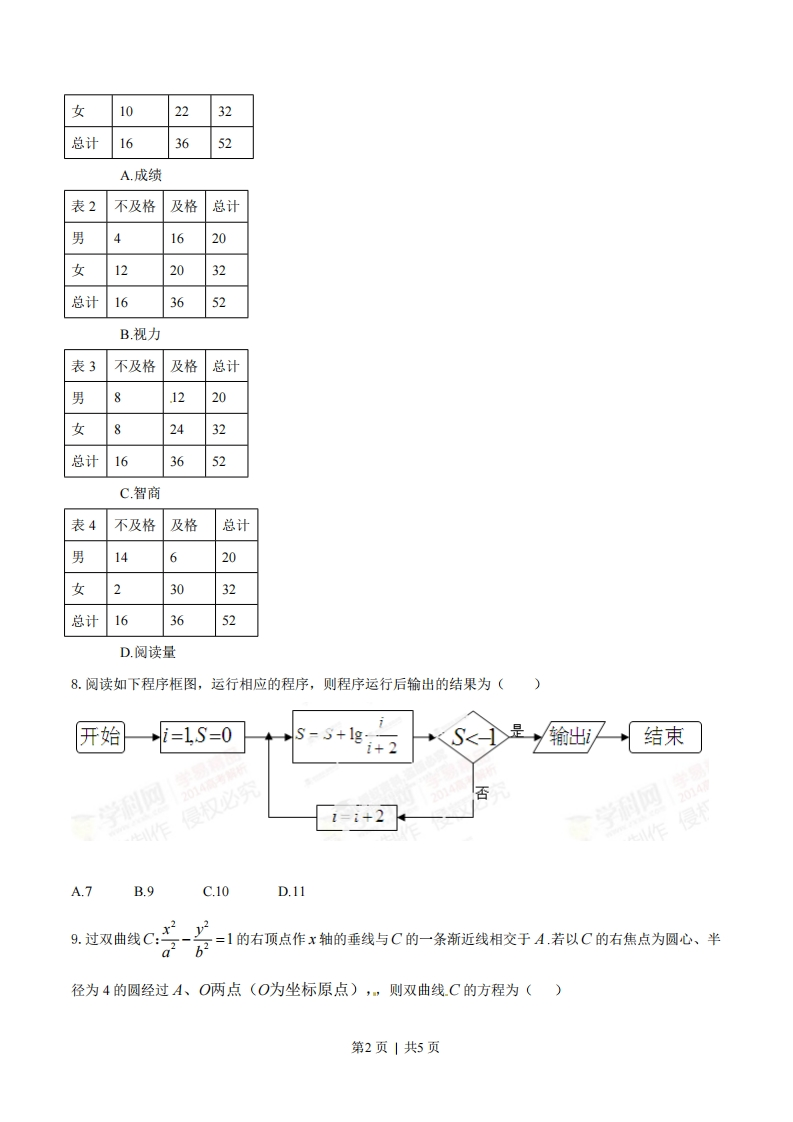 2014年普通高等学校招生全国统一考试(江西卷)数学(文科)一、选择题:1.若复数z满足z(1+)=2i(i为虚数单位),则|z=()A.1B.2C.5DN52.设全集为R,集合A={x|x2-9<0},B={x|-1cb2"的充要条件是"a>c"C.命题“对任意x∈R,有x≥0”的否定是“存在x∈R,有x2≥0”D.1是一条直线,心,B是两个不同的平面,若1⊥,1⊥B,则.a/1B7.某人研究中学生的性别与成绩、视力、智商、阅读量这4个变量之间的关系,随机抽查52名中学生,得到统计数据如表1至表4,这与性别有关联的可能性最大的变量是()表1不及格及格总计男61420第1页|共5页女102232总计163652A.成绩表2不及格及格总计男41620女122032总计163652B视力表3不及格及格总计男81220女82432总计163652C.智商表4不及格及格总计男14620女23032总计163652D.阅读量8.阅读如下程序框图,运行相应的程序,则程序运行后输出的结果为()开始i=1S=0S=S+1g-+2输出结束侵权必喷1=i+2作侵A.7B.9C.10D.119过双曲线C:云x2 y2=1的右顶点作x轴的垂线与C的一条渐近线相交于A.若以C的右焦点为圆心、半径为4的圆经过A、O两点(O为坐标原点),,则双曲线C的方程为()第2页|共5页421AB号-上=1c-=1D.y=1798812410.在同意直角坐标系中,函数y=a-r+号与=a-2am+r+aa∈)的图像不可能的是()二填空题:11.若曲线y=xnx上点P处的切线平行于直线2x-y+1=0,则点P的坐标是12.已知单位向量G,3的夹角为0,且cos0=写若向量ā=3运-2,则1a一一13.在等差数列{an}中,a,=7,公差为d,前n项和为Sn,当且仅当n=8时.Sn取最大值,则d的取值范围还设椭圆℃仁+Q>6>0的左右焦点为,片,作5作x箱的垂线与C交于A,B两点,FB与y轴交于点D,若AD⊥FB,则椭圆C的离心率等于15.x,y∈R,若++r-1+y-1≤2,则x+y的取值范围为三、解答题16.(本小题满分12分)已知函数)=a+2cos小os2x+0)为奇函数.且/日=0,其中a∈R,8e0,).(1)求a,0的值:a若)-房a后小求ma+引恤17.(本小题满分12分)第3页|共5页