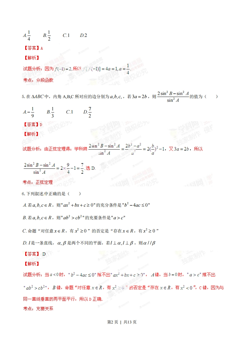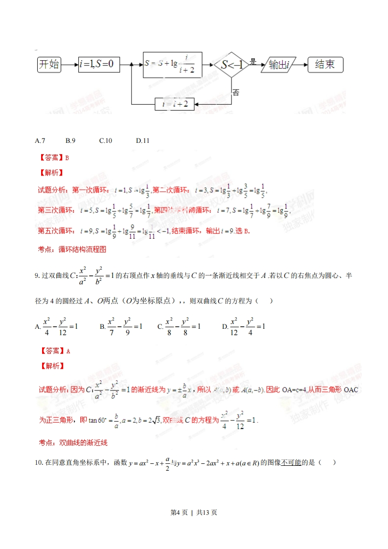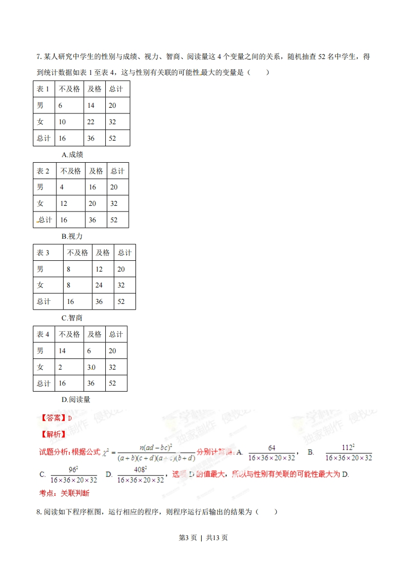 2014年普通高等学校招生全国统一考试(江西卷)数学(文科)一、选择题:1.若复数z满足z(1+)=2i(i为虚数单位),则z=()A.1B.2C.5D.N3【答案】c【解析】试题分折:因为z0+)=2,学网所以2-二=20-①=1+因此1z片1+i作51+i2考点:复数的模2.设全集为R,集合A={x|x2-9<0},B={x|-1cb2"的充要条件是"a>c”C.命题“对任意x∈R,有x2≥0”的否定是“存在x∈R,有x2≥0”D.1是一条直线,心,B是两个不同的平面,若1⊥,1⊥B,则a/1B【答案】D【解析】独家制作试题分析:当a<0时,"b2-4ac≤0"推不出"a2+bx+c≥0”,A错,当b=0时,"a>c"推不出"ab2>cb2",B错,命题“对任意x∈R,有x2≥0”的否定是“存在xeR,有x2<0”,C错,因为与同一直线垂直的两平面平行,所以D正确。考点:充要关系第2页|共13页7.某人研究中学生的性别与成绩、视力、智商、阅读量这4个变量之间的关系,随机抽查52名中学生,得到统计数据如表1至表4,这与性别有关联的可能性最大的变量是()表1不及格及格总计男61420女102232总计163652A成绩表2不及格及格总计男1620女122032总计163652B.视力表3不及格及格总计男1220女82432总计163652C.智商表4不及格及格总计男14620女23.032总计163652D.阅读量【答案】D学【解析】中家制作侵权试题分析:根据公式=ad-bc)月分别计算海:A64112(a+bxc+dxacnbd)16×36×20×32’816×36×20×32.9616×36X20×亚'选页D的值最大,所以与性别有关联的可能性最大为D403D16×36×20×32考点:关联判断8.阅读如下程序框图,运行相应的程序,则程序运行后输出的结果为()第3页|共13页