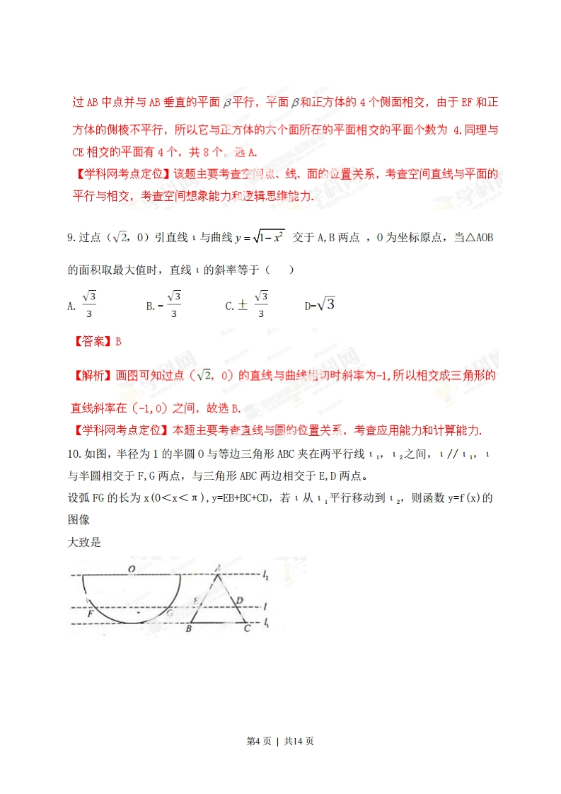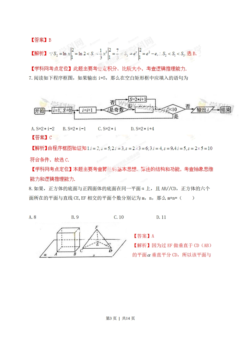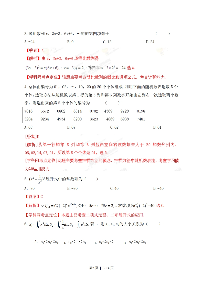 [总评]本套试题考查的比较到位,覆盖面广泛,试题从易到难梯度变化明显,在考查基础知识、基本方法、基本思想的同时又考查考生分析问题、解决问题的能力,考查推理论证能力、逻辑思维能力、空间想象能刀、必然与或然的能力、运算能力,能够体现高考的特质;试题有既保留了以往传统的模式,又有创新变化的部分,创新部分题目综合性强、跨度大、对能力的要求较高其中选挥填空题注重基础知识、基本技能的考查,同时不失灵活性;解答题部分加大了对数学思想、数学方法和技能技巧的考查力度比如第17题在数列求和方面体现了裂项法的技巧性、第18题是平面向量与概率的综合问题,在随机事件的列举方面体现了考查将两大知识体系相互融合的能力后两道压轴题在综合能力考查方面又有所提升2013年普通高等学校招生全国统一考试(江西卷)数学(理科)解析陕西省宝鸡市金台高中晁群彦第I卷(选择题共50分)一.选择题:本大题共10小题。每小题5分,共50分。在每个小题给出的四个选项中,只有一项是符合题目要求的,1.设集合M={1,2,zi},i为虚数单位,N={3,4},M∩N={4},则复数z=()A.-21B.2iC.-4iD.4i【答案】C【解析】因为I∩{4,所以4eM,i=4,z=4=-4选C【学科网考点定位】此题主要考查集合的概念、复数的相概念、集合的运算和复数的运算,考查分析问题、解决问题的能力.2.函数y=√xln(1-x)的定义域为A.(0,1)B.[0,1)C.(0,1]D.[0,1]【答案】Bx≥0【解析】y=√xln(1-x)1-x>00≤r<1,选B,【学科网考点定位】该题主要考查函数的概念、定义域及其求法第1页|共14页3.等比数列x,3x+3,6x+6,…的的第四项等于A.-24B.0C.12D.24【答案】A【解析】由x,3x+3,6x+6成等比数列得(3x+3)2=x6x+6).∴.x=-3,g=2.第四项--3×2=-24.选A【学科网考点定位】该题主要考查等比数列的概念和通项公式,考查计算能力.4.总体由编号为01,02,…,19,20的20个个体组成.利用下面的随机数表选取5个个体,选取方法从随机数表第1行的第5列和第6列数字开始由左到右一次选取两个数字,则选出来的第5个个体的编号为()7816657208026314070243699728019832049234493482003623486969387481A.08B.07C.02D.01[答案]D[解析]从第一行的第5列和第6列起由左向右读数划去大于20的数分别为:08,02,14,07,01,所以第5个个体足01,选D[学科网考点定位]此题主要考查抽样方法的概念、抽样方法中随机数表法,考查学习能力和运用能力:5.(:-)护展开式中的常数项为()A.80B.-80C.40D.-40【答案】C【解析】T41=Cg(-2yx0-5,令10-5=0,得r=2∴常数项为C(-2)2=40.选C.【学科网考点定位】本题主要考查二项式定理、二项展开式的应用.6S=广f杰品=女S=e杰,若,则ss鸟的大小关系为()A.S1