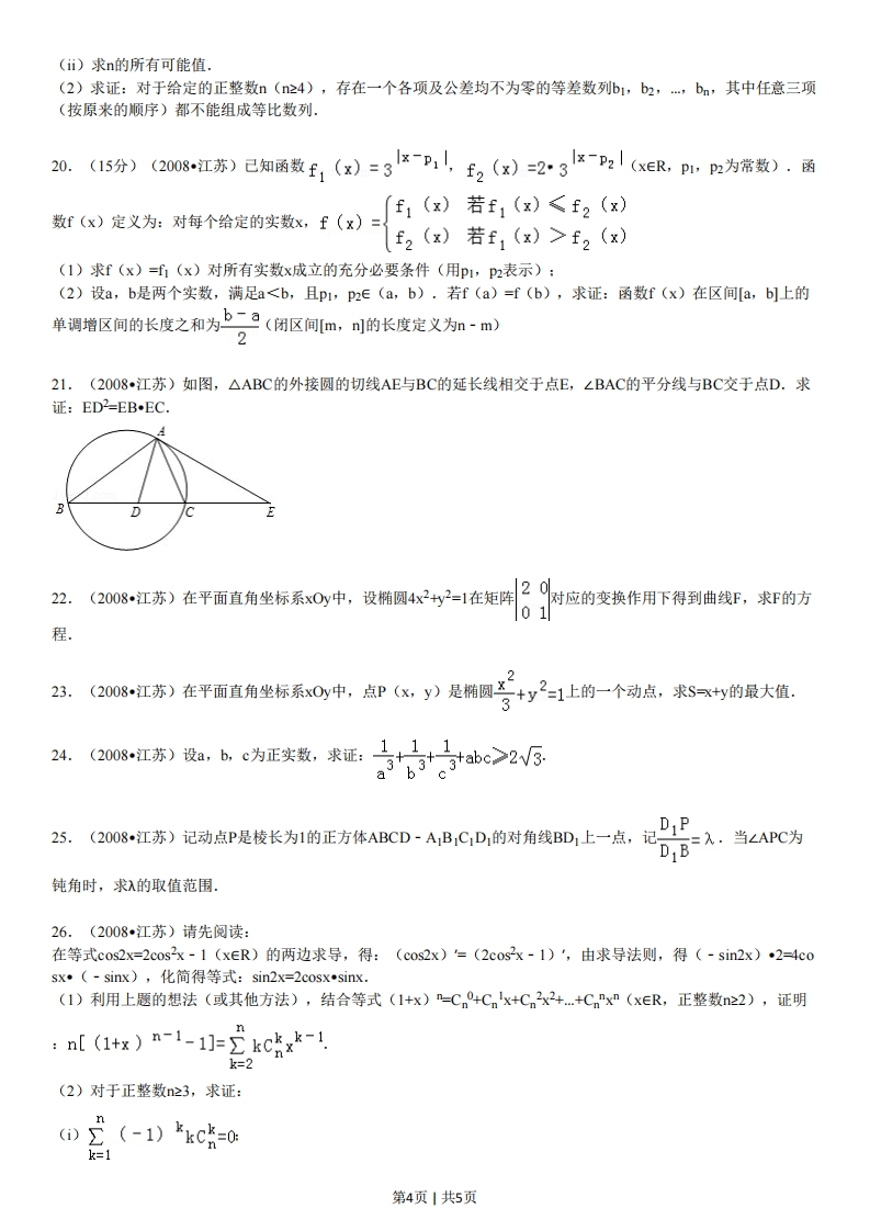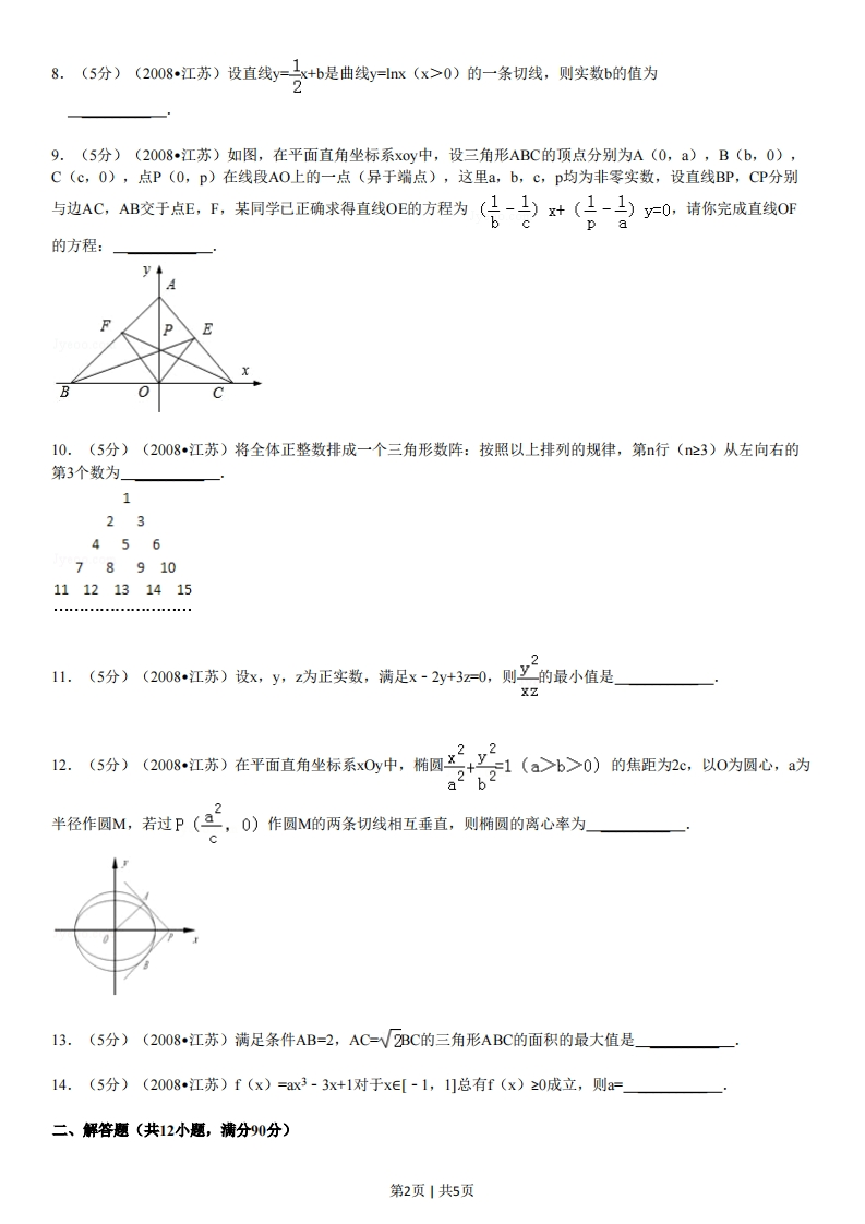 2008年江苏省高考数学试卷一、填空题(共14小题,每小题5分,满分70分)2008江苏)若函数ycos(0x二6)(W>0)最小正周2.(5分)(2008江苏)若将一颗质地均匀的骰子(一种各面上分别标有1,2,3,4,5,6个点的正方体玩具),先后抛掷两次,则出现向上的点数之和为4的概率是3.(5分)(2008江苏)若将复数1+i表示为a+bi(a,beR,i是虚数单位)的形式,则a+b1-i4.(5分)(2008江苏)若集合A={x(x-1)2<3x+7,xER),则AnZ中有个元素.5.(5分)(2008江苏)已知向量a和b的夹角为120°,a=1,6|=3则|5a-6F6.(5分)(2008,江苏)在平面直角坐标系xoy中,设D是横坐标与纵坐标的绝对值均不大于2的点构成的区域,E是到原点的距离不大于1的点构成的区域,向D中随机投一点,则所投点在E中的概率是7.(5分)(2008江苏)某地区为了解70-80岁的老人的日平均睡眠时间(单位:h),随机选择了50位老人进行调查,下表是这50位老人睡眠时间的频率分布表:序号i份组组中值(G颗数频率(Fi(睡眠时间)(人数)4,5)4.5p.125,6)5.510D.206,7)6.520D.407,8)7.510D.208,9]8.5D.08在上述统计数据的分析中一部分计算见算法流程图,则输出的$的值为开始S←0ic1应输入G,Fici+1S←S+G·FNi>5Y输出S结束第1页1共5页8.(5分)(2008江苏)设直线y=二x+b是曲线y=lx(x>0)的一条切线,则实数b的值为9.(5分)(2008江苏)如图,在平面直角坐标系xoy中,设三角形ABC的顶点分别为A(0,a),B(b,0),C(c,0),点P(O,p)在线段AO上的一点(异于端点),这里a,b,c,p均为非零实数,设直线BP,CP分别与边AC,AB交于点,F,莱同学纪正确求得直线OE的方程为(合-之+(}台F0,请你完成直线0Fp a的方程:AFEB10.(5分)(2008江苏)将全体正整数排成一个三角形数阵:按照以上排列的规律,第n行(23)从左向右的第3个数为123456789101112131415。。。.211.(5分)(2008江苏)设x,y,z为正实数,满足x-2y+3z=0,则Y的最小值是XZ212.(5分)(2008江苏)在平面直角坐标系x0y中,椭圆1(a>b>0)的焦距为2c,以0为圆心,a为a
