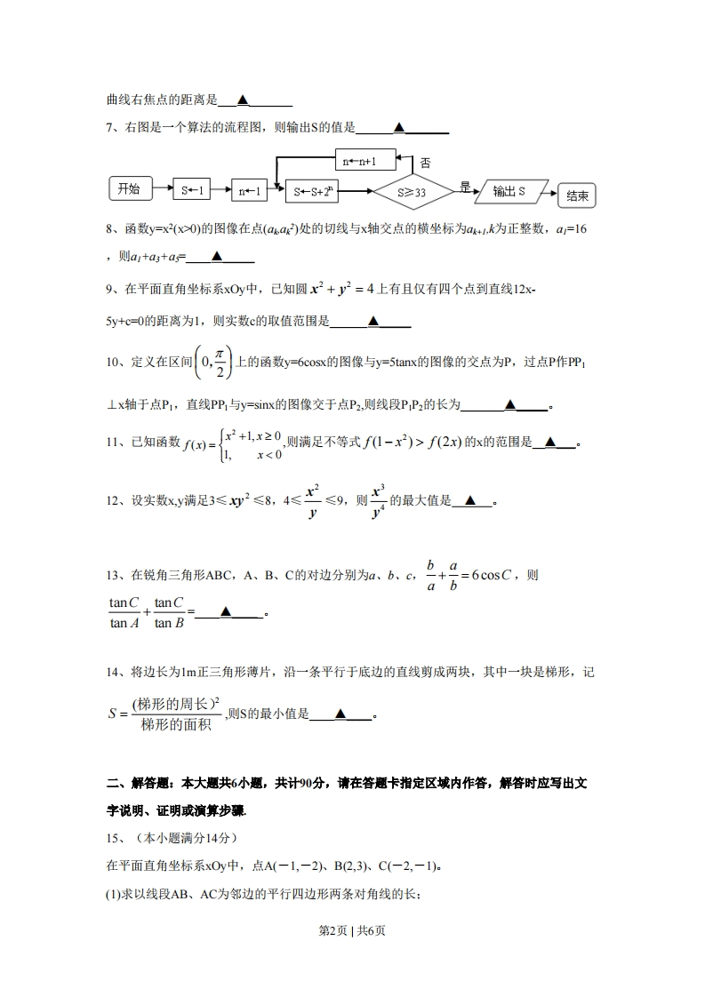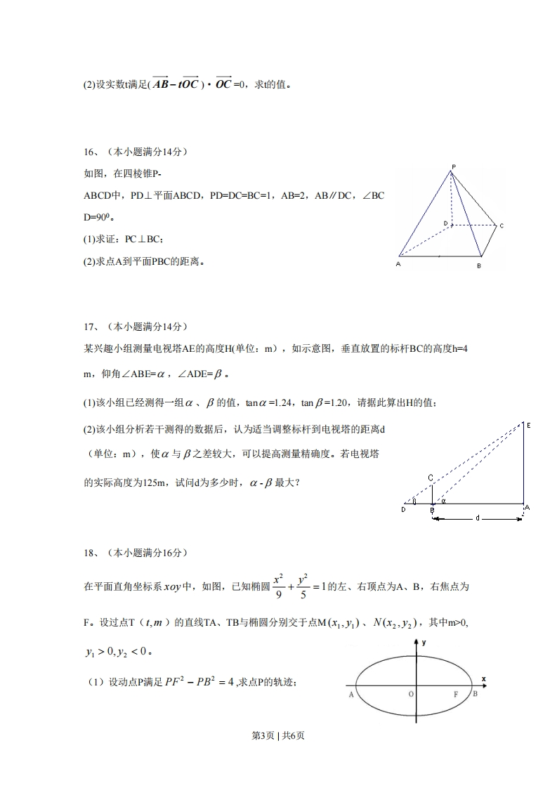 2010年普通高等学校招生全国统一考试江苏卷数学全解全析数学I试题注意事项考生在答题前请认真阅读本注意事项及各题答题要求1.本试卷共4页,包含填空题(第1题一一第14题)、解答题(第15题一一第20题)。本卷满分160分,考试时间为120分钟。考试结束后,请将本卷和答题卡一并交回。2.答题前,请您务必将自己的姓名、准考证号用0.5毫米黑色墨水的签字笔填写在试卷及答题卡的规定位置。3.请认真核对监考员在答题卡上所粘贴的条形码上的姓名、准考证号与您本人是否相符。4.请在答题卡上按照晤顺序在对应的答题区域内作答,在其他位置作答一律无效。作答必须用0.5毫米黑色墨水的签字笔。请注意字体工整,笔迹清楚。5.如需作图,须用2B铅笔绘、写清楚,线条、符号等须加黑、加粗。6.请保持答题卡卡面清洁,不要折叠、破损。参考公式:锥体的体积公式:VS,其中S是维体的底面积,h是高。一、填空题:本大题共14小题,每小题5分,共70分。请把答案填写在答题卡相应的位置上1、设集合A={-1,1,3,B={a+2,a2+4},AnB={3},则实数a=2、设复数z满足z2-3)=6+4i(其中为虚数单位),则z的模为3、盒子中有大小相同的3只白球,1只黑球,若从中随机地摸出两只球,两只球颜色不同的概率是▲牌4、某棉纺厂为了了解一批棉花的质量,从中随机抽ODG组更取了100根棉花纤维的长度(棉花纤维的长度是棉花005质量的重要指标),所得数据都在区间[5,40]中,其0D月003频率分布直方图如图所示,则其抽样的100根中,有02▲根在棉花纤维的长度小于20mm。长唐■0510150253035405、设函数fxFx(ex+aex)x∈)是偶函数,则实数ae6、在平面直角坐标系xOy中,双曲线女-二=1上一点M,点M的横坐标是3,则M到双412第1页|共6页曲线右焦点的距离是7、右图是一个算法的流程图,则输出S的值是n+-n+1否开始S1S+S+2S≥33是,输出S结束8、函数y=x2(x>0)的图像在点(akak2)处的切线与x轴交点的横坐标为ak+,k为正整数,a=16,则a1+a3+a斤▲9、在平面直角坐标系xOy中,己知圆x2+y2=4上有且仅有四个点到直线12x5y+c=0的距离为1,则实数c的取值范围是_▲10、定义在区1上的函数y=6cosx的图像与y=5tanx的图像的交点为P,过点P作PP1⊥x轴于点P1,直线PP,与y=six的图像交于点P2,则线段PPz的长为11、己知函数f(x)=x+1,x20,则满足不等式f1-x2)>f(2x)的x的范围是_▲一·1.x<012、设实数y满足3≤y2≤8,4≤上9,则一的最大值是▲。b a13、在锐角三角形ABC,A、B、C的对边分别为a、b、c,一+=6cosC,则a btanC tanC▲tan A tan B14、将边长为1m正三角形薄片,沿一条平行于底边的直线剪成两块,其中一块是梯形,记S=(梯形的周长)2,则S的最小值是▲梯形的面积二、解答题:本大题共6小题,共计90分,请在答题卡指定区域内作答,解答时应写出文字说明、证明或演算步骤15、(本小题满分14分)在平面直角坐标系xOy中,点A(-1,一2)、B(2,3以C(-2,一1)(I)求以线段AB、AC为邻边的平行四边形两条对角线的长:第2页|共6页(2)设实数满足(AB-tOC)·OC=0,求的值。16、(本小题满分14分)如图,在四棱锥PABCD中,PD⊥平面ABCD,PD=DC=BC=1,AB-2,AB∥DC,∠BCD=90°.(1)求证:PC⊥BC:(2)求点A到平面PBC的距离。17、(本小题满分14分)某兴趣小组测量电视塔AE的高度H(单位:m),如示意图,垂直放置的标杆BC的高度h=4m,仰角∠ABE=a,∠ADE=B。(1)该小组己经测得一组a、B的值,ana=1.24,tanB=1.20,请据此算出H的值:(2)该小组分析若干测得的数据后,认为适当调整标杆到电视塔的距离d(单位:m),使位与B之差较大,可以提高测量精确度。若电视塔的实际高度为125m,试问d为多少时,a-B最大?Dd18、(本小题满分16分)在平面直角坐标系Oy中,如图,已知椭圆。+上-1的左、右顶点为A、B,右焦点为95F。设过点T(t,m)的直线TA、TB与椭圆分别交于点M(x1,)、N(x2,y2),其中m>0,y1>0,y2<0。(1)设动点P满足PF2-PB2=4,求点P的轨迹:第3页|共6页