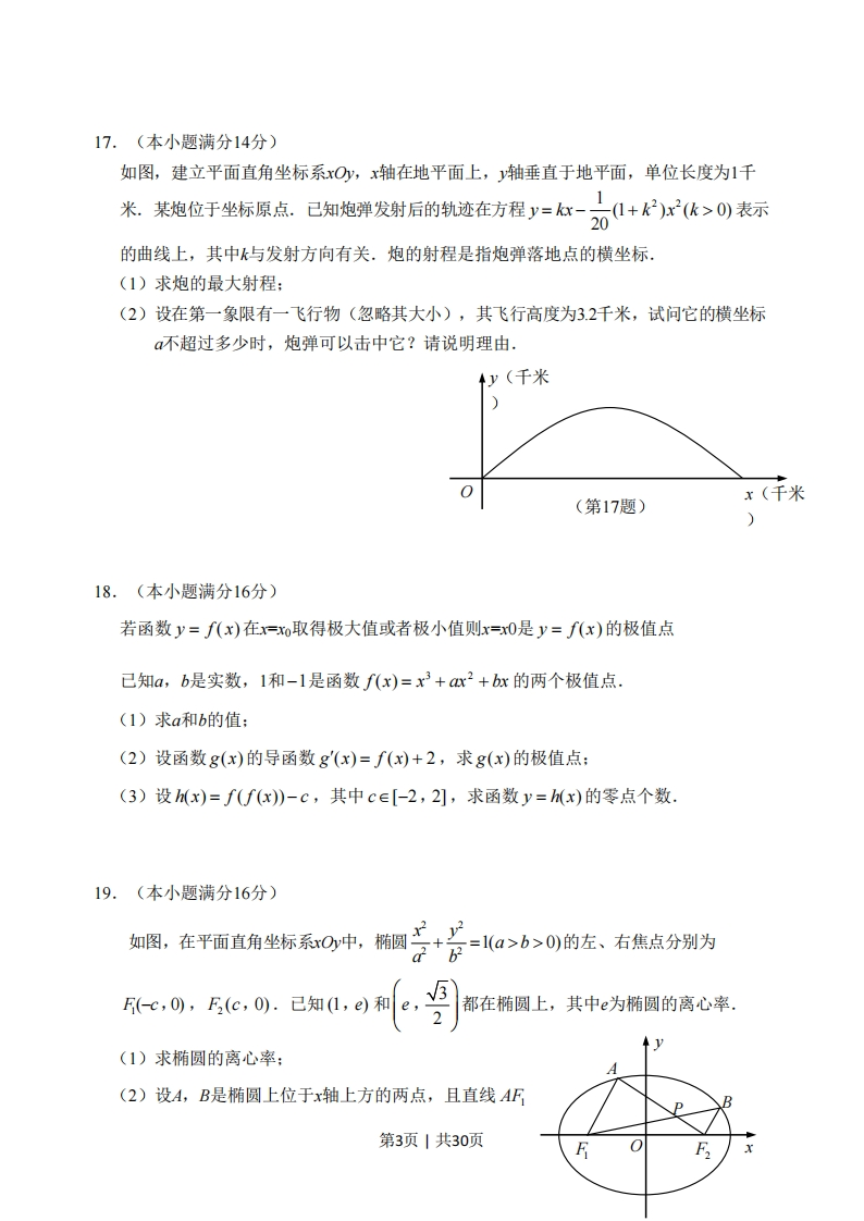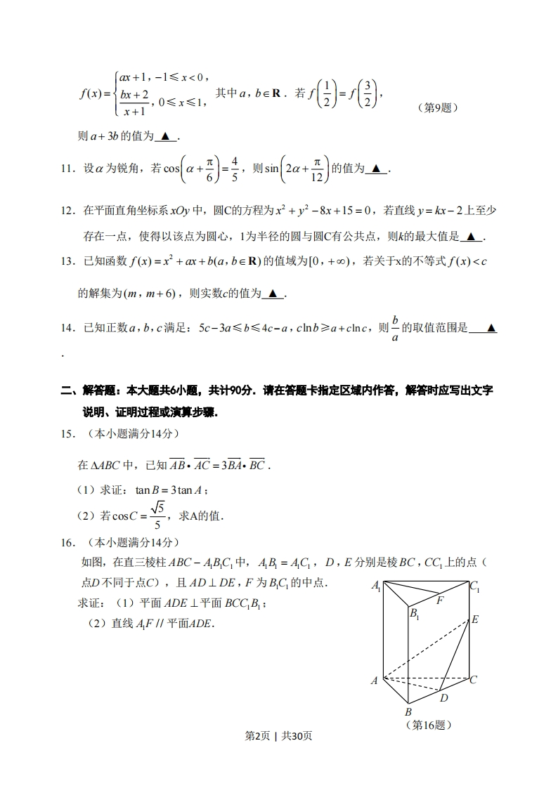 2012年普通高等学校招生全国统一考试(江苏卷)》数学1参考公式:棱锥的体积V=Sh,其中S为底面积,h为高。一、填空题:本大题共14小题,每小题5分,共计70分.请把答案填写在答题卡相应位置上◆1.已知集合A=1,2,4},B={2,4,6,则AUB=▲.2.某学校高一、高二、高三年级的学生人数之比为3:3:4,现用分层抽样的方法从该校高中三个年级的学生中抽取容量为50的样本,则应从高二年级抽取▲名学生.3.设a,beR,a+bi=11-7(i为虚数单位),则a+b的值开始1-2i为▲4.右图是一个算法流程图,则输出的k的值是▲·5.函数f(x)=V1-2log6x的定义域为▲2-5k+4>0>Nk-k+16.现有10个数,它们能构成一个以1为首项,-3为公比的y等比数列,若从这10个数中随机抽取一个数,则它小于8输出k的概率是▲结束(第4题)7.如图,在长方体ABCD-AB,CD中,AB=AD=3cm,A4=2cm,D则四棱锥A-BBDD的体积为▲cm3.AD8。在平面直角坐标系x0中,若双曲线父-广=1的离心率mm2+4为√5,则m的值为▲(第7题)D9.如图,在矩形ABCD中,AB=√5,BC=2,点E为BC的中点,点F在边CD上,若AB.AF=√2,则AE.BF的值是▲10.设f(x)是定义在R上且周期为2的函数,在区间[-1,1]上,第1页|共30页x+1,-1≤x<0,f(x)=bx+20≤.英中a,eR.若付)-)x+1(第9题)则a+3b的值为▲山.设a为能角,若oa+君引}则sna+的值为▲12.在平面直角坐标系xOy中,圆C的方程为x2+y2-8x+15=0,若直线y=x-2上至少存在一点,使得以该点为圆心,1为半径的圆与圆C有公共点,则的最大值是▲13.已知函数f(x)=x2+a+b(a,b∈R)的值域为[0,+o),若关于x的不等式f(x)0)表示的曲线上,其中k与发射方向有关.炮的射程是指炮弹落地点的横坐标(1)求炮的最大射程:(2)设在第一象限有一飞行物(忽略其大小),其飞行高度为3.2千米,试问它的横坐标a不超过多少时,炮弹可以击中它?请说明理由。y(千米0x(千米(第17题)18.(本小题满分16分)若函数y=f(x)在=xo取得极大值或者极小值则x=xr0是y=f(x)的极值点已知a,b是实数,1和-1是函数f(x)=x3+ar2+br的两个极值点.(1)求a和b的值:(2)设函数g(x)的导函数g'(x)=f(x)+2,求g(x)的极值点:(3)设hx)=f(f(x)-c,其中c∈[-2,2],求函数y=hx)的零点个数.19.(本小题满分16分)图,在平面直角坐标系x0中,椭圆子+京=1(a>b>0)的左、右焦点分F(-c,0),F(c,0).已知(1,e)和都在椭圆上,其中e为椭圆的离心率.y(1)求椭圆的离心率:A(2)设A,B是椭圆上位于x轴上方的两点,且直线AF第3页|共30页0F