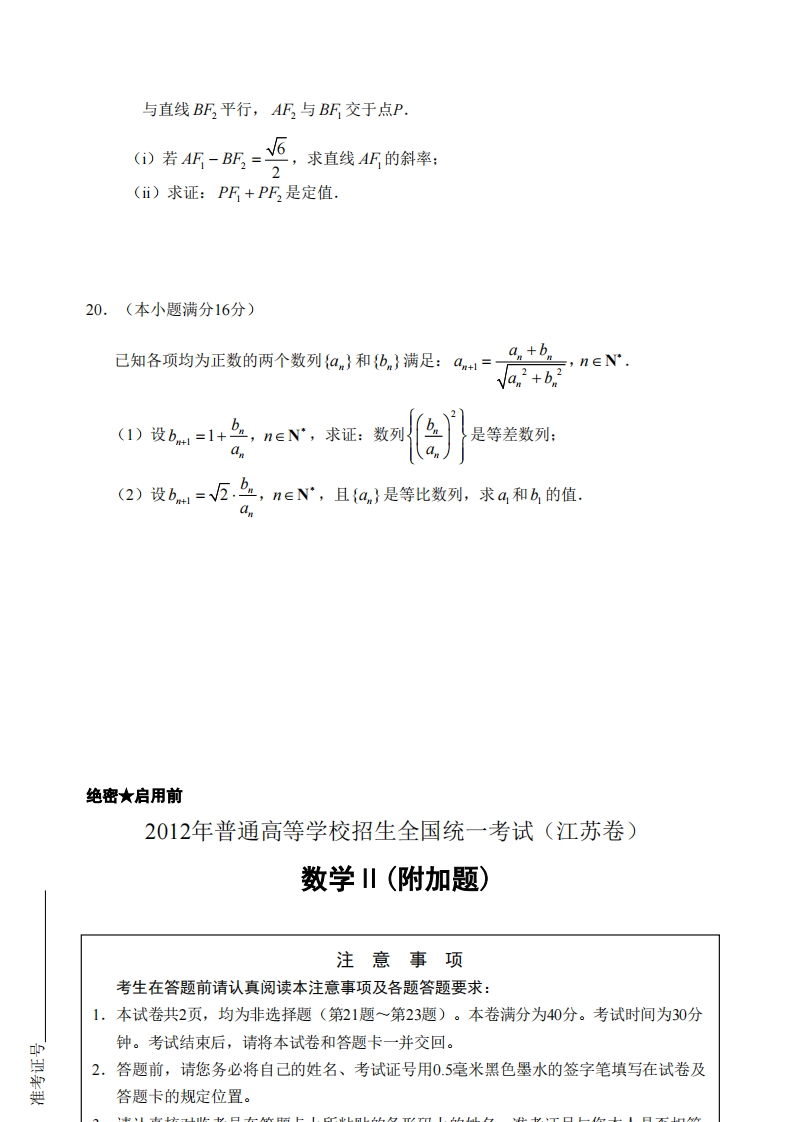 2012年普通高等学校招生全国统一考试(江苏卷)》数学1参考公式:棱锥的体积V=Sh,其中S为底面积,h为高。一、填空题:本大题共14小题,每小题5分,共计70分.请把答案填写在答题卡相应位置上◆1.已知集合A=1,2,4},B={2,4,6,则AUB=▲.2.某学校高一、高二、高三年级的学生人数之比为3:3:4,现用分层抽样的方法从该校高中三个年级的学生中抽取容量为50的样本,则应从高二年级抽取▲名学生.3.设a,beR,a+bi=11-7(i为虚数单位),则a+b的值开始1-2i为▲4.右图是一个算法流程图,则输出的k的值是▲·5.函数f(x)=V1-2log6x的定义域为▲2-5k+4>0>Nk-k+16.现有10个数,它们能构成一个以1为首项,-3为公比的y等比数列,若从这10个数中随机抽取一个数,则它小于8输出k的概率是▲结束(第4题)7.如图,在长方体ABCD-AB,CD中,AB=AD=3cm,A4=2cm,D则四棱锥A-BBDD的体积为▲cm3.D8。在平面直角坐标系x0中,若双曲线父-广=1的离心率mm2+4为√5,则m的值为▲(第7题)D9.如图,在矩形ABCD中,AB=√5,BC=2,点E为BC的中点,点F在边CD上,若AB.AF=√2,则AE.BF的值是▲10.设f(x)是定义在R上且周期为2的函数,在区间[-1,1]上,第1页1共7页x+1,-1≤x<0,f(x)=bx+20≤.英中a,eR.若付)-)x+1(第9题)则a+3b的值为▲山.设a为能角,若oa+君引}则sna+的值为▲12.在平面直角坐标系xOy中,圆C的方程为x2+y2-8x+15=0,若直线y=x-2上至少存在一点,使得以该点为圆心,1为半径的圆与圆C有公共点,则的最大值是▲13.已知函数f(x)=x2+a+b(a,b∈R)的值域为[0,+o),若关于x的不等式f(x)0)表示的曲线上,其中k与发射方向有关.炮的射程是指炮弹落地点的横坐标(1)求炮的最大射程:(2)设在第一象限有一飞行物(忽略其大小),其飞行高度为3.2千米,试问它的横坐标a不超过多少时,炮弹可以击中它?请说明理由。y(千米0x(千米(第17题)18.(本小题满分16分)若函数y=f(x)在=xo取得极大值或者极小值则x=xr0是y=f(x)的极值点已知a,b是实数,1和-1是函数f(x)=x3+ar2+br的两个极值点.(1)求a和b的值:(2)设函数g(x)的导函数g'(x)=f(x)+2,求g(x)的极值点:(3)设hx)=f(f(x)-c,其中c∈[-2,2],求函数y=hx)的零点个数.19.(本小题满分16分)图,在平面直角坐标系x0中,椭圆子+京=1(a>b>0)的左、右焦点分F(-c,0),F(c,0).已知(1,e)和都在椭圆上,其中e为椭圆的离心率.y(1)求椭圆的离心率:A(2)设A,B是椭圆上位于x轴上方的两点,且直线AF第3页1共7页0F