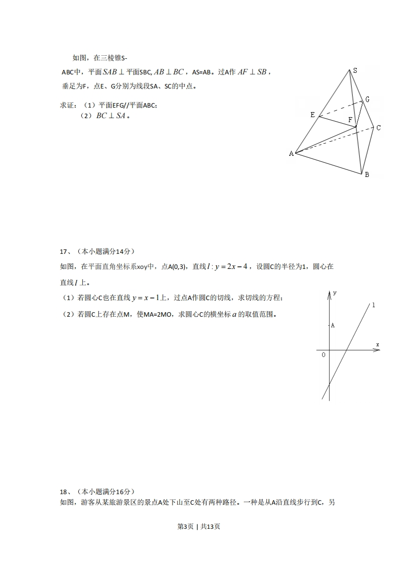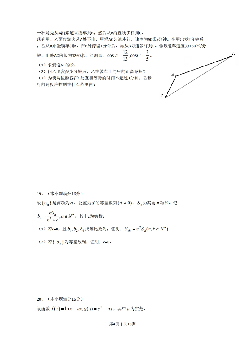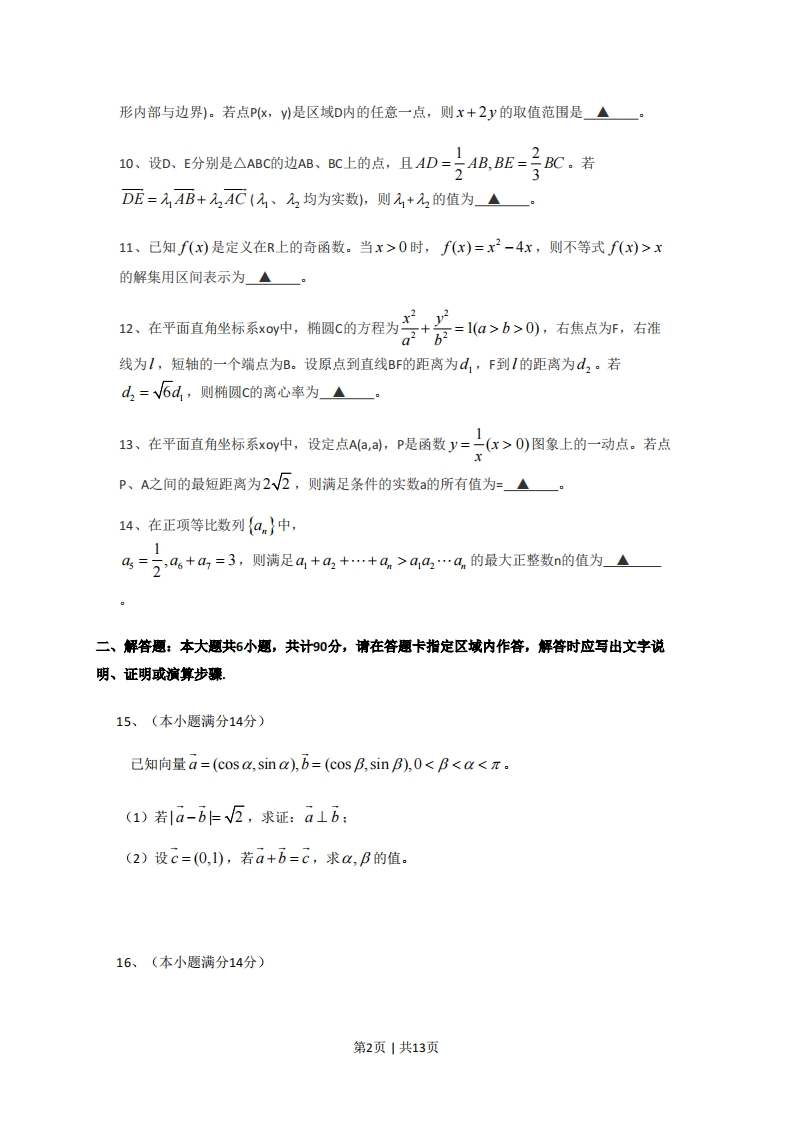 0时,f(x)=x2-4x,则不等式f(x)>x的解集用区间表示为▲一。记、在平面直角坐标系o中,楷圆c的方程为号+茶=a>b>0,右袋点为,右准线为I,短轴的一个端点为B。设原点到直线BF的距离为d,F到I的距离为d2。若d,=V6d,则椭圆c的离心率为▲。13、在平面直角坐标系xoy中,设定点A(a,a),P是函数y=二(x>O)图象上的一动点。若点P、A之间的最短距离为2√2,则满足条件的实数的所有值为=▲。14、在正项等比数列{an}中,1a=2,a,+a=3,则满足4+4,++an>a4…a,的最大正整数n的值为▲二、解答题:本大题共6小题,共计90分,请在答题卡指定区域内作答,解答时应写出文字说明、证明或演算步骤15、(本小题满分14分)己知向量a=(cosa,sin),b=(cosB,sin),0