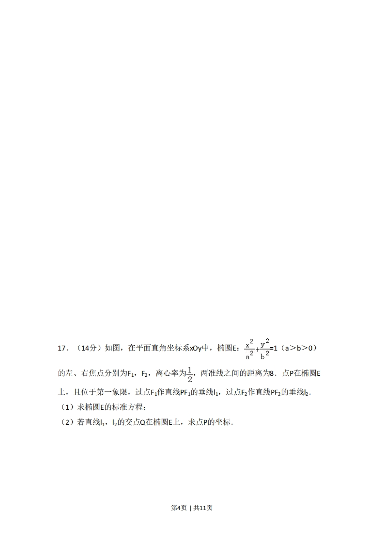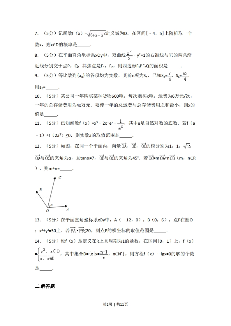 2017年江苏省高考数学试卷一填空题1.(5分)已知集合A={1,2},B={a,a243}.若A∩B={1},则实数a的值为2.(5分)已知复数z=(1+i)(1+2i),其中i是虚数单位,则z的模是3.(5分)某工厂生产甲、乙、丙、丁四种不同型号的产品,产量分别为200,400,300,100件.为检验产品的质量,现用分层抽样的方法从以上所有的产品中抽取60件进行检验,则应从丙种型号的产品中抽取件.4.(5分)如图是一个算法流程图:若输入x的值为1,则输出y的值是16开始输入xx21y←2y←2+1og2x输出结束5.(5分)若tan(a-T)=⊥则tana=466.(5分)如图,在圆柱002内有一个球0,该球与圆柱的上、下底面及母线均相切,记圆柱0,0,的体积为y,球0的体积为y,则一的值是一,00第1页1共11页7.(5分)记函数f(x)=V6+x-x2定义域为D.在区间[-4,5]上随机取一个数x,则xED的概率是8.(5分)在平面直角坐标系x0y中,双曲线-y2=1的右准线与它的两条渐3近线分别交于点P,Q,其焦点是F1,F2,则四边形FPF2Q的面积是9。(5分)等比数列a,的各项均为实数。其前n项为5,已知5,-子5受4则ag-10.(5分)某公司一年购买某种货物600吨,每次购买x吨,运费为6万元/次,一年的总存储费用为4x万元.要使一年的总运费与总存储费用之和最小,则x的值是11.(5分)已知函数f(x)=x3-2x+e×-1,其中e是自然对数的底数.若f(a-1)+f(2a2)≤0.则实数a的取值范围是12.(5分)如图,在同一个平面内,向量0A,0B,0C的模分别为1,1,√2,0A与0d的夹角为a,且tana=7,0与0d的夹角为45°.若0dm0A+n0(m,neR),则m+n=13.(5分)在平面直角坐标系x0y中,A(-12,0),B(0,6),点P在圆0:x2+y=50上.若PA·PB20,则点P的横坐标的取值范围是一14.(5分)设f(x)是定义在R上且周期为1的函数,在区间[0,1)上,f(x)x3,x∈D,其中集合D=xxnL,nEN,则方程(x)-gx=0的解的个数x,x卸是二解答题第2页|共11页15,(14分)如图,在三棱锥A-BCD中,ABLAD,BC⊥BD,平面ABD⊥平面BCD,点E、F(E与A、D不重合)分别在棱AD,BD上,且EFLAD.求证:(1)EF平面ABC;(2)ADLAC.AD16.(14分)已知向量(cosx,sinx),=(3,-√3),xE[0,元].(1)若ab,求x的值:(2)记f(x)=ab,求f(x)的最大值和最小值以及对应的x的值.第3页1共11页
