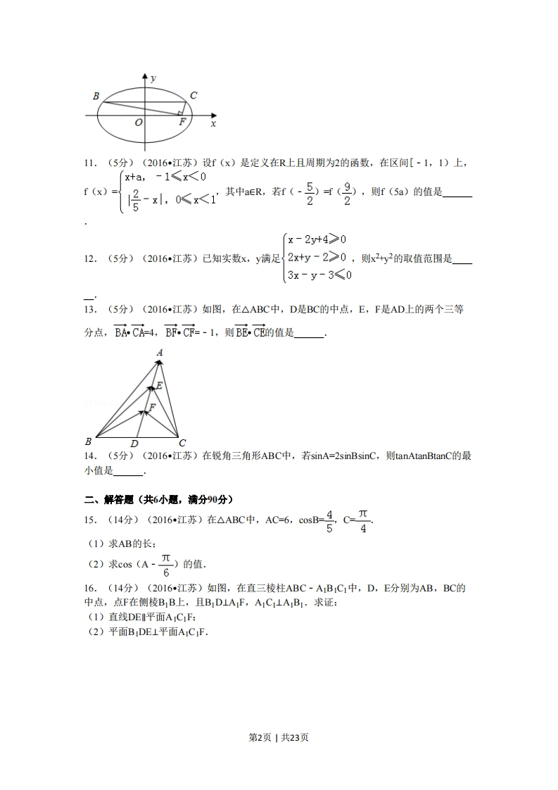 ba←a+4r输出a结束7.(5分)(2016江苏)将一颗质地均匀的骰子(一种各个面上分别标有1,2,3,4,5,6个点的正方体玩具)先后抛掷2次,则出现向上的点数之和小于10的概率是8.(5分)(2016江苏)己知{an}是等差数列,Sn是其前n项和,若a1+a22=-3,S=10,则ag的值是9.(5分)(2016江苏)定义在区间[0,3n]上的函数y=sin2x的图象与y=cosx的图象的交点个数是0.(5分)2016江苏)如图,在平面直角坐标系Ov中,F是椭圆x2y21(a>b>0a2 b2)的右焦点,直线y=b与椭圆交于B,C两点,且∠BFC=90,则该椭圆的离心率是第1页|共23页11.(5分)(2016江苏)设f(x)是定义在R上且周期为2的函数,在区间[-1,1)上,x+a,-1≤x<0f(x)=层-x,0<1其中R若都(-受寸(号,斯r(a)的值是2「x-2y叶4012.(5分)(2016江苏)已知实数x,y满足{2x+y-2>0,则x2+y2的取值范围是3x-y-3≤013.(5分)(2016江苏)如图,在△ABC中,D是BC的中点,E,F是AD上的两个三等分点,BACA4,B丽C丽=-1,则B丽C的值是D14.(5分)(2016江苏)在锐角三角形ABC中,若sinA=2 sinBsinC,则tanAtanBtanC的最小值是二、解答愿(共6小题,满分90分)15.(14分)(2016江苏)在△ABC中,AC=6,cosB=4,C=T5(1)求AB的长:(2)求cos(A-工)的值,616.(14分)(2016江苏)如图,在直三棱柱ABC-AB1C1中,D,E分别为AB,BC的中点,点F在侧棱B1B上,且B1DLAF,A1C⊥AB1·求证:(1)直线DE平面A1CF:(2)平面BDE⊥平面ACF.第2页1共23页CA81EDB17.(14分)(2016江苏)现需要设计一个仓库,它由上下两部分组成,上部的形状是正四棱锥P-A1B1CD1,下部的形状是正四棱柱ABCD-ABC1D1(如图所示),并要求正四棱柱的高O1O是正四棱锥的高PO1的4倍.(1)若AB=6m,P01=2m,则仓库的容积是多少?(2)若正四棱锥的侧棱长为6m,则当PO1为多少时,仓库的容积最大?pDICiACB18.(16分)(2016江苏)如图,在平面直角坐标系xOy中,己知以M为圆心的圆M:x2+y2-12x-14y+60=0及其上点A(2,4).(1)设圆N与x轴相切,与圆M外切,且圆心N在直线x=6上,求圆N的标准方程:(2)设平行于OA的直线I与圆M相交于B、C两点,且BC=OA,求直线I的方程:(3)设点T(t,O)满足:存在圆M上的两点P和Q,使得TA+T下-T回,求实数t的取值范围M019.(16分)(2016江苏)己知函数f(x)=a+b(a>0,b>0,a时1,b时1)·)设a2,6号①求方程f(x)=2的根:②若对于任意xeR,不等式f(2x)mf(x)-6恒成立,求实数m的最大值:(2)若01,函数g(x)=f(x)-2有且只有1个零点,求ab的值,第3页|共23页