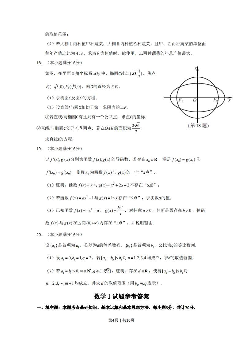 Q6>0)的右焦点FC0到一条商近线的距离为5。c,则其离心率的值是49.函数fx)满足f(x+4)=f(x(x∈R),且在区间(-2,2]上,f(x)=aos受012a1成立的n的最小值为▲二、解答愿:本大题共6小题,共计90分。请在答题卡指定区域内作答,解答时应写出文字说明、证明过程或演算步骤.D15.(本小题满分14分)在平行六面体ABCD-ABCD中,AA,=AB,AB⊥BC·求证:(1)AB∥平面ABC:(2)平面ABBA⊥平面ABC.(第15题)16.(本小题满分14分)已知a,B为锐角,tana=3,cos(a+)=-V5(1)求c0s2a的值:(2)求tan(a-B)的值.17.(本小题满分14分)某农场有一块农田,如图所示,它的边界由圆O的一段圆弧MPN(P为此圆弧的中点)和线段MW构成.己知圆O的半径为40米,点P到MW的距离为50米.现规划在此农田上修建两个温室大棚,大棚I内的地块形状为矩形ABCD,大棚Ⅱ内的地块形状为△CDP,要求A,B均在线段MN上,C,D均在圆弧上.设OCD与MN所成的角为O.(1)用0分别表示矩形ABCD和△CDP的面积,并确定sinO第3页|共16页B(第17题)