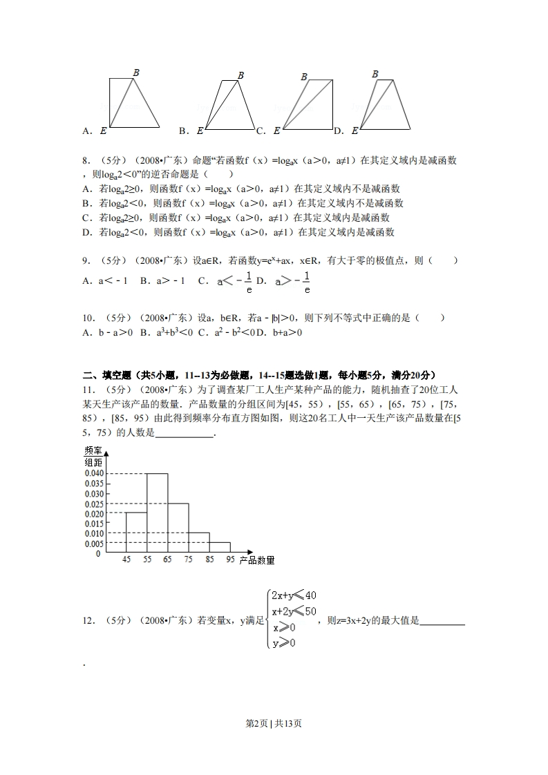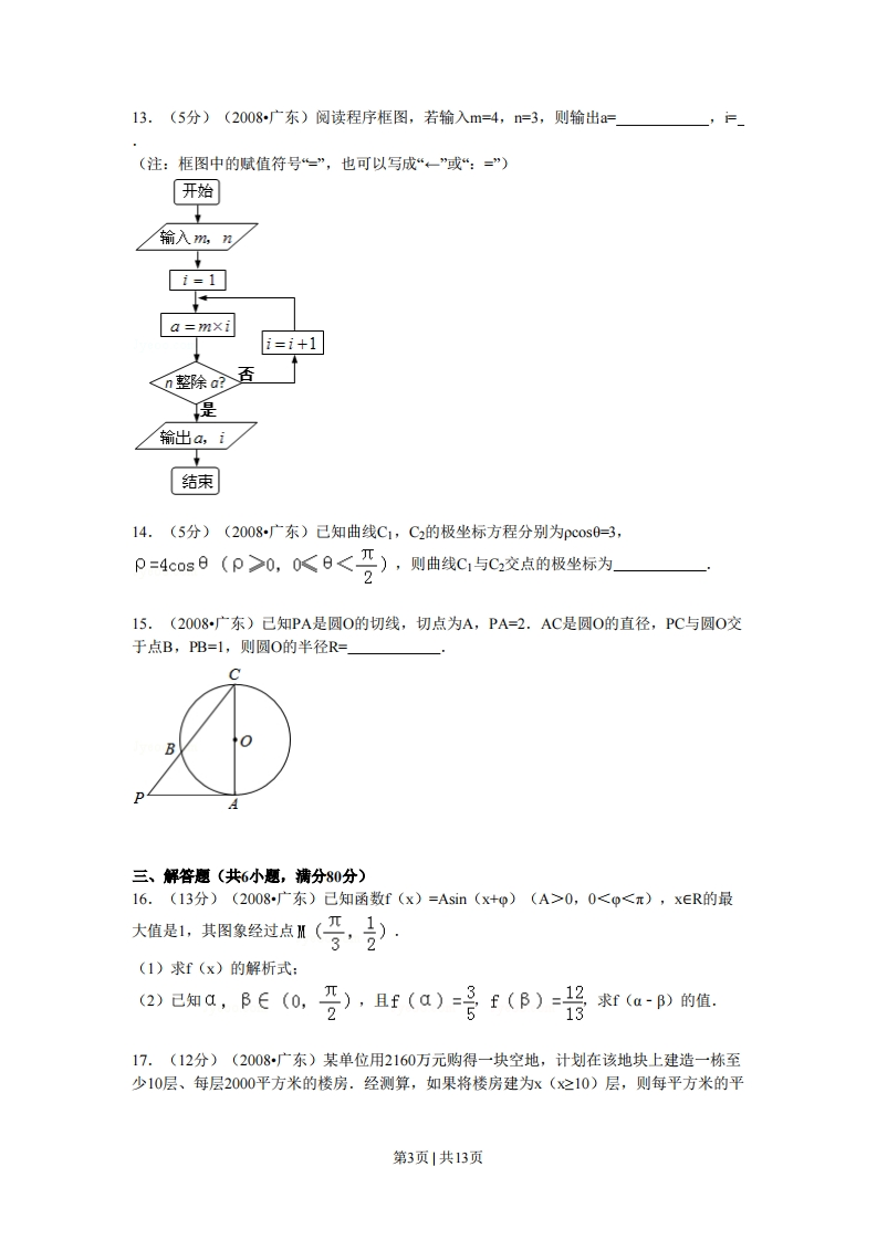 2008年高考数学试卷(文)(广东)(解析卷)虎虎1个月前发布关注0.30MB13页3414 第1页 / 共13页 第2页 / 共13页 第3页 / 共13页 第4页 / 共13页 该文档为免费文档,您可直接下载完整版进行阅读 2008年高考数学试卷(文)(广东)(解析卷)此内容为免费资源,请登录后查看¥0 登录查看免费资源THE END数学 文本预览 2008年广东省高考数学试卷(文科)一、选择题(共10小题,每小题5分,满分50分)1.(5分)(2008广东)第二十九届夏季奥林匹克运动会将于2008年8月8日在北京举行,若集合A={参加北京奥运会比赛的运动员},集合B={参加北京奥运会比赛的男运动员},集合C={参加北京奥运会比赛的女运动员},则下列关系正确的是()A.ACBB.BCCC.AnB=C D.BUC=A2.(5分)(2008广东)己知00,a1)在其定义域内是减函数,则1oga2<0的逆否命题是()A.若1oga220,则函数f(x)=logax(a>0,a时1)在其定义域内不是减函数B.若1og2<0,则函数f(x)=logax(a>0,a1)在其定义域内不是减函数C.若1og220,则函数f(x)Hogax(a>0,a时1)在其定义域内是减函数D.若loga2<0,则函数f(x)=logax(a>0,a时1)在其定义域内是减函数9.(5分)(2008广东)设aeR,若函数y=ex+ax,xER,有大于零的极值点,则()A.a<-1B.a>-1C.a<-lD.a>-ee10.(5分)(2008广东)设a,bER,若a->0,则下列不等式中正确的是()A.b-a>0B.a3+b3<0C.a2-b2<0D.b+a>0二、填空题(共5小题,11-13为必做题,14-15题选做1题,每小题5分,满分20分)11.(5分)(2008广东)为了调查某厂工人生产某种产品的能力,随机抽查了20位工人某天生产该产品的数量.产品数量的分组区间为45,55),[55,65),[65,75),[75,85),[85,95)由此得到频率分布直方图如图,则这20名工人中一天生产该产品数量在⑤55,75)的人数是频率、组距0.0400.0350.0300.0250.0200.015h0.0100.005045556的758595产品数里2x+y≤40x+2y≤5012.(5分)(2008广东)若变量x,y满足x>0,则z=3x+2y的最大值是」y0第2页1共13页13.(5分)(2008广东)阅读程序框图,若输入m=4,n=3,则输出a=」(注:框图中的赋值符号“=”,也可以写成“←一”或“:=”)开始输入m,ni=1a=mxii=i+1Q整除2百是输出a,i结束14.(5分)(2008广东)已知曲线C1,C2的极坐标方程分别为pcos0=3,0=4c0s9(p>0,0<0<受),则曲线C1与c议点的极坐标为15.(2008广东)己知PA是圆O的切线,切点为A,PA=2.AC是圆O的直径,PC与圆O交于点B,PB=1,则圆O的半径R=B三、解答题(共6小题,满分80分)16.(13分)(2008广东)已知函数f(x)=Asin(x+0)(A>0,0<0<π),x∈R的最大值是1,其图象经过点1(兮,》·(1)求f(x)的解析式:(2)已知a,B∈(0,罗),且E(a)=号f(B)=号灯a~)的值1317.(12分)(2008广东)某单位用2160万元购得一块空地,计划在该地块上建造一栋至少10层、每层2000平方米的楼房.经测算,如果将楼房建为x(x之10)层,则每平方米的平第3页|共13页 查看更多 收起部分 喜欢就支持一下吧点赞14 分享QQ空间微博QQ好友海报分享复制链接收藏