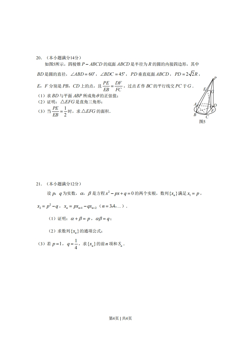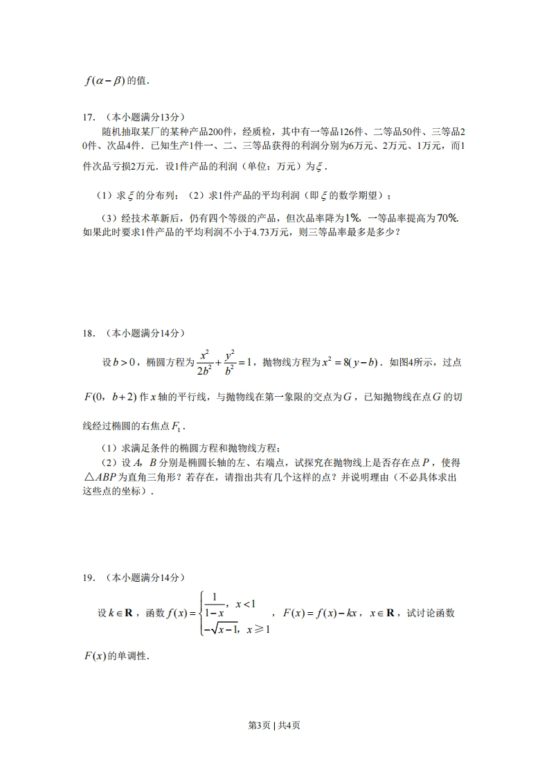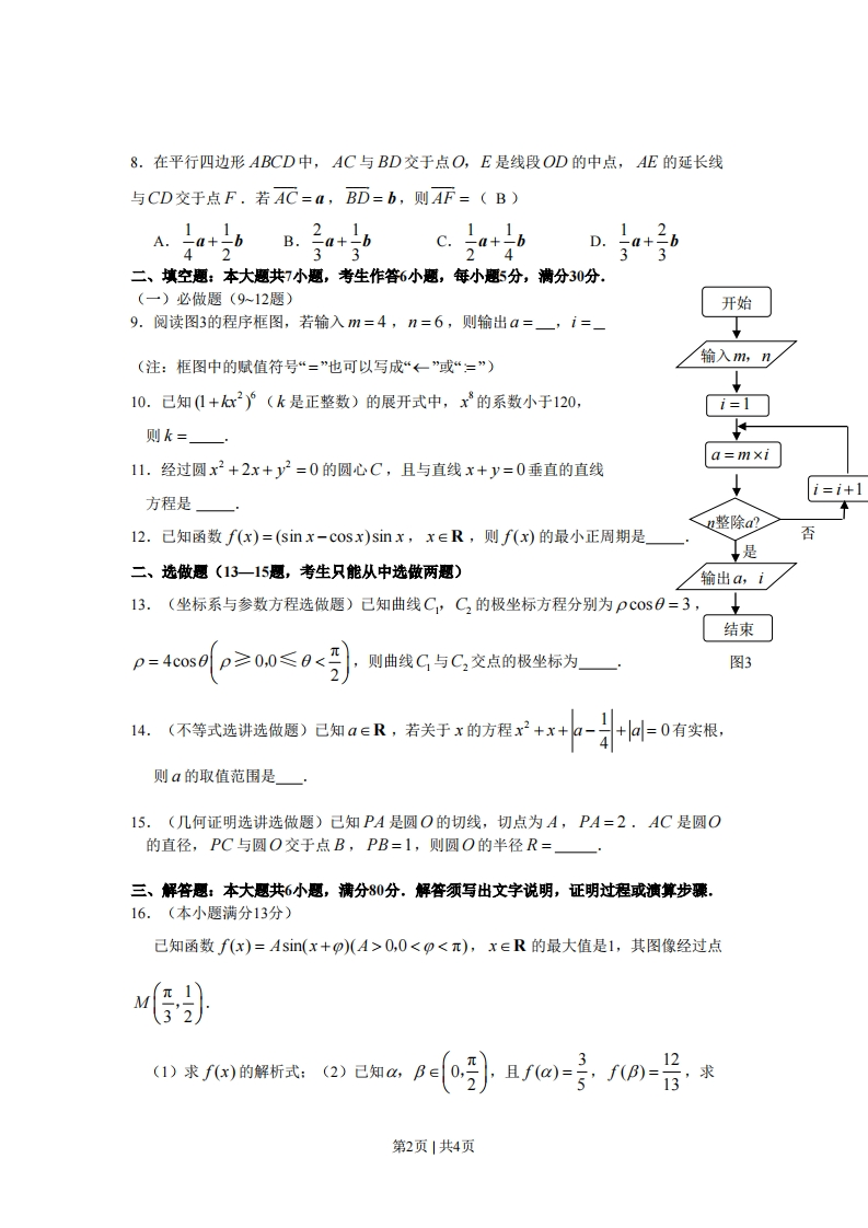 -3B.a<-3C.a>-3D.a<-3第1页|共4页8.在平行四边形ABCD中,AC与BD交于点O,E是线段OD的中点,AE的延长线与CD交于点F.若AC=a,BD=b,则AF=(B)A.+B.aD.a+2b33c+43"3二、填空题:本大题共7小题,考生作答6小题,每小题5分,满分30分.(一)必做题(9~12题)开始9.阅读图3的程序框图,若输入m=4,n=6,则输出a=一,i=(注:框图中的赋值符号“=”也可以写成“←-”或“=”)输入m,n10.己知1+2)(k是正整数)的展开式中,x的系数小于120,则k=一a=mxi11.经过圆x2+2x+y2=0的圆心C,且与直线x+y=0垂直的直线i=i+1方程是<整除a?12.己知函数f(x)=(sinx-cosx)sinx,x∈R,则f(x)的最小正周期是」否1是二、选做愿(13一15题,考生只能从中选做两题)输出a,i13.(坐标系与参数方程选做题)己知曲线C,C2的极坐标方程分别为PC0sB=3结束p=4cosp≥0.0≤0<则曲线C与C2交点的极坐标为图34+=0有实根,114.(不等式选讲选做题)己知a∈R,若关于x的方程x2+x+a-则a的取值范围是一15.(几何证明选讲选做题)己知PA是圆O的切线,切点为A,PA=2,AC是圆O的直径,PC与圆O交于点B,PB=1,则圆O的半径R=三、解容愿:本大题共6小题,满分80分,解答须写出文字说明,证明过程或演算步骤.16.(本小题满分13分)己知函数f(x)=Asin(x+p)(A>0,00,后周方程为云+号-1,是物线方程为=一.南阳所示、过点F(0,b+2)作x轴的平行线,与抛物线在第一象限的交点为G,己知抛物线在点G的切线经过椭圆的右焦点F·(1)求满足条件的椭圆方程和抛物线方程:(2)设A,B分别是椭圆长轴的左、右端点,试探究在抛物线上是否存在点P,使得△ABP为直角三角形?若存在,请指出共有几个这样的点?并说明理由(不必具体求出这些点的坐标).19.(本小题满分14分),x<1设k∈R,函数f(x)1-x,F)=f)-:,x∈R,试讨论函数-Vx-1,x≥1F(x)的单调性.第3页|共4页