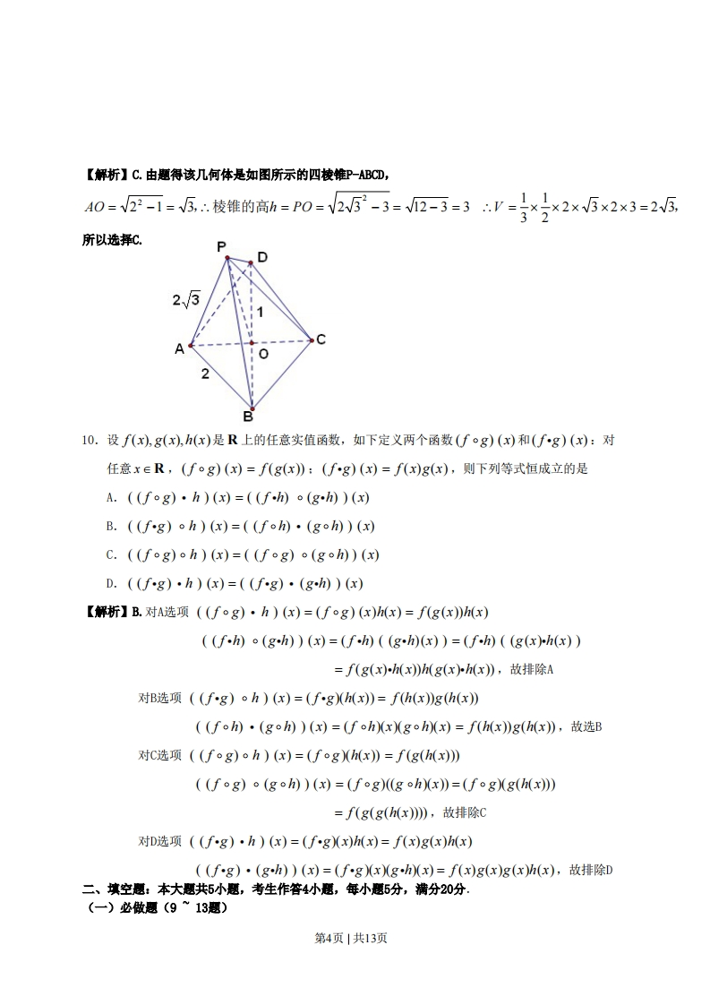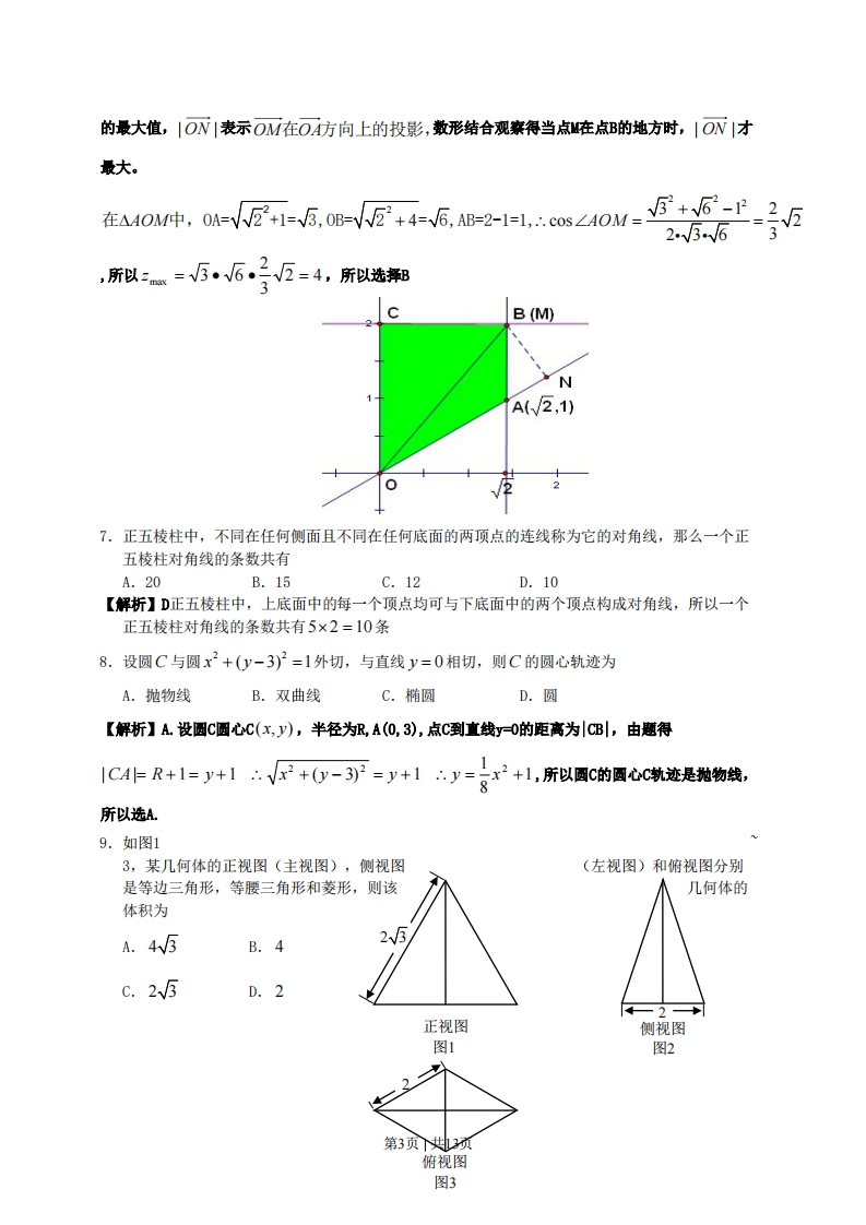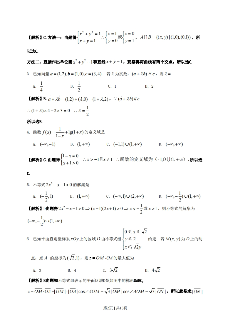 绝密★启用前试卷类型:B2011年普通高等学校招生全国统一考试(广东卷)数学(文科)本试题共4页,21小题,满分150分,考试用时120分钟。注意事项:1.答卷前,考生务必用黑色字迹的钢笔或签字笔将自己的姓名和考生号、试室号、座位号填写在答题卡上。用2B铅笔将试卷类型(A)填涂在答题卡相应位置上。将条形码横贴在答题卡右上角“条形码粘贴处”。2.选择题每小题选出答案后,用2B铅笔把答题卡上对应题目选项的答案信息点涂黑。如需改动,用橡皮擦干净后,再选涂其他答案,答案不能答在试卷上。3.非选择题必须用黑色字迹钢笔或签字笔作答,答案必须写在答题卡各题目指定区域内相应位置上:如需改动,先划掉原来的答案,然后再写上新的答案:不准使用铅笔和涂改液。不按以上要求作答的答案无效。4.作答选做题时,请先用B铅笔填涂选做题的题号对应的信息点,再作答。漏涂、错涂、多涂的,答案无效。5.考生必须保持答题卡的整洁。考试结束后,将试卷和答题卡一并交回。参考公式:锥体体积公式V=二Sh,其中S为锥体的底面积,h为锥体的高。32x-0y-列线性回归方程y=br+a中系数计算公式b=a=y-6诉,x-i=l样本数据,。,…式,的标准差,5=分【-+(化-+…+(化,-],其中x,y表示样本均值.n是正整数,则a”-b”=(a-b)(a"-+a"-2b+…+ab-2+b”-).一、选择题:本大题共10小题,每小题5分,满分50分,在每小题给出的四个选项中,只有一项是符合题目要求的.1.设复数z满足z=1,其中i为虚数单位,则z=A.-iB.ic.-1D.1【解折】A由题得:=三=-i所以选Ai ix(-i)2.己知集合A={(xy)川x,y为实数,且x2+y2=1},B={(x,y)川x,y为实数,且x+y=1},则A⌒B的元素个数为A.4B.3C.2D.1第1页|共13页【解析】C.方法一:由题得x+y=1=0或=14n8=x10,o,,所x2+y2=1x=l或x=0,以选C.方法二:直接作出单位圆x2+y2=1和直线x+y=1,观察得两曲线有两个交点,所以选C.3.已知向量1=(1,2),b=(1,0),c=(3,4).若元为实数,(a+b)∥c,则元=C.1D.2【解折】B.a+b=(1,2)+(,0)=(1+元,2),(a+b)∥c(1+)×4-2×3=0元=5所以选B.4.函数f()=,1+lg(1+x)的定义域是1-xA.(-0,-1)B.(1,+0)C.(-1,1)U(1,+o)D.(-0,+0)[1-x≠0【解析】C.由题得“x>-1且x≠1∴函数的定义域为(-1,DU(,+o),所以选x+1>0C.5.不等式2x2-x-1>0的解集是B.(1,+0)C.(-0,1)U(2,+o)D.(0,-U0,o)1【解折】D由题得2-x-1>0→(x-12x+)>0→x<-2或x>1,则不等式的解集为(0,-2U(1,t0)0≤x≤瓦6.已知平面直角坐标系xOy上的区域D由不等式组{y≤2给定.若M(x,y)为D上的动x≤V2y点,点A的坐标为(2,1),则z=OMOA的最大值为A.3B.4c.35D.45【解析】B由题知不等式组表示的平面区域D是如图中的梯形OABC,z=Oi.OAOM1-OA|cos∠AOM=√51OM1cos∠AOM=V51ON1,所以就是求ON1第2页|共13页的最大值,|ON|表示OM在OA方向上的投影,数形结合观案得当点M庄点B的地方时,|ON|才最大。在AM0M中,04=-E1=5.0B-E+4=5.A2-1los∠40M-5+5--252.563,所以:=56,反=4,所以选和B(M)NA(V2,1)7.正五棱柱中,不同在任何侧面且不同在任何底面的两顶点的连线称为它的对角线,那么一个正五棱柱对角线的条数共有A.20B.15C.12D.10【解析】D正五棱柱中,上底面中的每一个顶点均可与下底面中的两个顶点构成对角线,所以一个正五棱柱对角线的条数共有5×2=10条8.设圆C与圆x2+(y-3)2=1外切,与直线y=0相切,则C的圆心轨迹为A.抛物线B.双曲线C.椭圆D.圆【解析】A设圆C圆心C(x,y),半径为R,A(O,3),点C到直线yO的距高为|CB|,由题得1C非R+1=y+1V+0y-3刃=y+1y=8产+l,所以圈c的圈c轨迹是抛物线,所以选A9.如图13,某几何体的正视图(主视图),侧视图(左视图)和俯视图分别是等边三角形,等腰三角形和菱形,则该几何体的体积为A.4W325B.4C.25D.2正视图侧视图图1图2第3页共虬预俯视图图3