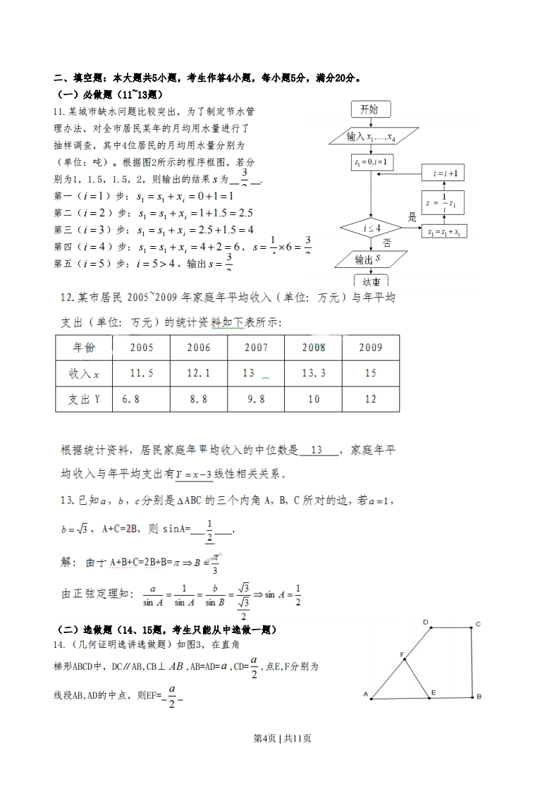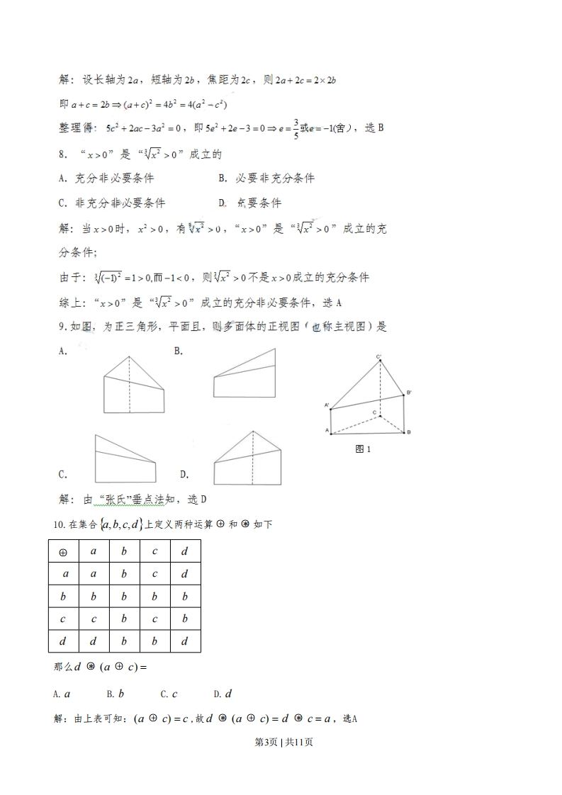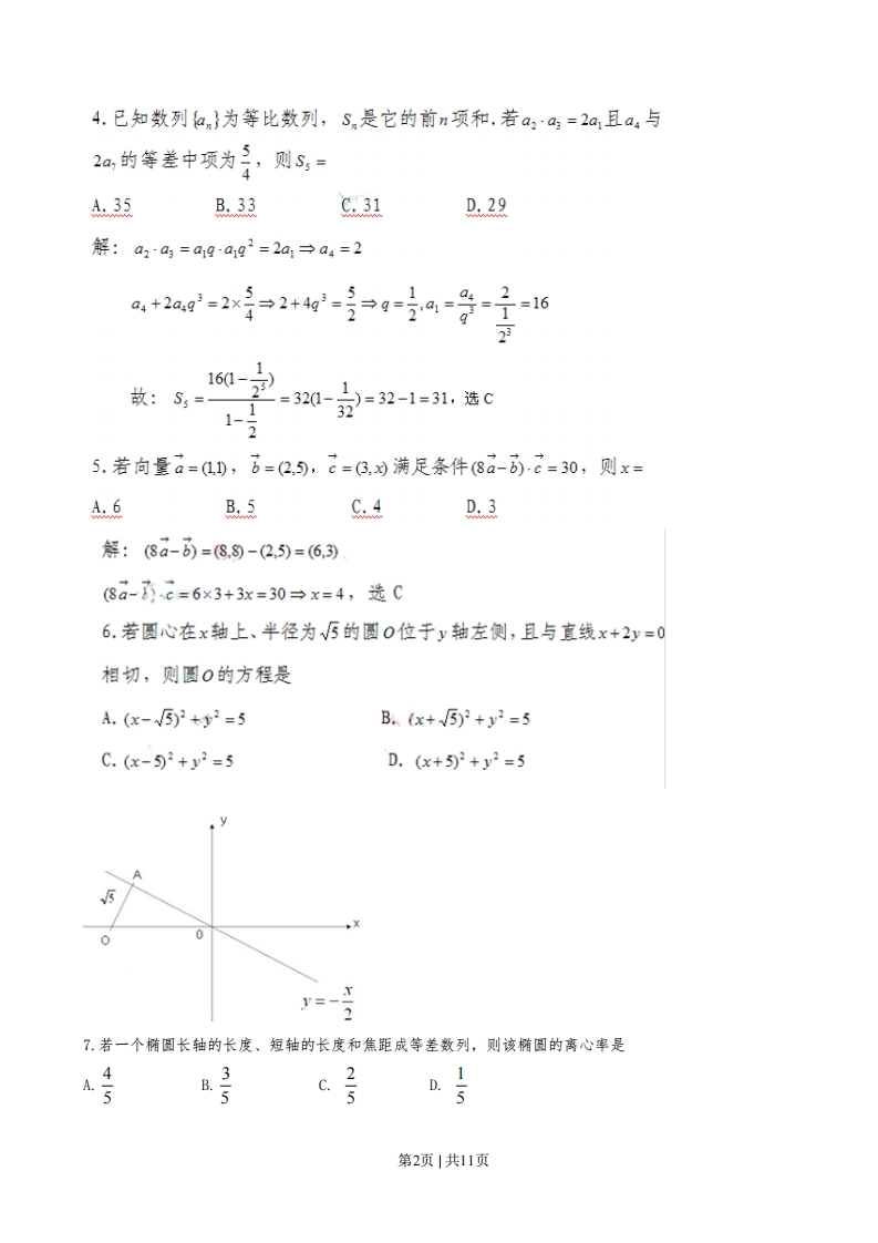 绝密★启用前试卷类型:B2010年普通高等学校招生全国统一考试(广东卷)数学(文科)本试卷共4页,21小题,满分150分。考试用时120分钟。注意事项:1.答卷时,考生务必用黑色字迹的钢笔或签字笔将自己的姓名和考生号、试室、座位号填写在答题卡上。用2B铅笔将试卷类型(B)填涂在答题卡相应位置上。将条形码横贴在答题卡右上角“条形码粘贴处”。2选择题每小题选出答案后,用2B铅笔把答题卡上对应题目选项的答案信息点涂黑,如需改动,用橡皮擦干净后,再选涂其他答案,答案不能答在试卷上。3.非选择题必须用黑色字迹钢笔或签字笔作答,答案必须写在答题卡各题指定区域内相应位置上;如需改动,先划掉原来的答案,然后再写上新的答案;不准使用铅笔和涂改液。不按以上要求作答的答案无效4.作答选作题时,请先用2B铅笔填涂选做题的题号对应的信息点,再作答。5.考生必须保持答题卡的整洁。考试结束后,将试卷和答题卡一并交回。参考公式:锥体的体积公式V=Sh,其中S是锥体的底面积,h是锥体的高。一、选择题:本大题共10小题,每小题5分,满分50分.在每小题给出的四个选项中,只有一项是符合题目要求的.1.若集合A={0,1,2,3},B={1,2,4}则集合AUB=A.{0,123,4}B.{1,2,3,4}C.{1,2}D0}解:并集,选A2.函数f(x)=lg(x-1)的定义域是A.(2,+0)B.(1,+o)C.[l,+o)D.[2,+o)解:x-1>0,得x>1,选B.3.若函数f(x)=3+3与g(x)=3-3的定义域均为R,则A.f(x)与g(x)与均为偶函数B.f(x)为奇函数,gx)为偶函数C.f(x)与g(x)与均为奇函数D.f(x)为偶函数,g(x)为奇函数解:由于f(-x)=3+3-)=f(x),故f(x)是偶函数排除B、C由题意知,圆心在y轴左侧,排除A、C在△00,=因=方故0A_51→00=5,选D00005第1页|共11页4.已知数列{an}为等比数列,Sn是它的前n项和.若a2a3=2a且a4与2a,的等差中项为,则3,=A.35B.33C.31D.29解:a2a=a9-a92=2a→a4=2a+2ag-22+4g-g=4-号-2-1612160-3故:S==32-1=31,选c-=3201-15.若向量a=1),=2.),c=3.为满足条件8a-)-c=30,则x=4.6B.5c.4D.3解:(8a-=8.9-2.5)=(63)(8a-万c=6×3+3x=30→x=4,选C6.若圆心在x轴上、半径为√5的圆0位于y轴左侧,且与直线x+2y=0相切,则圆0的方程是A.(x-5)2+y2=5B.(x+√5)2+y2=5C.(x-)2+y2=5D.(x+5)2+y2=5AX027.若一个椭圆长轴的长度、短轴的长度和焦距成等差数列,则该椭圆的离心率是50.5第2页|共11页解:设长轴为2a,短轴为2b,焦距为2c,则2a+2c=2×2b即a+c=2b台(a+c)2=4b2=4(a2-c)整理得:5c2+2ac-3a2=0,即5e2+2e-3=0→e=3或e=-1舍),选B8.“x>0”是“x>0”成立的A.充分非必要条件B.必要非充分条件C.非充分非必要条件D.充要条件解:当x>0时,x2>0,有>0,“x>0”是“F>0”成立的充分条件:由于:-)=1>0,而-1<0,则2>0不是x>0成立的充分条件综上:“x>0”是“x>0”成立的充分非必要条件,进A9.如图,为正三角形,平面且,则多面体的正视图(也称主视图)是A.B图1C.解:由“张氏”垂点法知,选D10.在集合a,b,C,d}上定义两种运算©和国如下⊕abdaadb6bbdd6bd那么d⑧(a⊕c)=A.aB.bC.cD.d解:由上表可知:(a©c)=c,故d⑧(a©c)=d®c=a,选A第3页|共11页