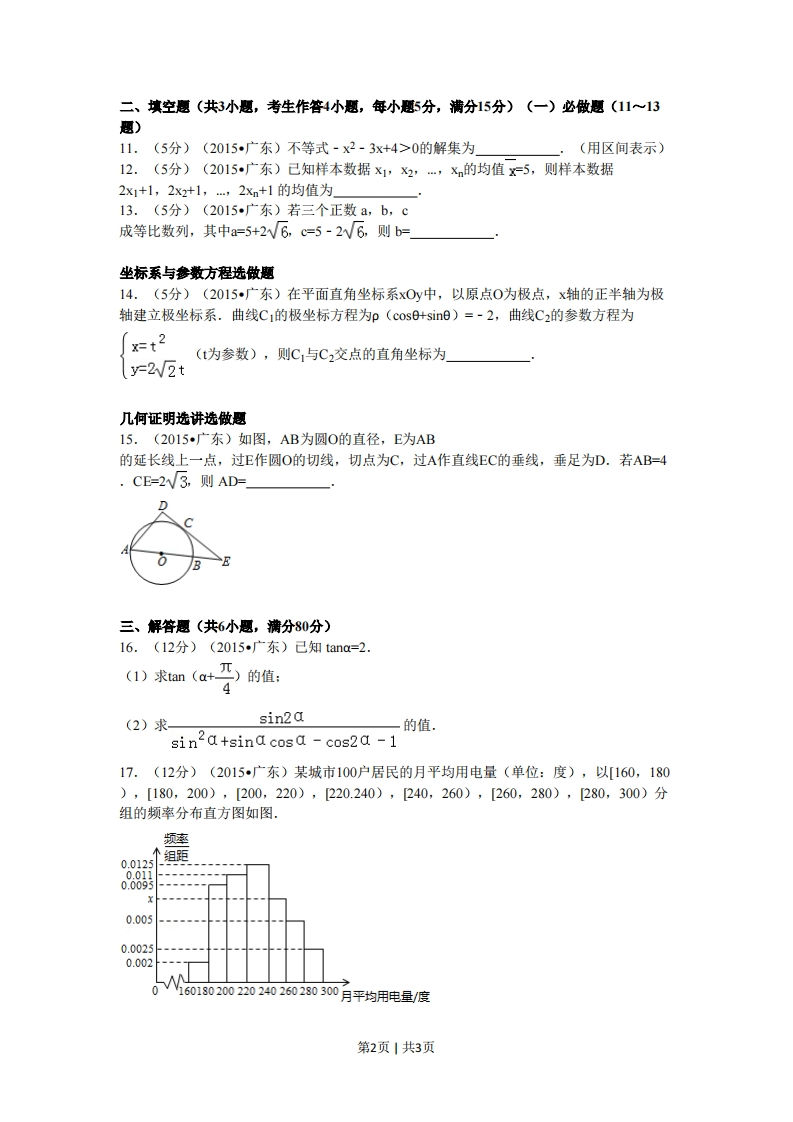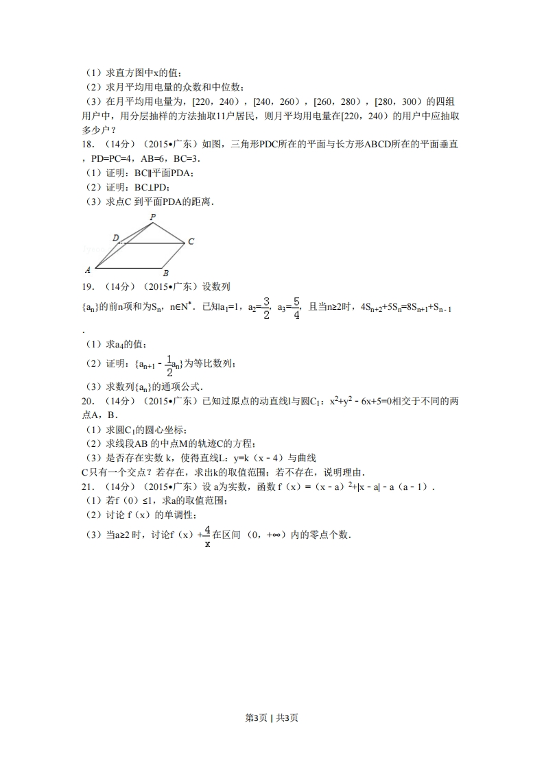 2015年广东省高考数学试卷(文科)一、选择题(共10小题,每小题5分,满分50分)2015年普通高等学校招生全国统一考试(广东卷)数学(文科)1.(5分)(2015广东)若集合M={-1,1},N={-2,1,0}则MnN=()A.{0.-1}B.{0}C.1}D.{-1,1}2.(5分)(2015广东)已知i是虚数单位,则复数(1+i)2=()A.2iB.-2iC.2D.-23.(5分)(2015广东)下列函数中,既不是奇函数,也不是偶函数的是()A.y=x+sin2x B.y2-cosx C.y=2x+1 D.y=x2+sinx28x+2y≤24.(5分)(2015广东)若变量x,y满足约束条件{x+y0,则z=2x+3y的最大值为(x4A.2B.5C.8D.105.(5分)(2015广东)设△ABC的内角A,B,C的对边分别为a,b,c.若a=2,c=23,cosA-5.且b0252)的左焦点为F1(-4,0),则m=()A.2B.3C.4D.99.(5分)(2015广东)在平面直角坐标系x0y中,己知四边形ABCD是平行四边形,AB=(1,-2),AD(2,1)则ADAC()A.5B.4C.3D.210.(5分)(2015广东)若集合E={(p,q,r,s)0s印0的解集为(用区间表示)12.(5分)(2015广东)己知样本数据x1,X2,,xn的均值x=5,则样本数据2x1+1,2X2+1,,2Xn+1的均值为13.(5分)(2015广东)若三个正数a,b,c成等比数列,其中a=5+2√6,c=5-2√6,则b=坐标系与参数方程选做题14.(5分)(2015广东)在平面直角坐标系xOy中,以原点0为极点,x轴的正半轴为极轴建立极坐标系.曲线C1的极坐标方程为p(cos0+si0)=-2,曲线C2的参数方程为xt2(t为参数),则C与C2交点的直角坐标为y=2V2t几何证明选讲选做题15.(2015广东)如图,AB为圆0的直径,E为AB的延长线上一点,过E作圆O的切线,切点为C,过A作直线EC的垂线,垂足为D.若AB=4.CE=2W3,则AD=三、解答题(共6小题,满分80分)16.(12分)(2015广东)己知tana=2.(1)求tan(a+兀)的值:(2)求sin2a的值。sin2a+sina cosa-cos2a-117.(12分)(2015广东)某城市100户居民的月平均用电量(单位:度),以[160,180),[180,200),[200,220),[220.240),240,260),[260,280),[280,300)分组的频率分布直方图如图.频率个组距0.0120.0110.00950.0050.00250.002160180200220240260280300月平均用电量/度第2页1共3页(1)求直方图中x的值:(2)求月平均用电量的众数和中位数:(3)在月平均用电量为,[220,240),240,260),[260,280),[280,300)的四组用户中,用分层抽样的方法抽取11户居民,则月平均用电量在[220,240)的用户中应抽取多少户?18.(14分)(2015广东)如图,三角形PDC所在的平面与长方形ABCD所在的平面垂直PD=PC=4,AB=6,BC=3.(1)证明:BCI平面PDA:(2)证明:BC⊥PD:(3)求点C到平面PDA的距离.B19.(14分)(2015广东)设数列{am的前n项和为S。,neN.已知a-l,-号6s-号且当n2时,458=8r54(1)求a4的值:(2)证明:1是为等比数列:(3)求数列{an}的通项公式.20.(14分)(2015广东)己知过原点的动直线1与圆C1:x2+y2-6x+5=0相交于不同的两点A,B.(1)求圆C1的圆心坐标:(2)求线段AB的中点M的轨迹C的方程:(3)是否存在实数k,使得直线L:y=k(x-4)与曲线C只有一个交点?若存在,求出k的取值范围:若不存在,说明理由.21.(14分)(2015广东)设a为实数,函数f(x)=(x-a)2+k-al-a(a-1).(1)若f(0)s1,求a的取值范围:(2)讨论f(x)的单调性:(3)当a≥2时,讨论f(x)+4在区间(0,+∞)内的零点个数.第3页1共3页