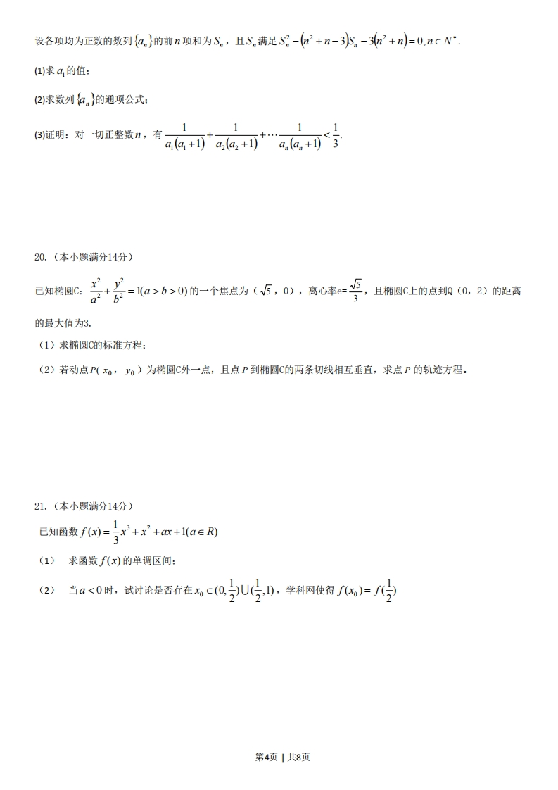 试卷类型:A2014年普通高等学校招生全国统一考试(广东卷)数学(文科)试题及答案本试卷共4页,21题,满分150分。考试用时120分钟。注意事项:1.答卷前,考生务必用黑色字迹的钢笔或签字笔将自己的姓名和考生号、试室号、座位号填写在答题卡上。用2B铅笔将试卷类型(A)填涂在答题卡相应位置上。将条形码横贴在答题卡右上角“条形码粘贴处”。2.选择题每小题选出答案后,用B铅笔把答题卡对应题目选项的答案信总点涂黑,如需改动,用橡皮擦干净后,再选涂其他答案,答案不能答在试卷上。3.非选择题必须用黑色字迹钢笔或签字笔作答,答案必须写在答题卡各题目指定区域相应位置上:如需改动,先划掉原来的答案,然后再写上新的答案:不准使用铅笔盒涂改液。不按以上要求作答的答案无效。4.作答选做题时,请先用2B铅笔填涂选做题的题号对应的信息点,再作答。漏涂、错涂、多涂的,答案无效。5.考生必须保持答题卡的整洁。考试结束后,将试卷和答题卡一并交回。参考公式:锥体的体积公式V=%,其中S为维体的底面积。方为锥体的高。一组数据,2,,xn的方差2=[1-)2+(2-)2++(任n-)2],其中x表示这组数据的平均数一、选择题:本大题共10小题,每小题5分,满分50分,在每小题给出的四个选项中,只有一项是符合题目要求的1.己知集合M={2,3,4},N={0,2,3,5},则M∩N=()A.{0,2}B.{2,3}C.{3,4}D.{3,5}2.己知复数z满足(3-4)z=25,则z=()A.-3-41B.-3+4iC.3-4iD.3+4i3.己知向量a=(1,2),b=(3,1)则b-a=()A.(-2,1)B.(2,-1)C.(2,0)D.(4,3)x+2y≤84.若变量x,y满足约束条件0≤x≤4,则z=2x+y的最大值等于()0≤y≤3A.7B.8C.10D.115.下列函数为奇函数的是()A.2、1B.x3 sin xC.2cosx+1D.x2+226.为了解1000名学生的学习情况,采用系统抽样的方法,从中抽取容量为40的样本,则分段的间隔为()A.50B.40C.25D.20第1页1共8页7.在△4BC中,角A,B,C所对应的边分别为a,b,c,则“a≤b”是“sinA≤sinB”的()A充分必要条件B.充分非必要条件C.必要非充分条件D.非充分非必要条件8若实数k满足0