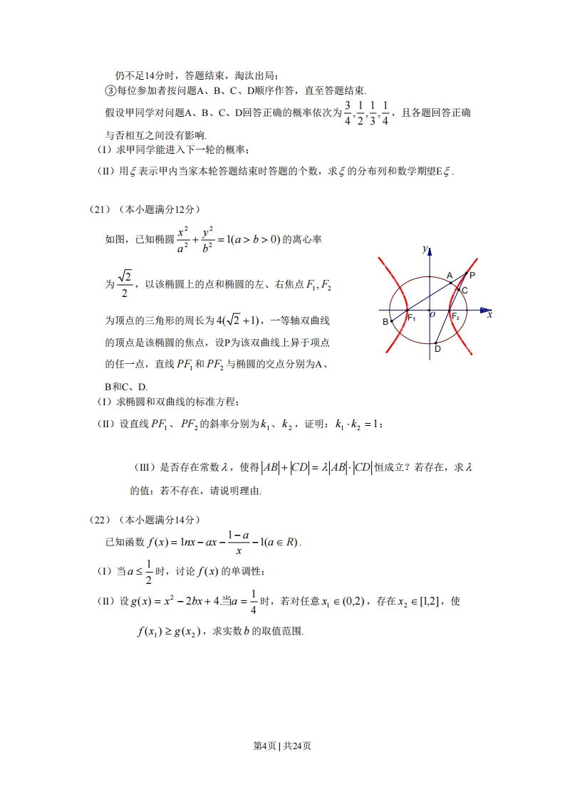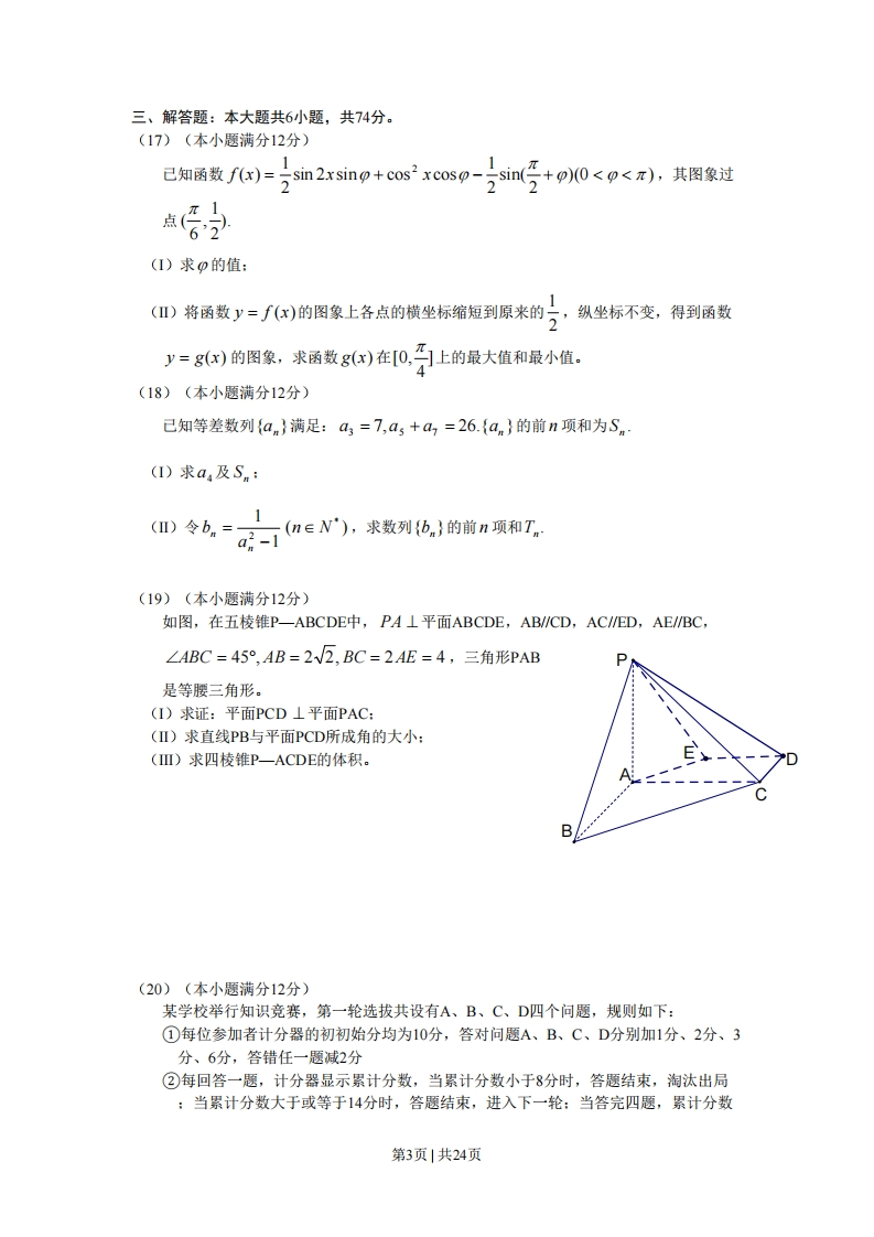 3}(D){x|x≤-1或x≥3}(2)已知4+2i=b+ia,b∈网,其中i为虚数单位,则a+b=i(A)-1(B)1(C)2(D)3(3)在空间,下列命题正确的是(A)平行直线的平行投影重合(B)平行于同一直线的两个平面平行(C)垂直于同一平面的两个平面平行(D)垂直于同一平面的两条直线平行(4)设f(x)为定义在R上的奇函数,当x≥0时,f(x)=2+2x+b(b为常数),则f(-1)=(A)3(B)1(C)-1(D)-3(5)已知随机变量服从正态分布N(1,σ2),若P(5>2)=0.023,则P(-2≤5≤2)=(A)0.477(B)0.628(C)0.954(D)0.977(6)样本中共有五个个体,其值分别为α,0,1,2,3,若该样本的平均值为1,则样本方差为66(A)(B)5(C)V2(D)2(7)由曲线y=x2,y=x3围成的封闭图形面积为(A)12(B)1(c)13(D)712(8)某台小型晚会由6个节目组成,演出顺序有如下要求:节目甲必须排在前两位,节目乙不能排在第一位,节目丙必须排在最后一位,该台晚会节目演出顺序的编排方案共有(A)36种(B)42种(C)48种(D)54种(9)设{an}是等比数列,则“a10,,x≤a恒成立,x2+3x+1则a的取值范围是一。(15)在△ABC中,角A,B,C所对的边分别为a,b,c,输出y若a=√2,b=2,sinB-cosB=√2,则角A的大小结束为一·(16)己知圆C过点(1,0),且圆心在x轴的正半轴上,直线1:y=x一1被圆C所截得的弦长为2√2,则过圆心且与直线1垂直的直线的方程为一。第2页1共24页三、解答题:本大题共6小题,共74分。(17)(本小题满分12分)1函数f因)=7sin2 xsin+cosxcosp-7sin(号+p0<9