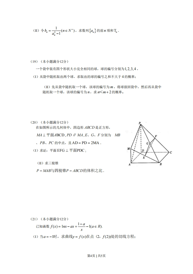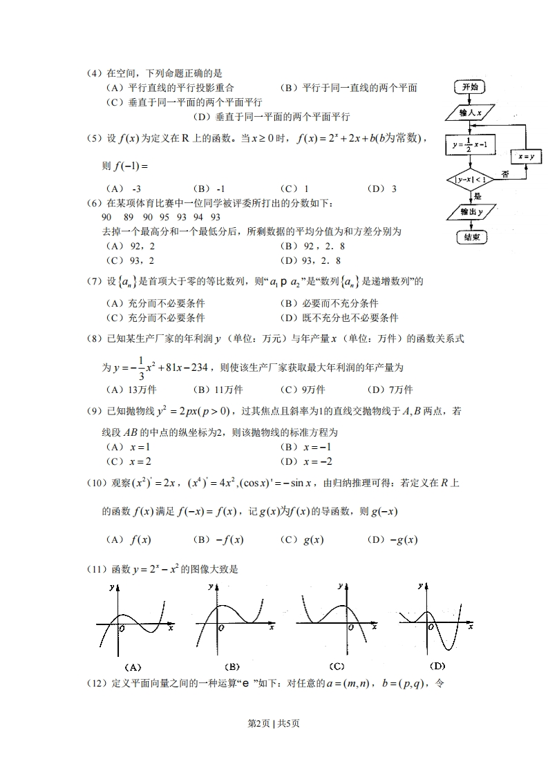 绝密★启用并使用完毕前2010年普通高等学校招生全国统一考试(山东卷)文科数学本试卷分第I卷和第Ⅱ卷两部分,共4页。满分150分。考试用时120分钟。考试结束后,将本试卷和答题卡一并交回。注意事项:1.答卷前,考生务必用0.5毫米黑色墨水签字笔将自己的姓名、座号、准考证号、县区和科类填写在答题卡和试卷规定的位置上。2.第I卷每小题选出答案后,用2B铅笔把答题卡上对应题目的答案标号涂黑:如需改动,用橡皮擦干净后,再选涂其他答案标号。3.第Ⅱ卷必须用0.5毫米黑色签字笔作答,答案必须写在答题卡各题目指定区域内的位置,不能写在试卷上:如需改动,先划掉原来的答案,然后再写上新的答案:不能使用涂改液、胶带纸、修正带。不按以上要求作答的答案无效。4.填空题请直接填写答案,解答题应写出文字说明、证明过程或演算步骤。参考公式:锥体的体积公式:V=二Sh。其中S是锥体的底面积,h是锥体的高。Γ3如果事伯A、B互斥,那么P(A+B)=P(A)+P(B):如果事件A、B独立,那么P(AB)=P(A)·P(B)第1卷(共60分)一、选择题:本大题共12小题,每小题5分,共60分。在每小题给出的四个选项中,只有一项是符合题目要求的。1.已知全集U=R,集合M={x2-4≤0},则⊙M=(A){x22(D){xk≤-2或x22a+2i=b+i(2)己知ia,b∈R),其中i为虚数单位,则a+b=(A)-1(B)1(C)2(D)3(3)f(x)=log2(3*+1)的值域为(A)(0,+0)(B)[0,+o))(C)(1,+o)(D)[1,+o)第1页|共5页(4)在空间,下列命题正确的是(A)平行直线的平行投影重合(B)平行于同一直线的两个平面开始(C)垂直于同一平面的两个平面平行(D)垂直于同一平面的两个平面平行(5)设f(x)为定义在R上的函数。当x≥0时,f(x)=2+2x+b(b为常数),则f(-1)=y-xl(A)-3(B)-1(C)1(D)3(6)在某项体育比赛中一位同学被评委所打出的分数如下:90899095939493输出y去掉一个最高分和一个最低分后,所剩数据的平均分值为和方差分别为结柬(A)92,2(B)92,2.8(C)93,2(D)93,2.8(7)设{an}是首项大于零的等比数列,则“apa2”是“数列{an}是递增数列的(A)充分而不必要条件(B)必要而不充分条件(C)充分而不必要条件(D)既不充分也不必要条件(8)己知某生产厂家的年利润y(单位:万元)与年产量x(单位:万件)的函数关系式为y=-x2+81x-234,则使该生产厂家获取最大年利润的年产量为(A)13万件(B)11万件(C)9万件(D)7万件(9)己知抛物线y2=2px(p>0),过其焦点且斜率为1的直线交抛物线于A,B两点,若线段AB的中点的纵坐标为2,则该抛物线的标准方程为(A)X=1(B)x=-1(C)x=2(D)x=-2(10)观察(x2)=2x,(x)=4x2,(cosx)'=-sinx,由归纳推理可得:若定义在R上的函数f(x)满足f(-x)=f(x),记g(x)为f(x)的导函数,则g(-x)(A)f(x)(B)-f(x)(C)g(x)(D)-g(x)(11)函数y=2-x2的图像大致是术小(C)(D)(12)定义平面向量之间的一种运算“e”如下:对任意的a=(m,n),b=(p,q),令第2页|共5页aeb=mg-p.下面说法错误的是(A)若a与b共线,则aeb=0(B)ae b=be a(c)对任意的元∈R,有(a)eb=aeb)(D)(ae b)2+(a.b)2 =la第川卷(共90分)二、填空题:本大题共4小题,每小题4分,共16分(13)执行右图所示流程框图,若输入x=4,则输出y的值为(14)已知(x,y∈R),且满足X+上=1,则y的最大值为34(15)在△4BC中,角A、B、C所对的边分别为a、b、c.若a=V2,b=2,sinB+cosB=√2,则角A的大小为(16)已知圆C过点(L,0),且圆心在x轴的正半轴上,直线y=x-1被该圆所截得的弦长为2√互,则圆C的标准方程为三、解答题:本题共6小题,共74分。(17)(本小题满分12分)己知函数f(x)=sin(π-ox)coS@x+cos2ox(o>0)的最小正周期为π.(I)求0的值.(Ⅲ)将函数y=f(x)的图像上各点的横坐标缩短到原来的2,纵坐标不变,得到函数y=g(x)的图像,求函数g(x)在区间上的最小值。16(18)(本小题满分12分)已知等差数列{an}满足:4=7,a+a,=26.{an}的前n项和为Sn.(I)求an及Sn:第3页|共5页