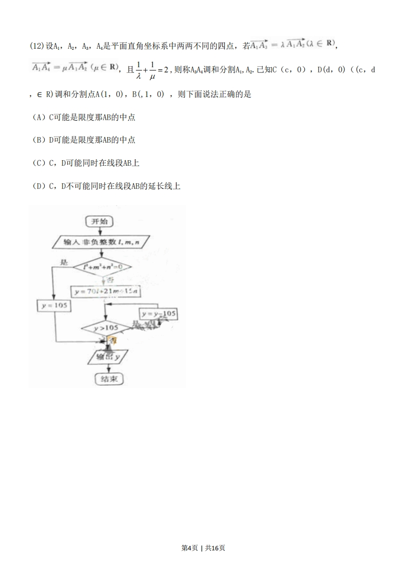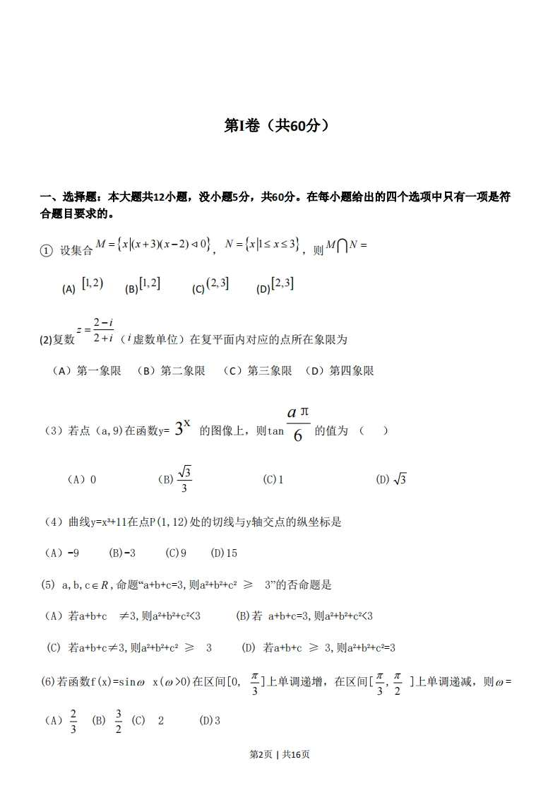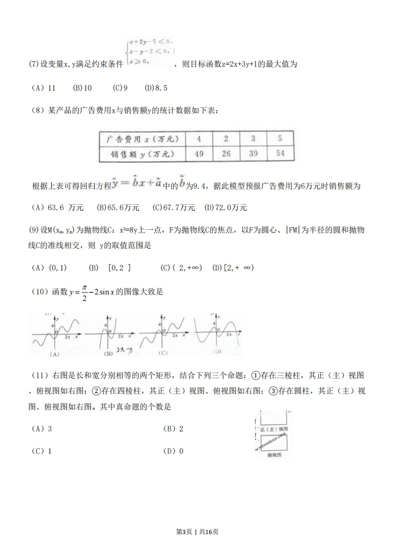 2011年普通高等学校招全国统一考试(山东卷)文科数学本卷分第I卷和第Ⅱ卷两部分,共4页。满分150分。考试用时120分钟。考试结束后,将本试卷与答题卡一并交回。注意事项:1.答题前,考生务必用0.5毫米的签字笔将自己的姓名、座号、准考证号、县区和科类填写在自己的答题卡和试卷规定的位置上。2.第I卷每小题选出答案后,用2B铅笔把答题卡上对应题目的答案标号涂黑;如需改动,用橡皮擦干净后,再选涂其他答案标号。答案不能打在试卷上。3.第Ⅱ卷必须用0.5毫米黑色签字笔作答,答案必须写在答题卡各题目指定区域内相应的位置,不能写在试卷上;如需改动,先划掉原来的答案,然后再写上新的答案;不能使用涂改液、胶带纸、修正带。不按以上要求最大的答案无效。4,第卷第六题为选做题,考生须从所给(一)(二)两题中任选一题作答,不能全选。参考公式:柱体的体积公式:v=sh,其中s是柱体的底面积,h是柱体的高。圆柱的侧面积公式:s=cl,其中c是圆柱的底面周长,1是圆柱体的母线长。球的体积公式:Vx心,共中R是球的半径。球的表面积公式:s=4πR,其中R是球的半径2xy-n.y用最小二乘法求线性回归方程系数公式:b=a=y-bx2x2-m如果事件A,B互斥,那么P(A+B)=P(A)+P(B).第1页1共16页第1卷(共60分)一、选择题:本大题共12小题,没小题5分,共60分。在每小题给出的四个选项中只有一项是符合题目要求的。O设集合M={xx+3Xx-2)a0,N={≤x≤列,则M∩N=AL2)B,2g(2习o2,3]2(2)复数2+1(1虚数单位)在复平面内对应的点所在象限为(A)第一象限(B)第二象限(C)第三象限(D)第四象限aπ(3)若点(a,9)在函数y-3X的图像上,则tan6的值为()(A)0(B)(C)1(D)53(4)曲线y=x+11在点P(1,12)处的切线与y轴交点的纵坐标是(A)-9(B)-3(C)9(D)15(⑤)a,b,c∈R,命题“a+b+c=3,则a2+b2+c2≥3”的否命题是(A)若a+b+c≠3,则a2+b2+c2<3(B)若a+b+c=3,则a2+b2+c2<3(C)若a+b+c≠3,则a2+b2+c2≥3(D)若a+b+c≥3,则a2+b2+c2=3(6)若函数6=sin0x(o>0在区间[0,等]上单调递增,在区间[写号]止单调递减,则a-(B)2(D)3第2页1共16页x+2y-5≤0,x-y-2≤0,(7)设变量x,y满足约束条件x≥0,,则目标函数2=2x+3y+1的最大值为(A)11(B)10(C)9(D)8.5(8)某产品的广告费用x与销售额y的统计数据如下表:广告费用x(万元)4235销售颜y(万元)】49263954根据上表可得回归方程=bx+à中的b为9.4,据此模型预报广告费用为6万元时销售额为(A)63.6万元(B)65.6万元(C)67.7万元(D)72.0万元(9)设M(xo,yo)为抛物线C:x2=8y上一点,F为抛物线C的焦点,以F为圆心、IFM为半径的圆和抛物线C的准线相交,则y的取值范围是(A)(0,1)(B)[0,2](C)(2,+∞)(D)[2,+∞)(10)函数y=花-2sinx的图像大致是2B(11)右图是长和宽分别相等的两个矩形,结合下列三个命题:①存在三棱柱,其正(主)视图、俯视图如右图:②存在四棱柱,其正(主)视图、俯视图如右图:③存在圆柱,其正(主)视图、俯视图如右图。其中真命题的个数是(A)3(B)2正(主)视周(C)1(D)0俯视图第3页1共16页